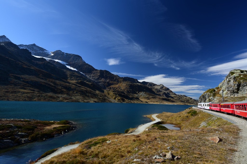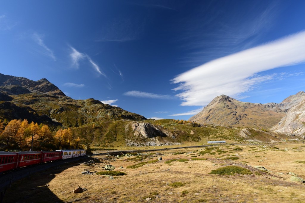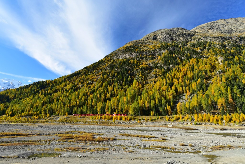 รถไฟสายท่องเที่ยวที่แล่นจาก St.Moritz ไปยังเมือง Tirano ประเทศอิตาลี มีความสวยงามเป็นเศษในช่วงฤดูใบไม้ร่วง ราวปลายเดือนตุลาคม