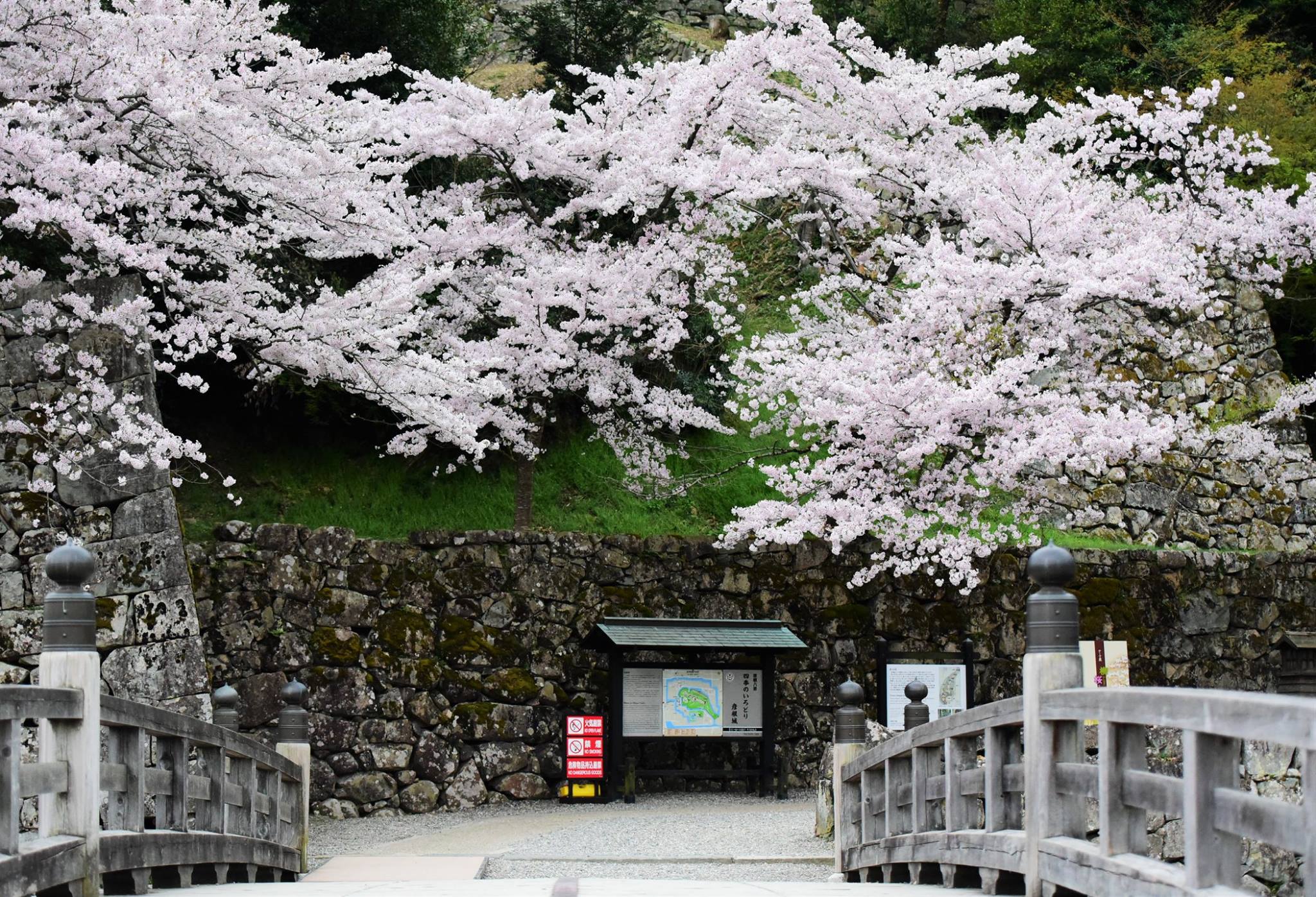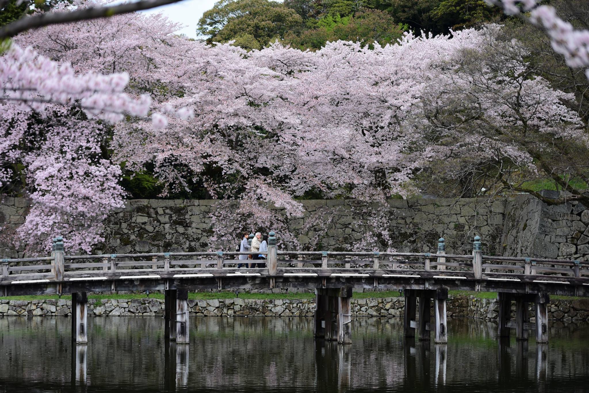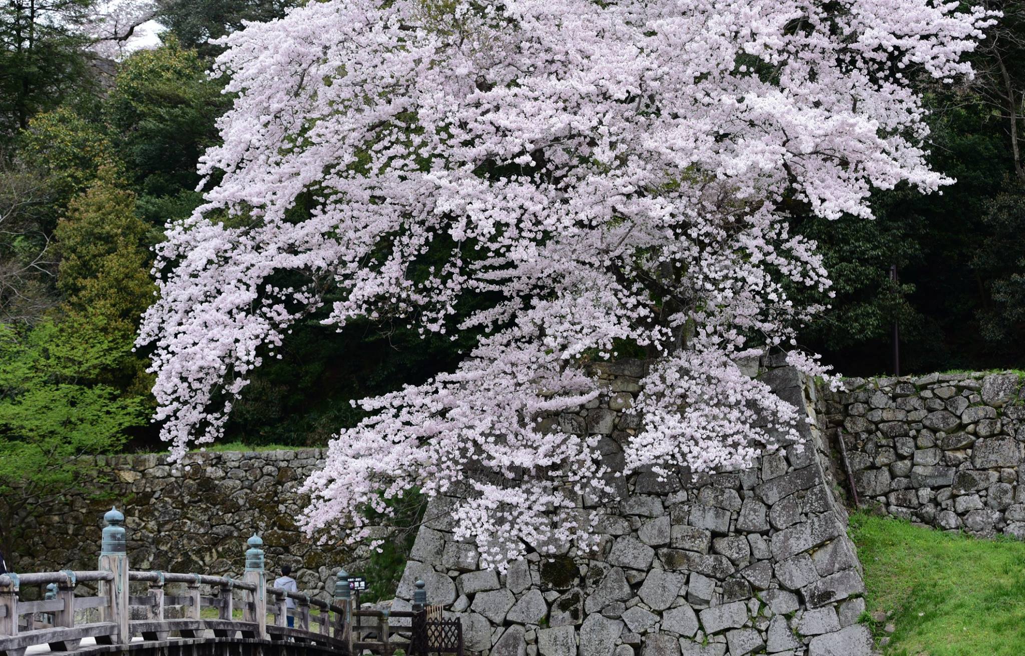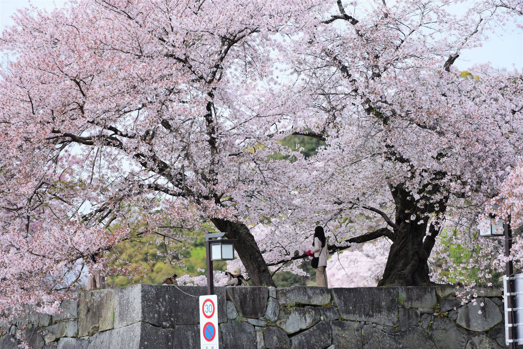 มองขึ้นไปบันกำแพงปราสาทชั้นนอก ต้นซากุระสูงใหญ่ยืนตระหง่าน เชื้อเชิญให้ผู้คนหลั่งไหลเข้าไปชมความงามภายใน