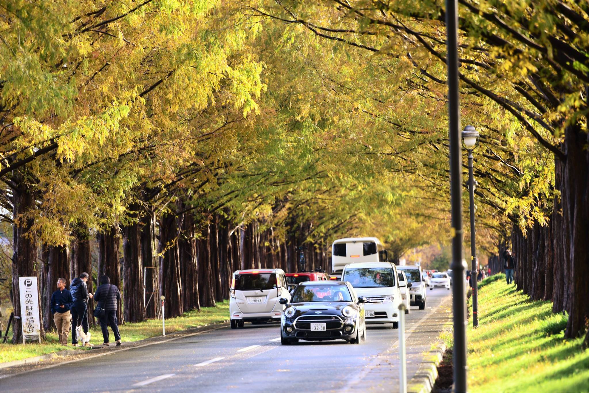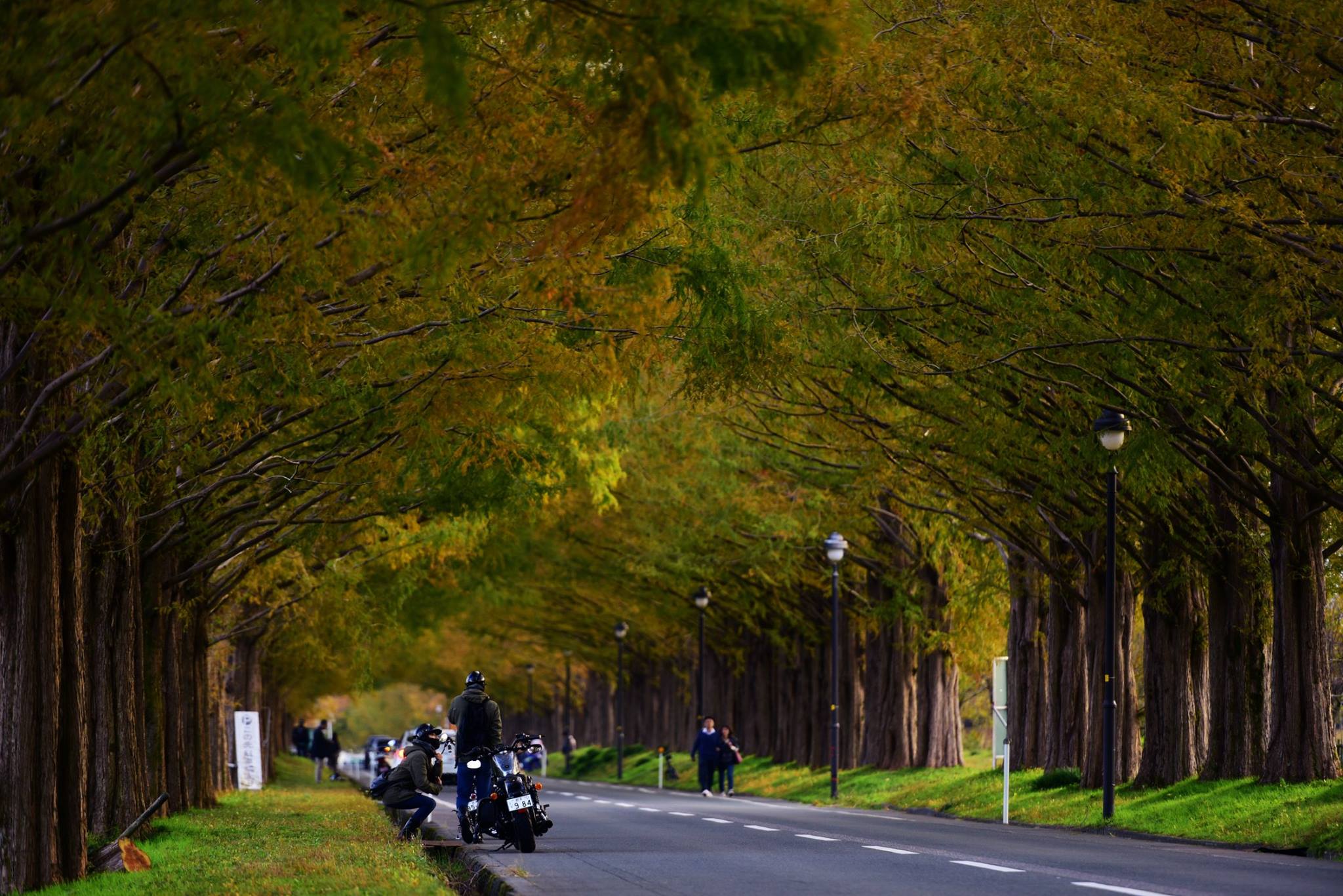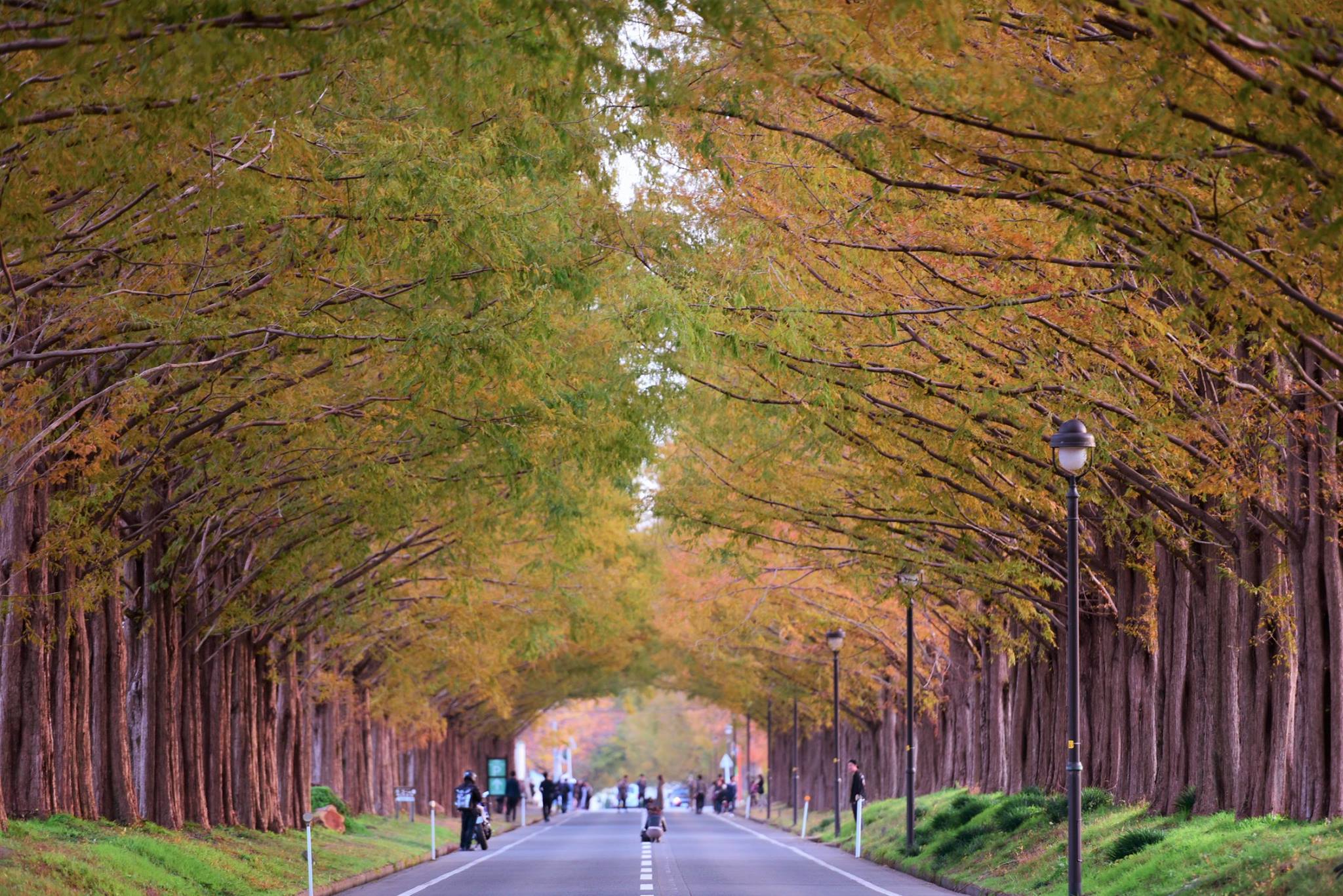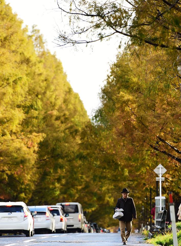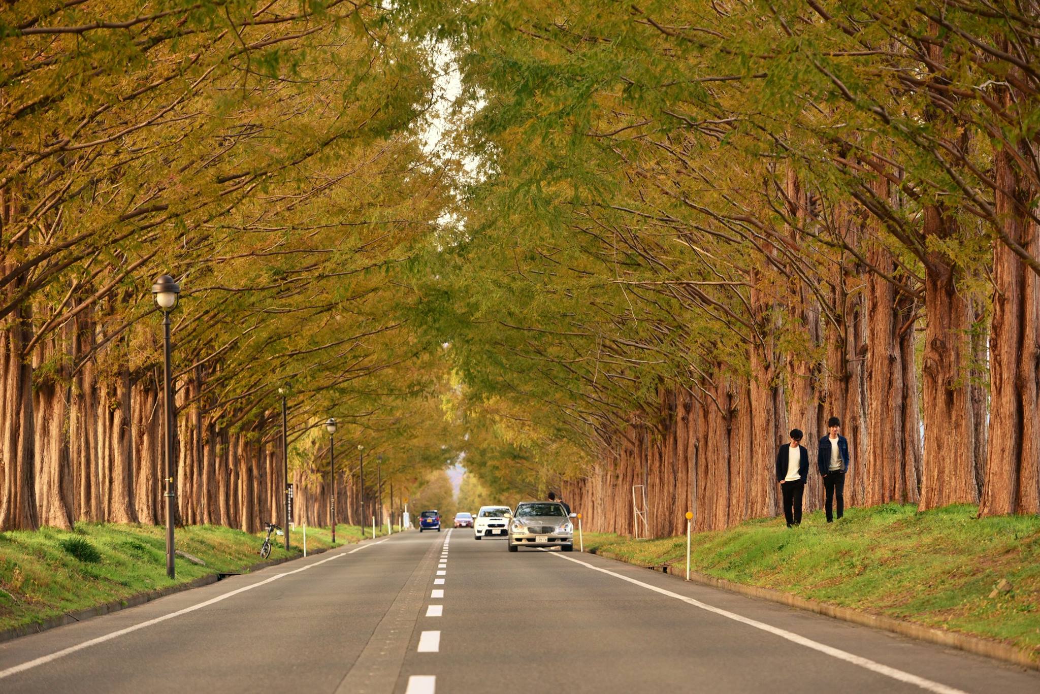 บนถนนที่ทอดยาว สองข้างทางเรียงรายด้วย Metasequoia ซึ่งเป็นต้นสนชนิดหนึ่ง ยามฤดูใบไม้ร่วง ใบของมันจะเปลี่ยนเป็นสีส้ม (ต่างจากสีเหลืองของ Gingko ) เปล่งสีสันสวยงามโอบล้อมถนนเส้นทางยาวสองกิโลเมตร