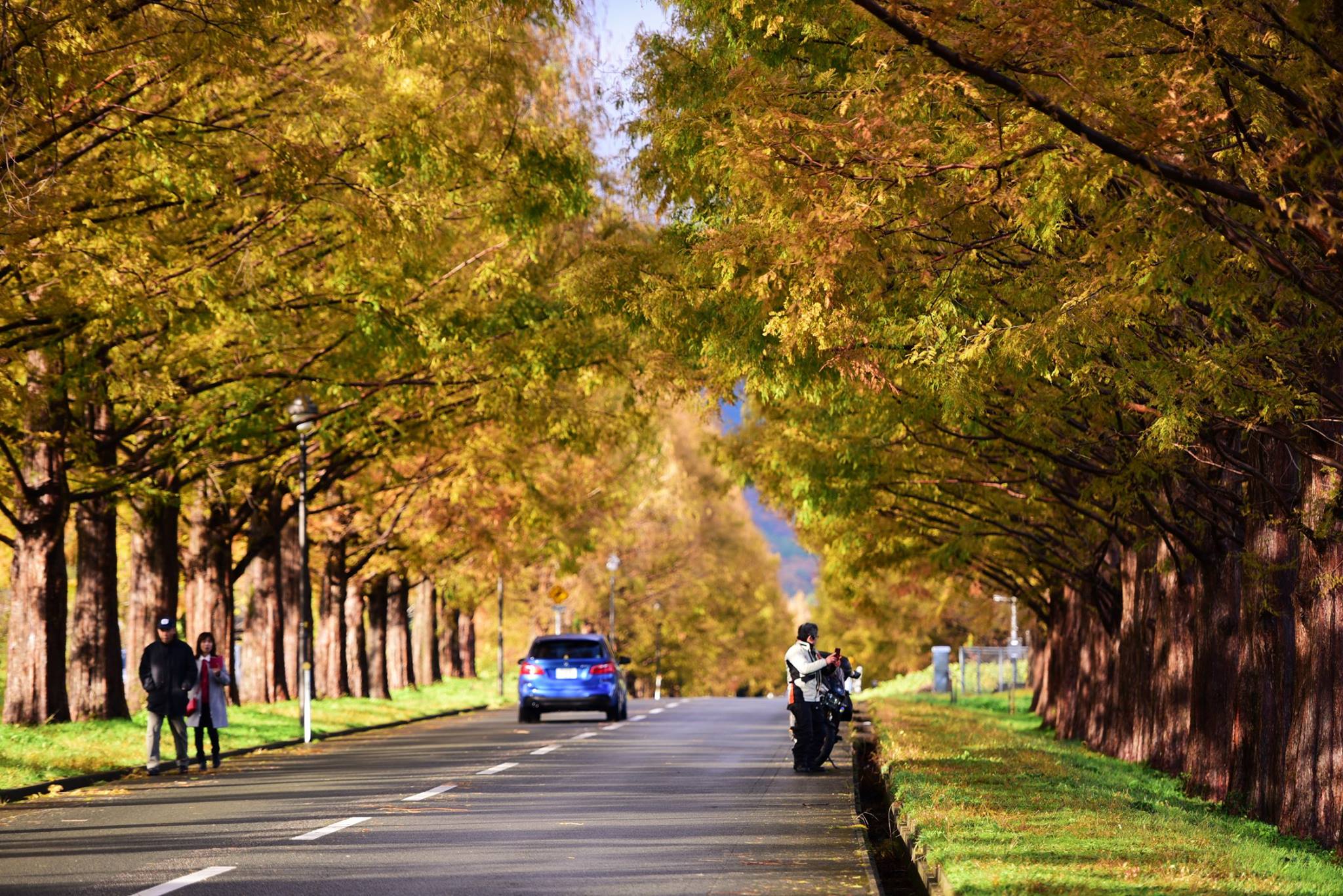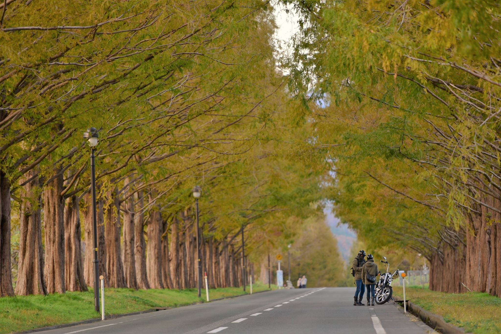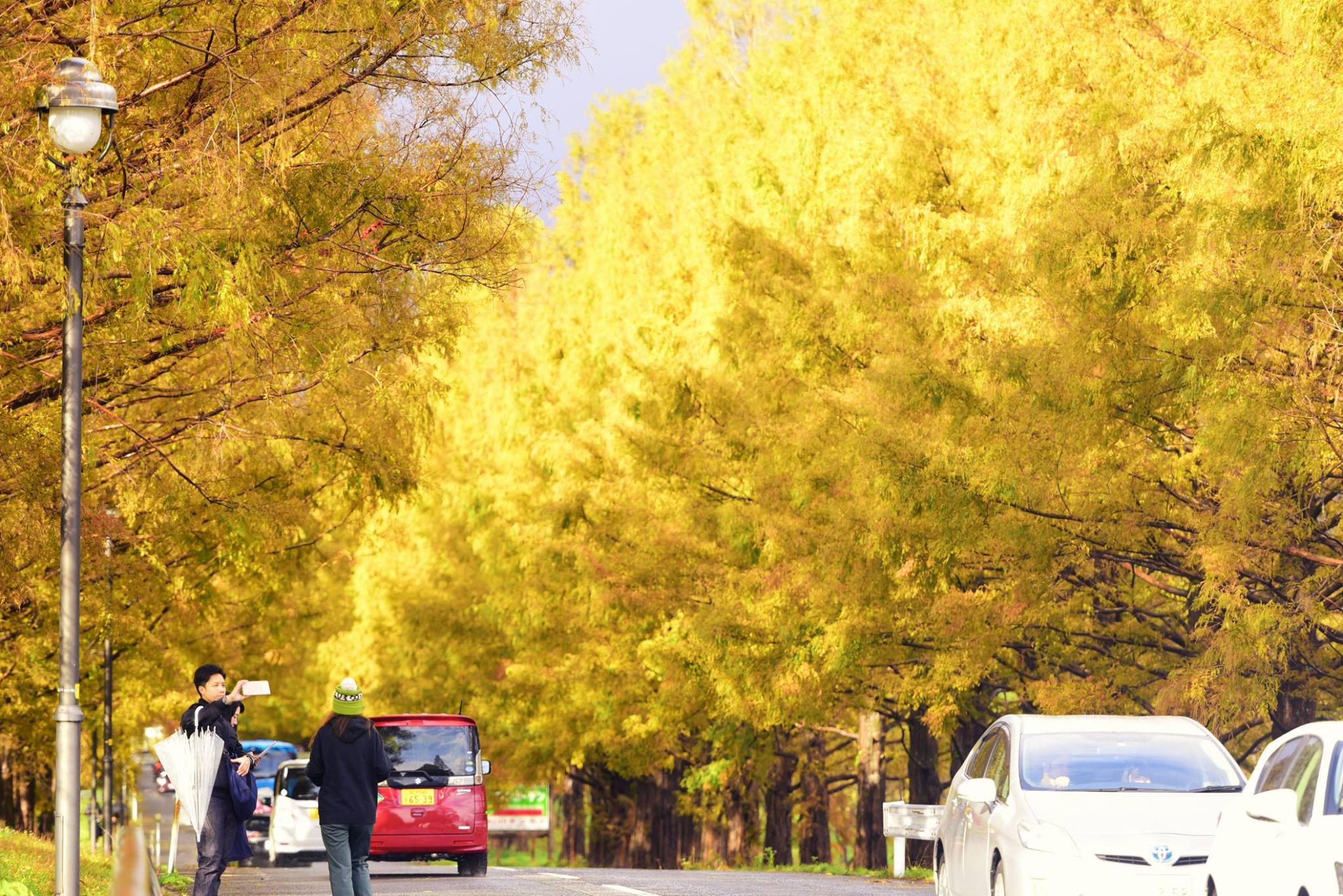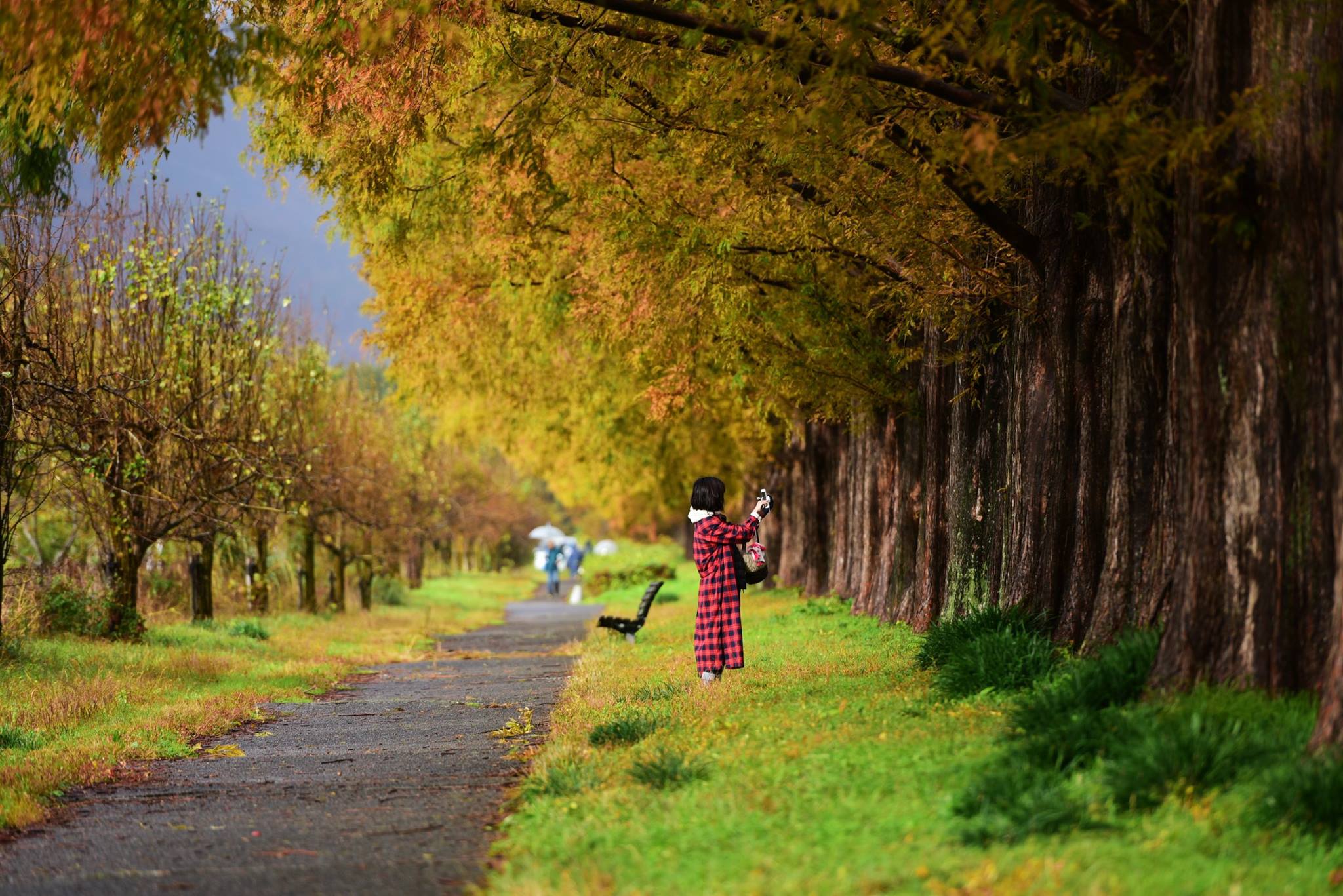 บนถนนที่ทอดยาว สองข้างทางเรียงรายด้วย Metasequoia ซึ่งเป็นต้นสนชนิดหนึ่ง ยามฤดูใบไม้ร่วง ใบของมันจะเปลี่ยนเป็นสีส้ม (ต่างจากสีเหลืองของ Gingko ) เปล่งสีสันสวยงามโอบล้อมถนนเส้นทางยาวสองกิโลเมตร