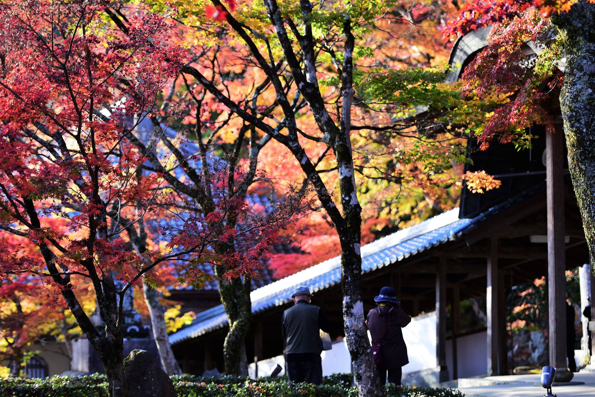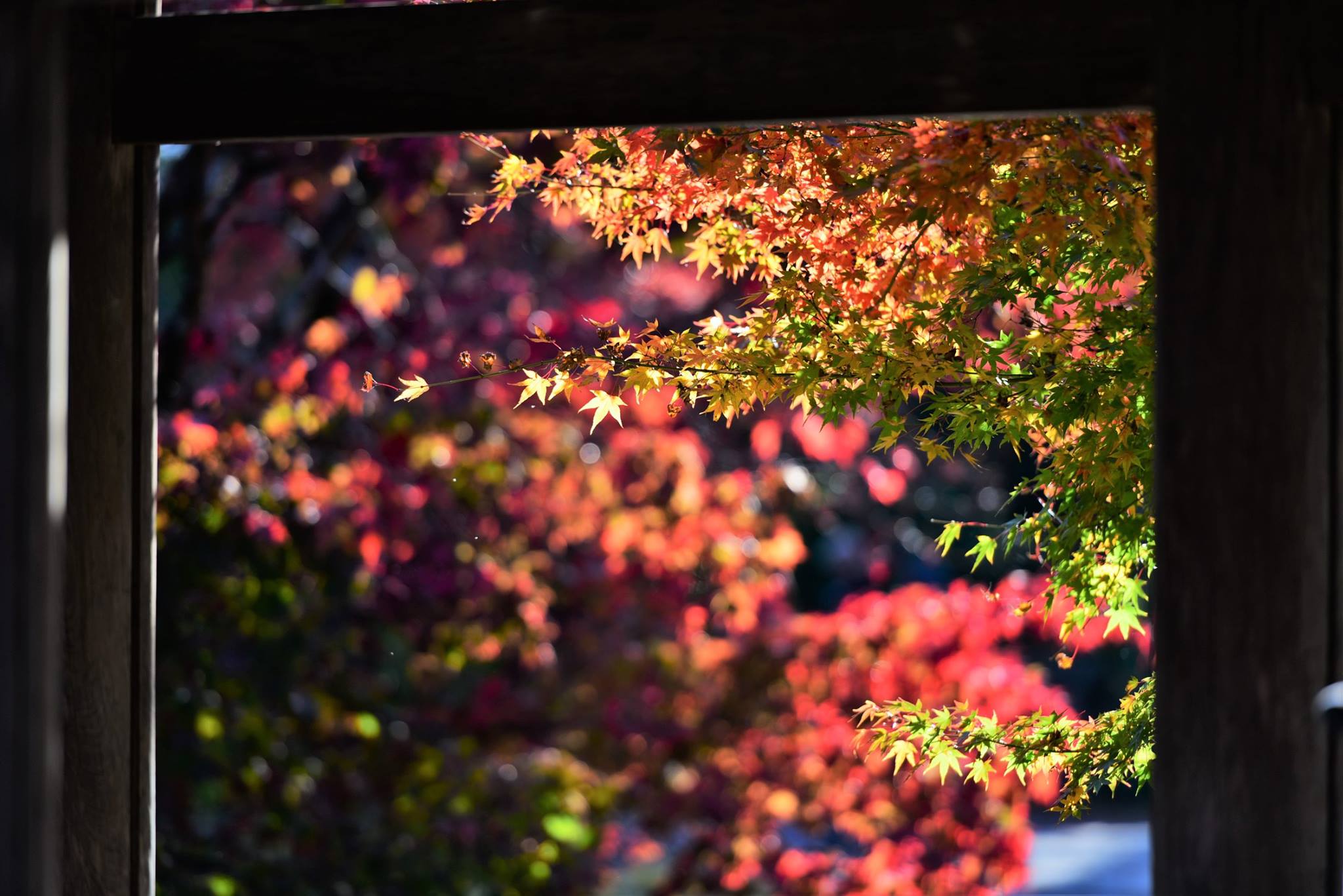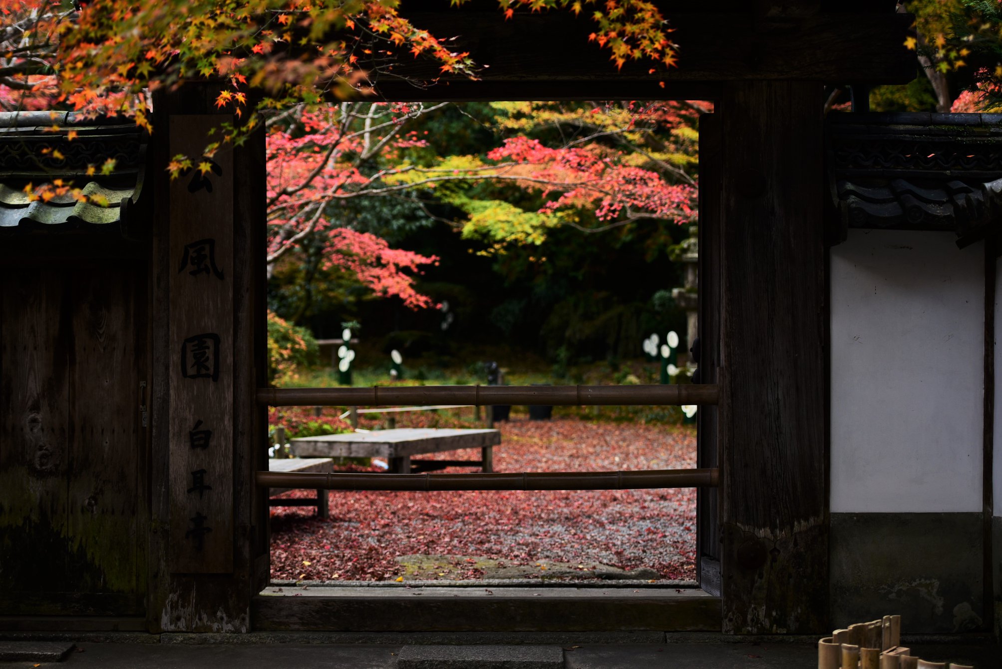 จากภาพคือทางเดินเข้าวัด ซุ้มทางขวามือเป็นที่ขายบัตรเข้าชมวัด จะเห็นว่าทางเดินเข้าไปนั้นปกคลุมด้วยอุโมงค์สีแดงสดใสมากในช่วงเวลาพีคของใบไม้เปลี่ยนสี