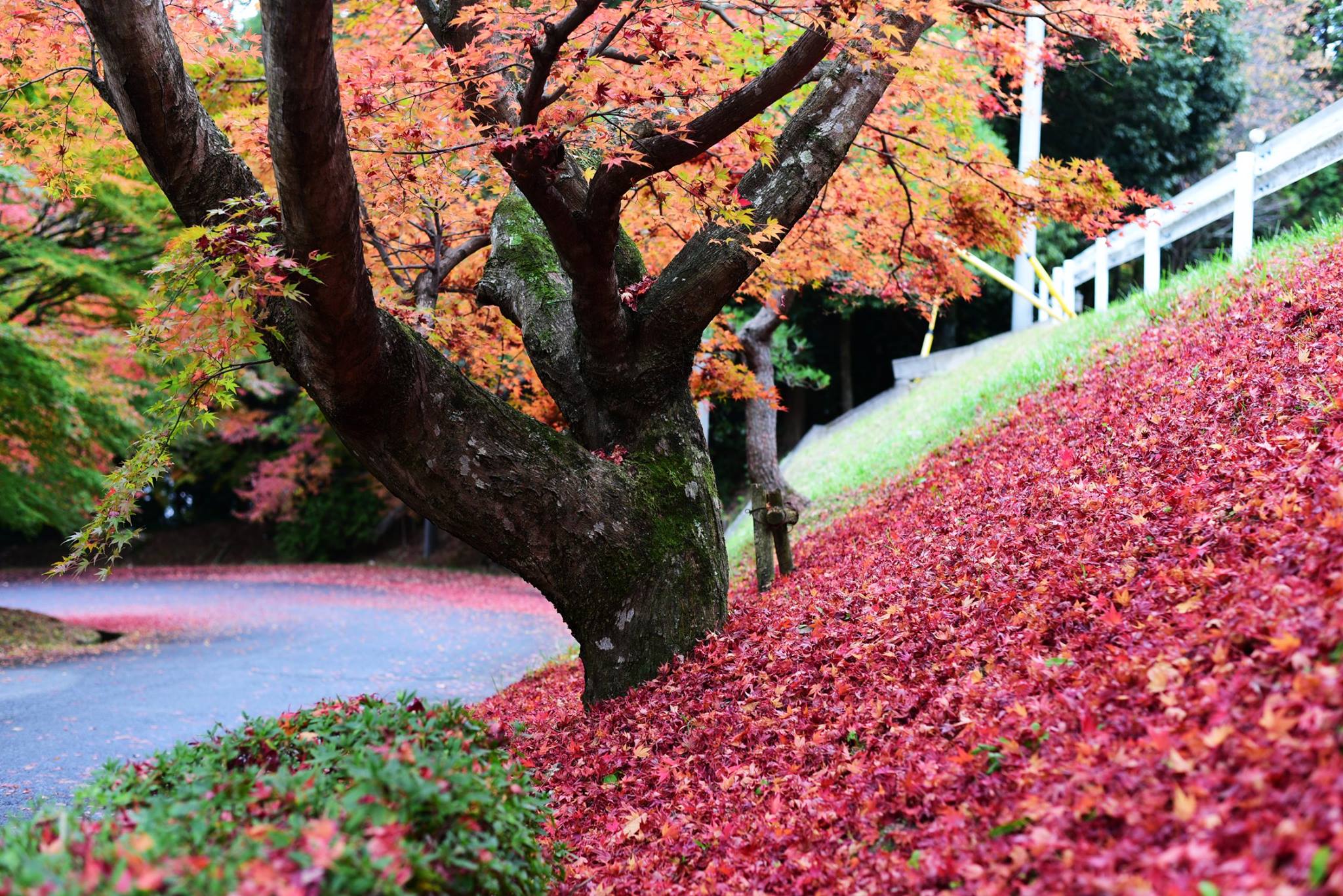บริเวณริมถนนทางเข้าวัด ใบไม้สีแดงจัดได้ร่วงลงมากองเต็มพื้นที่ใต้ต้น