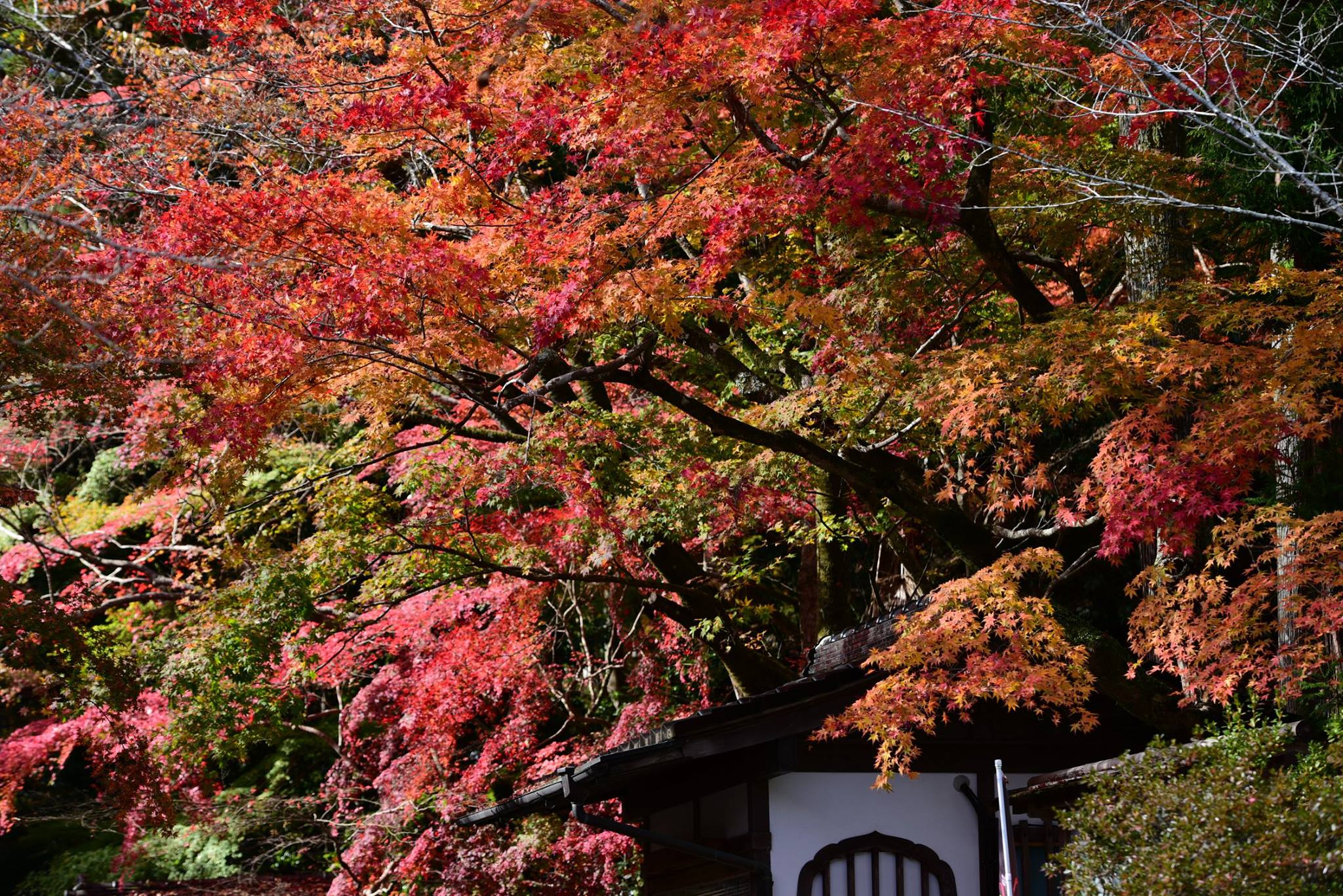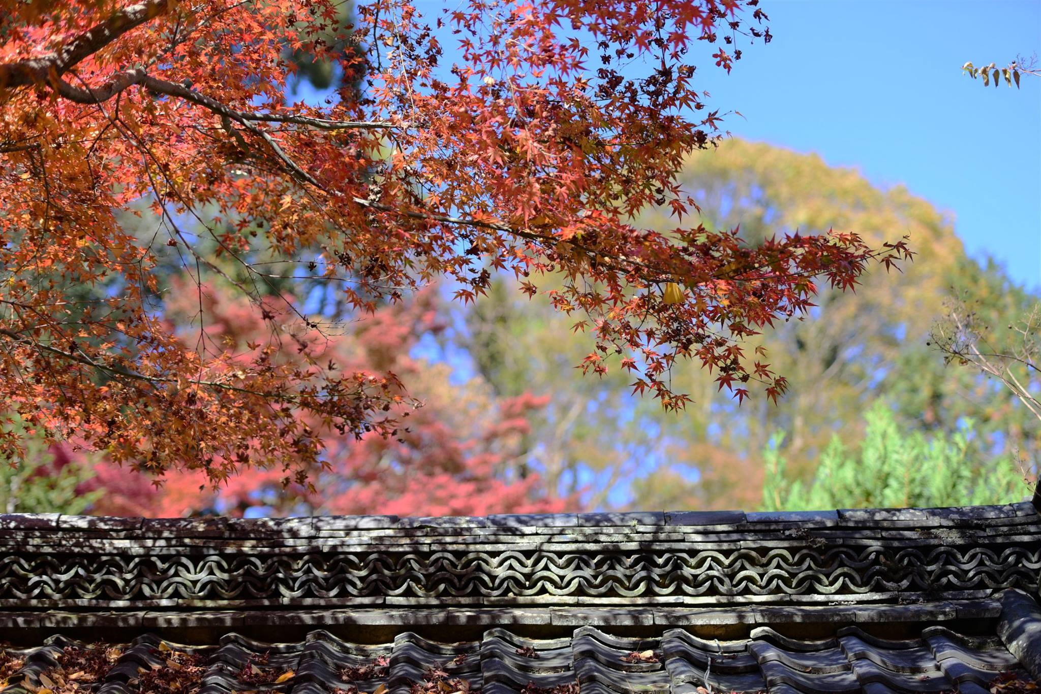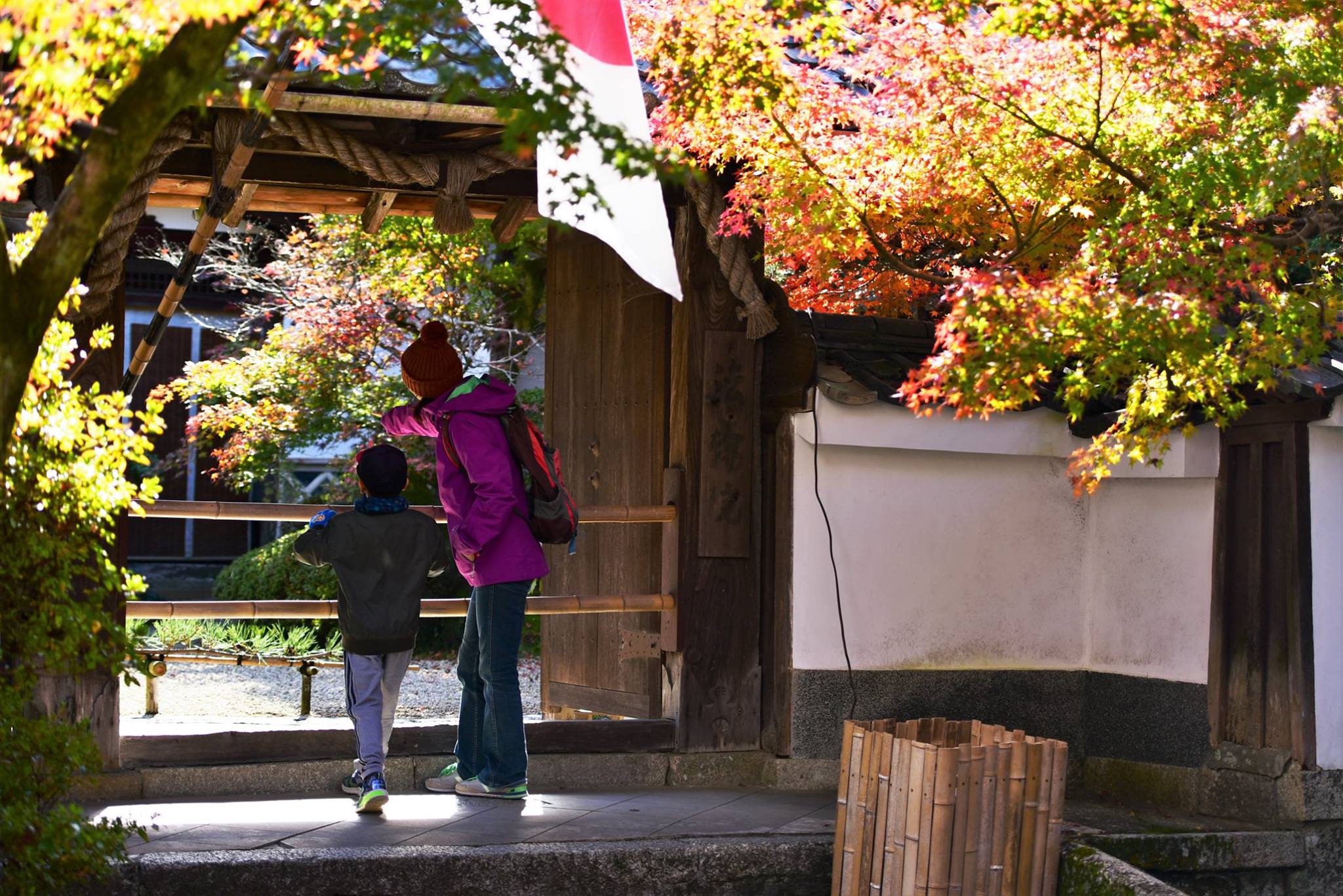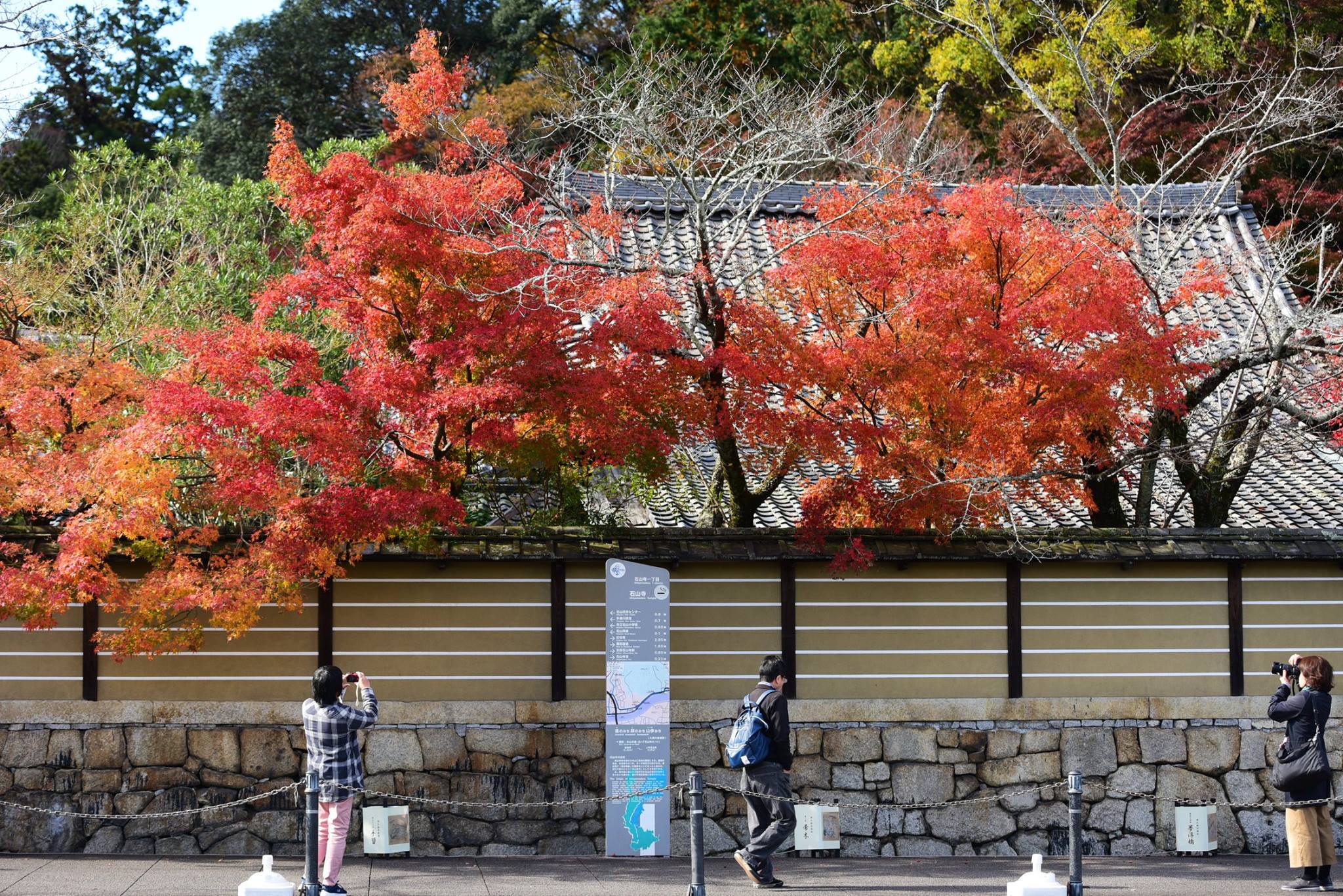 มองผ่านกำแพงเข้าไป ด้านในเห็นใบไม้กำลังพีคสวยเต็มที่