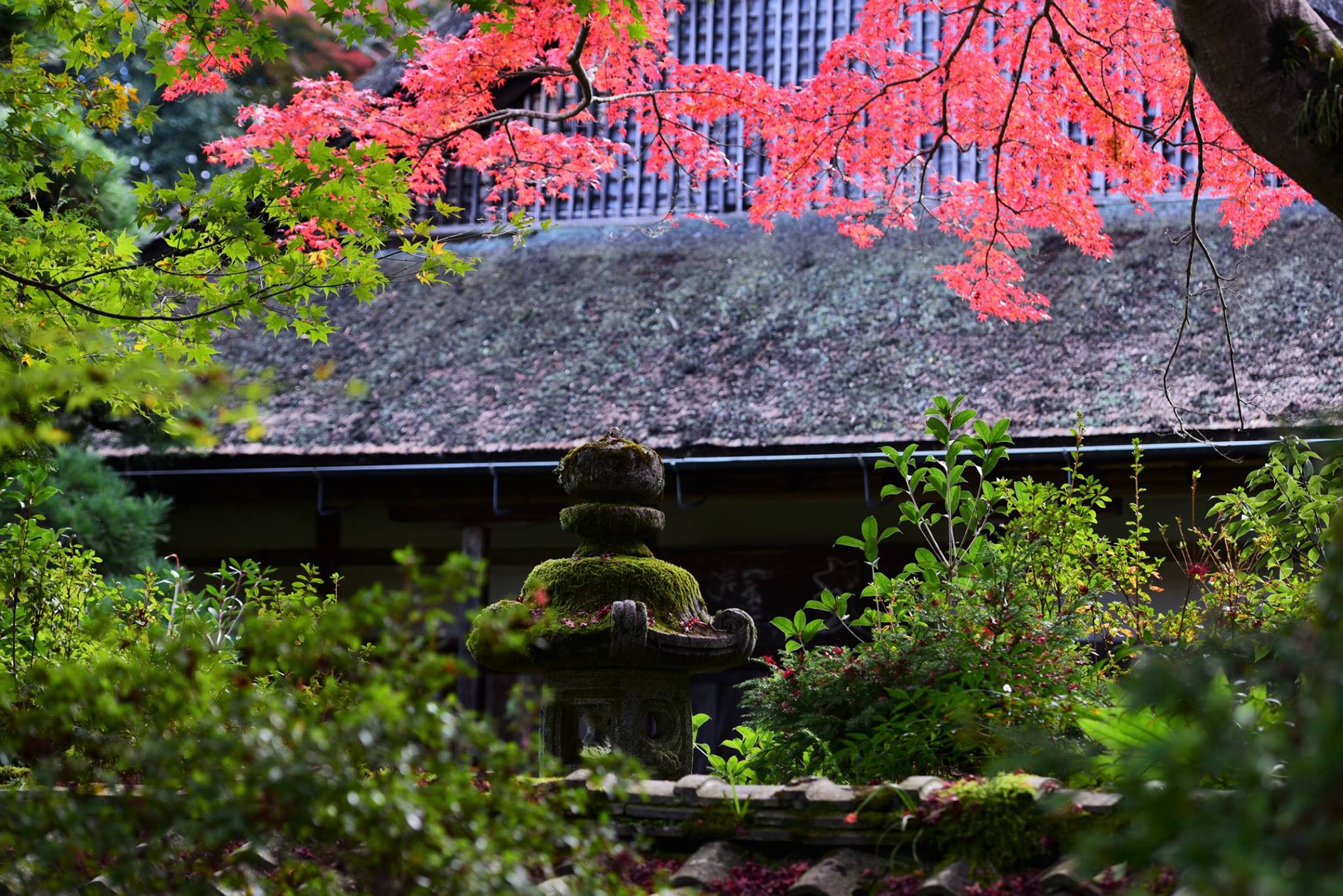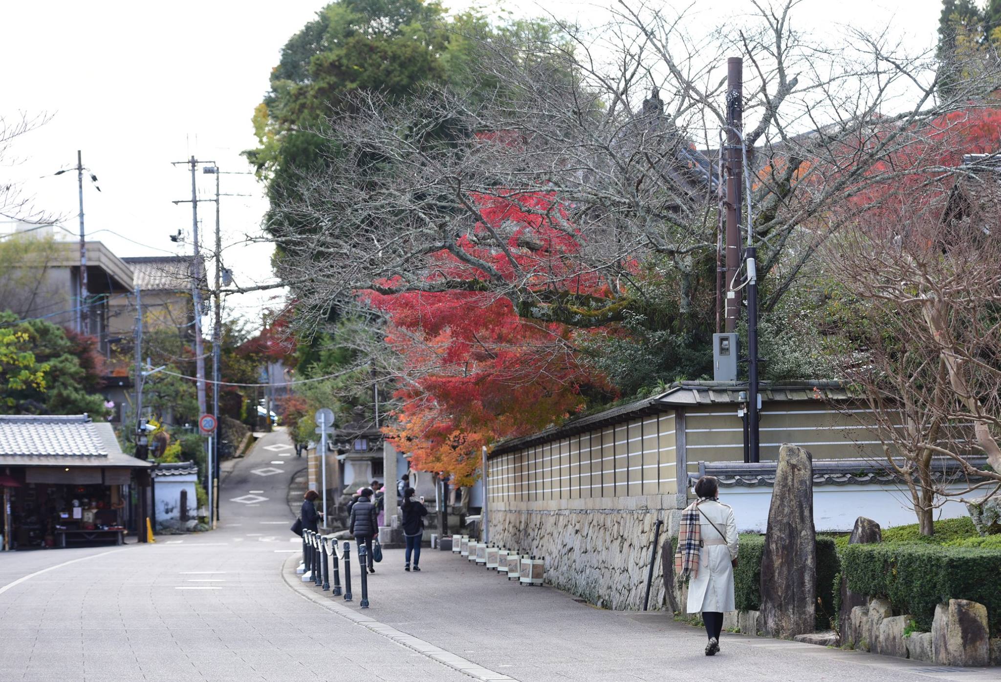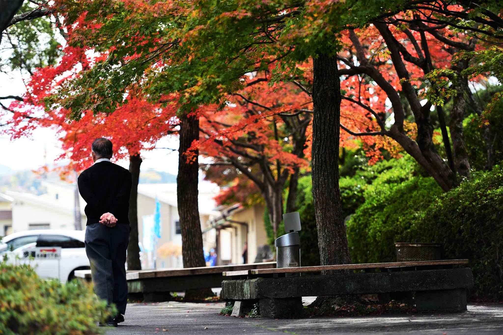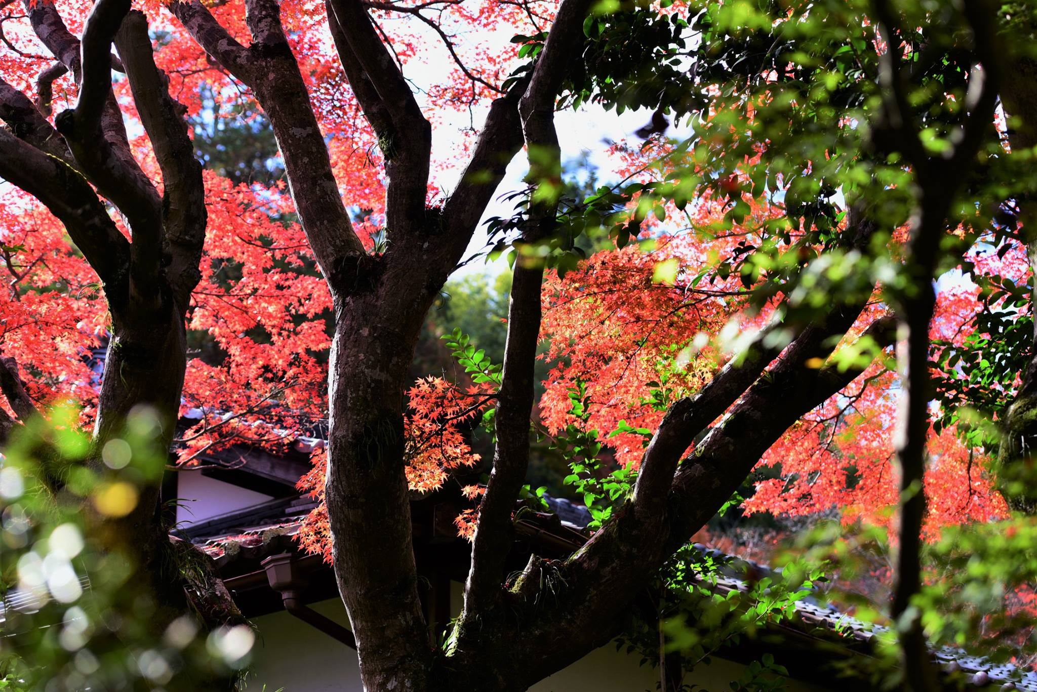 มองผ่านกำแพงเข้าไป ด้านในเห็นใบไม้กำลังพีคสวยเต็มที่