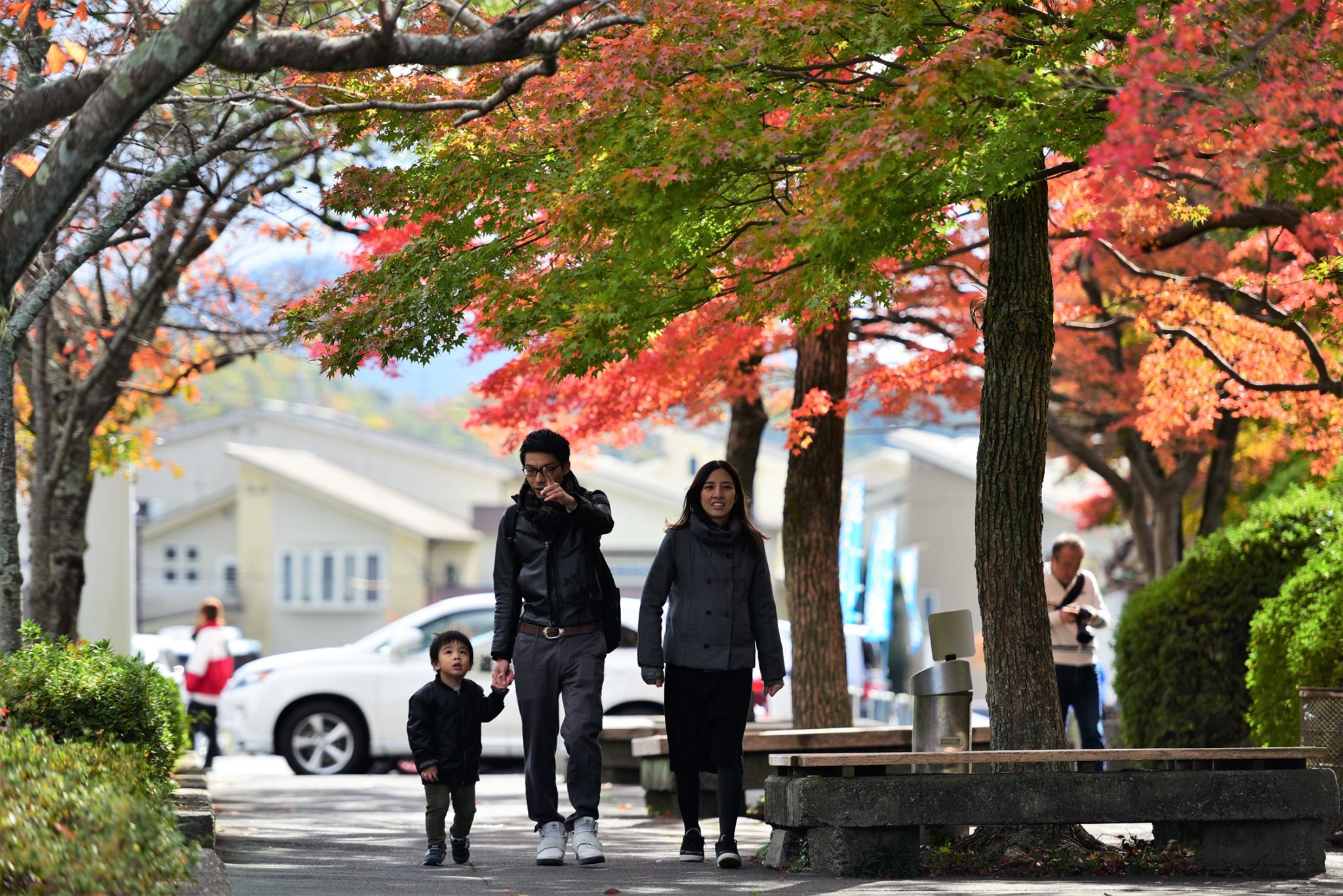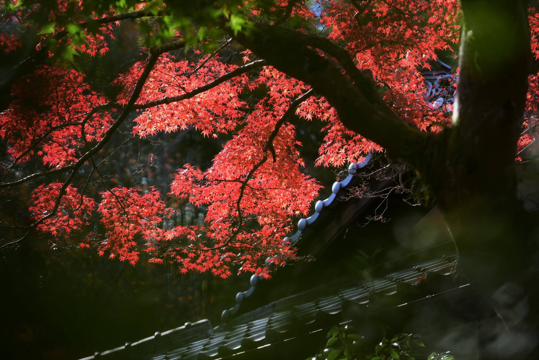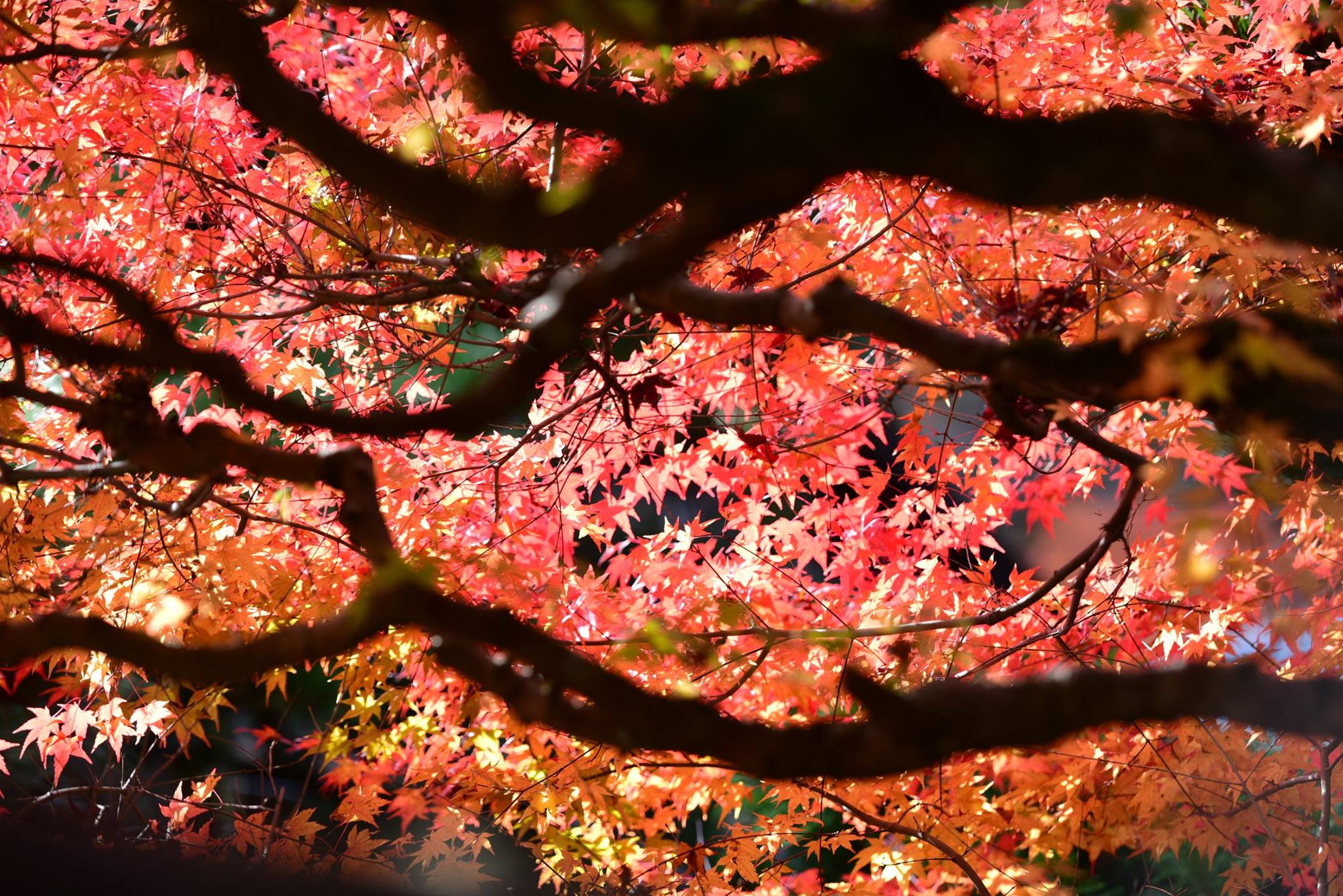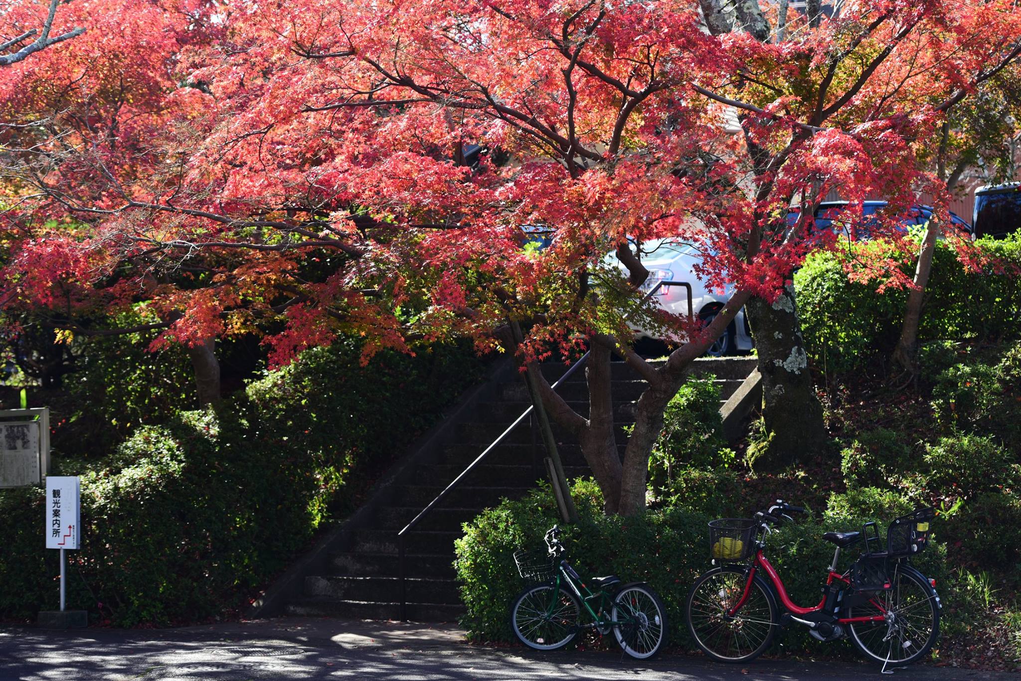 มองผ่านกำแพงเข้าไป ด้านในเห็นใบไม้กำลังพีคสวยเต็มที่