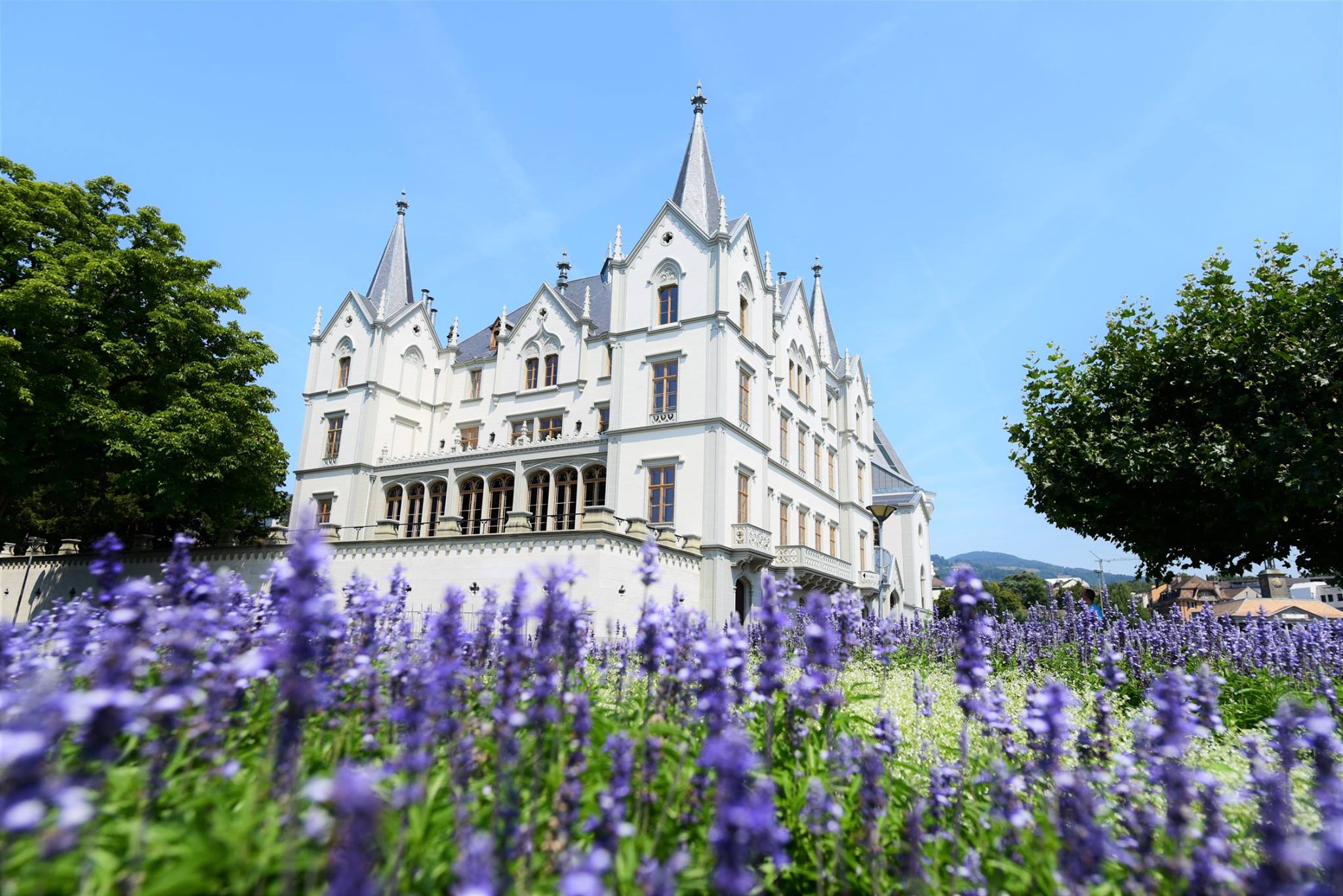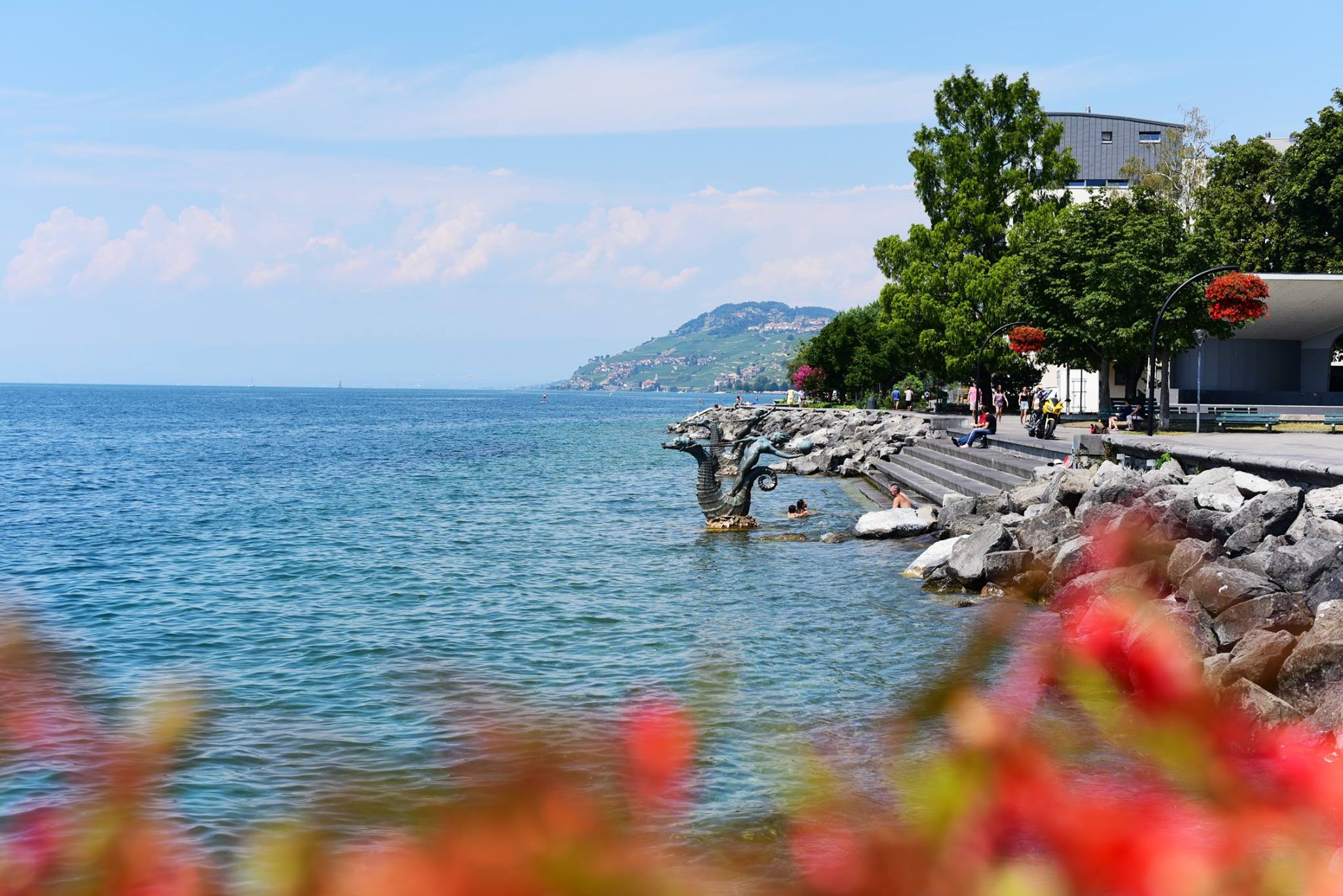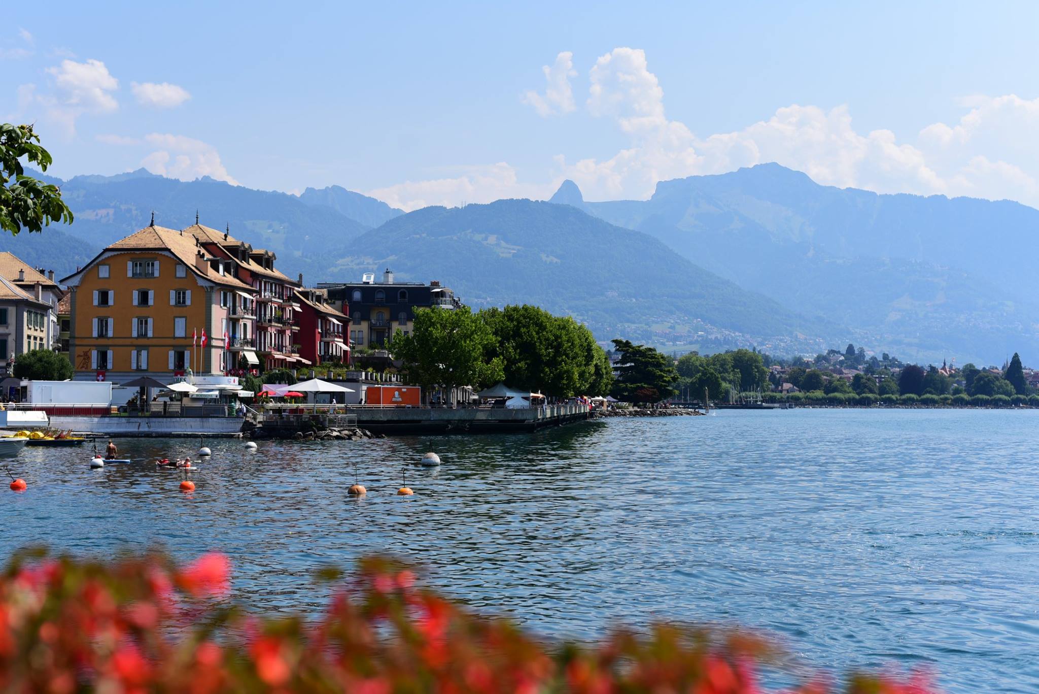สวนดอกไม้ที่อยู่ตรงท่าเรือ Vevey รับลมร้อนอยู่ที่ริมทะเลสาบ
