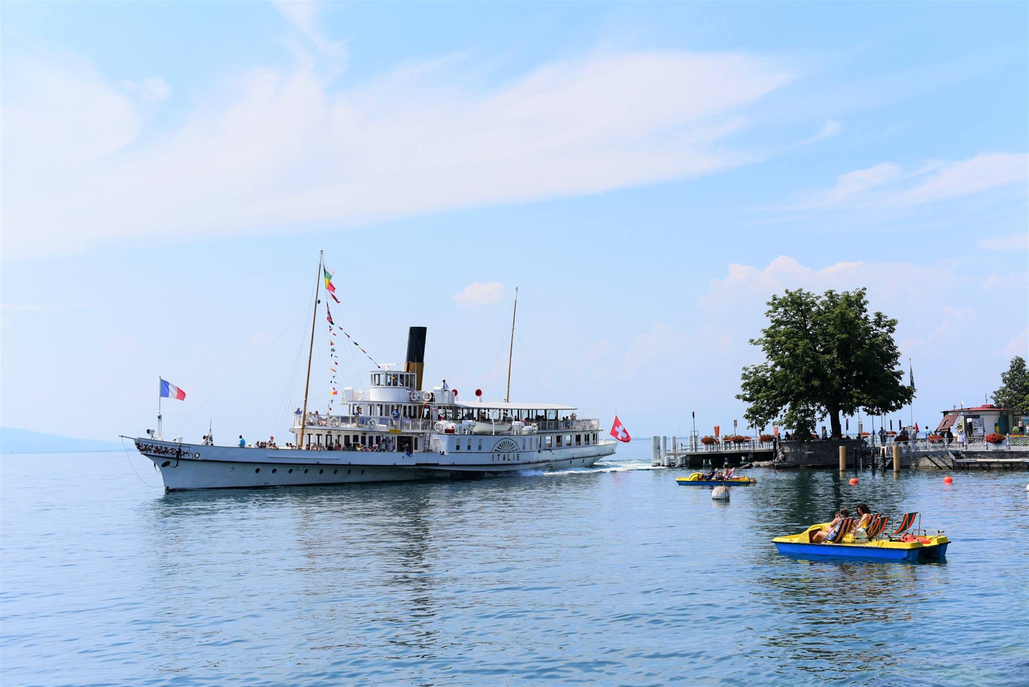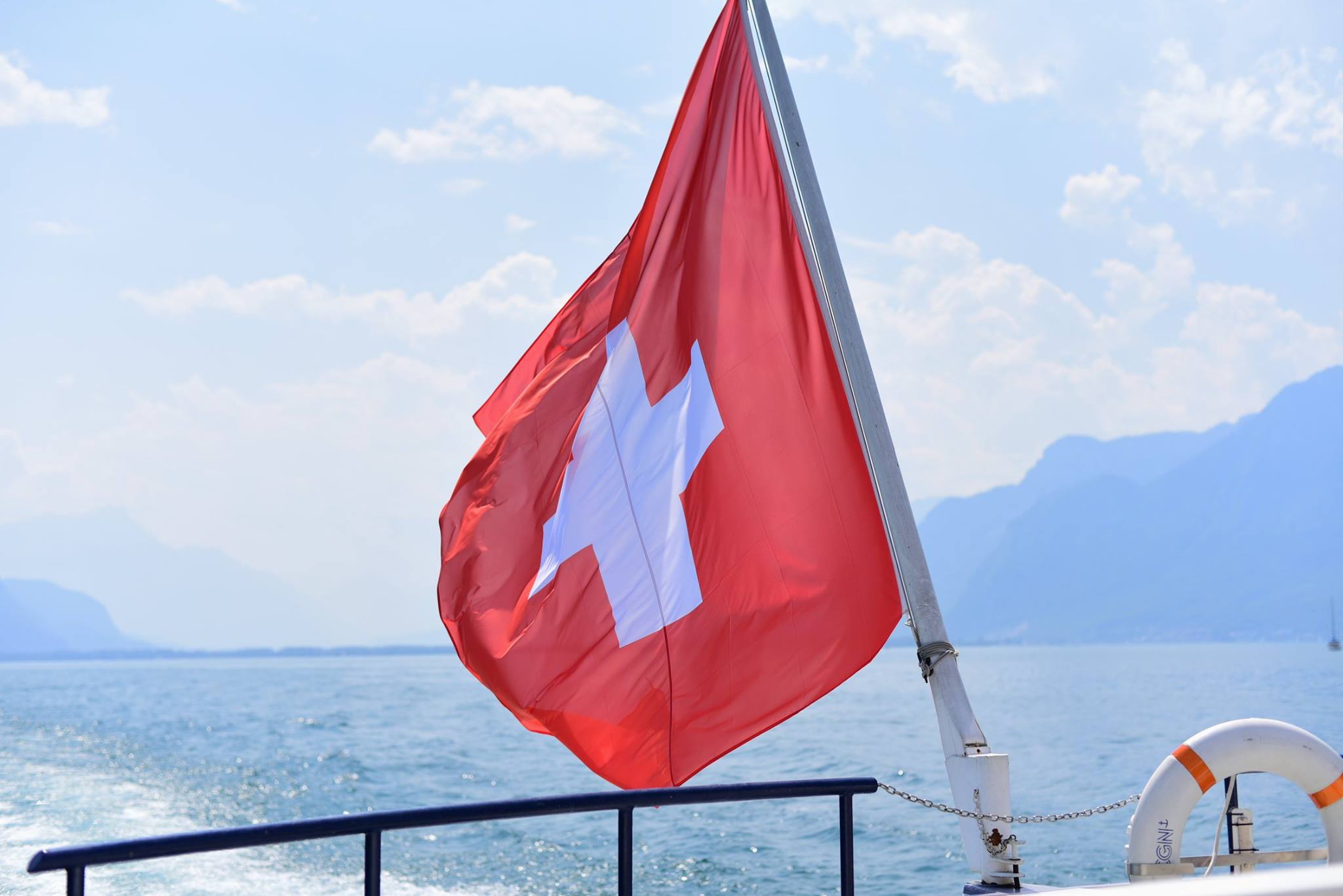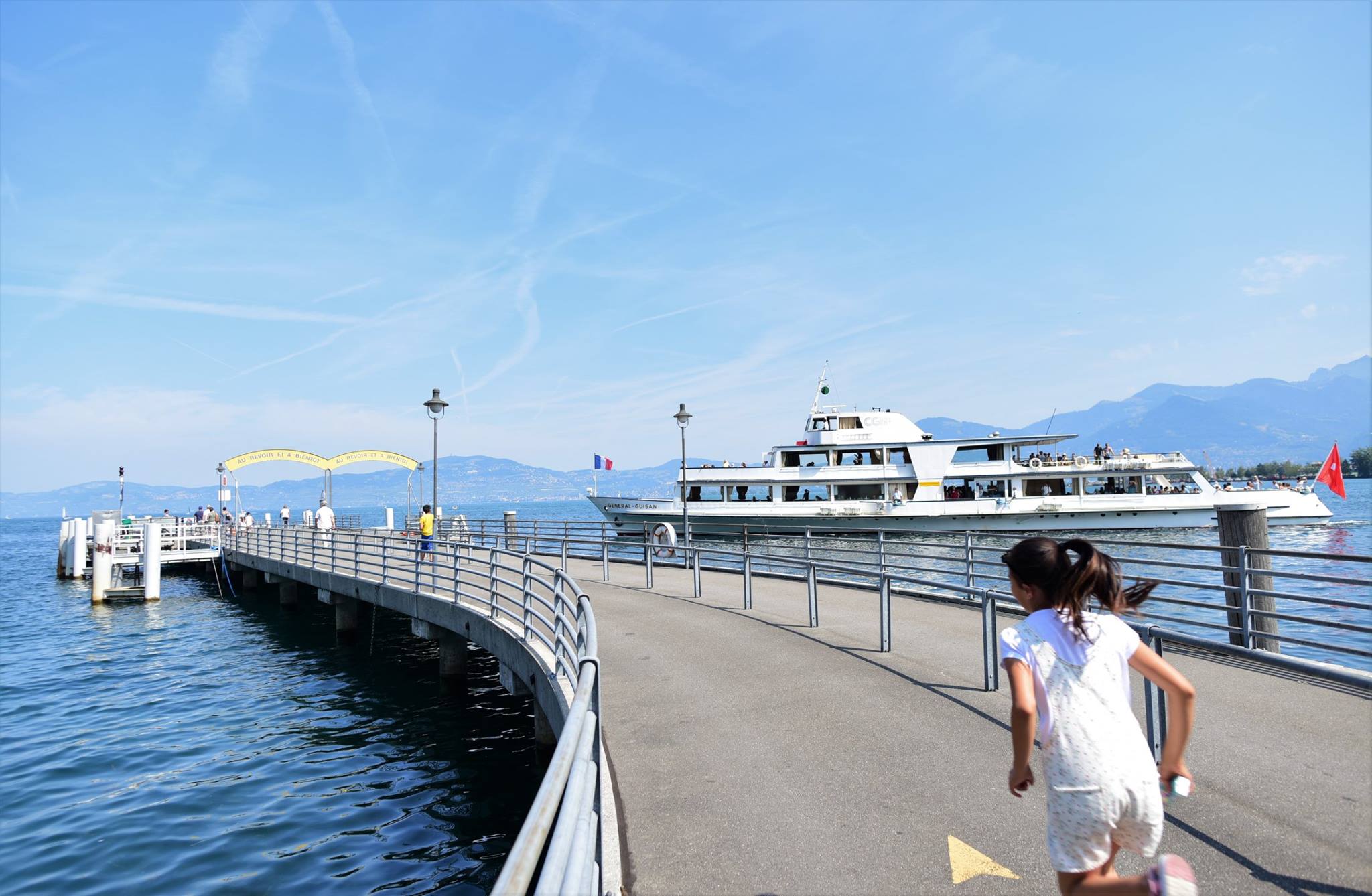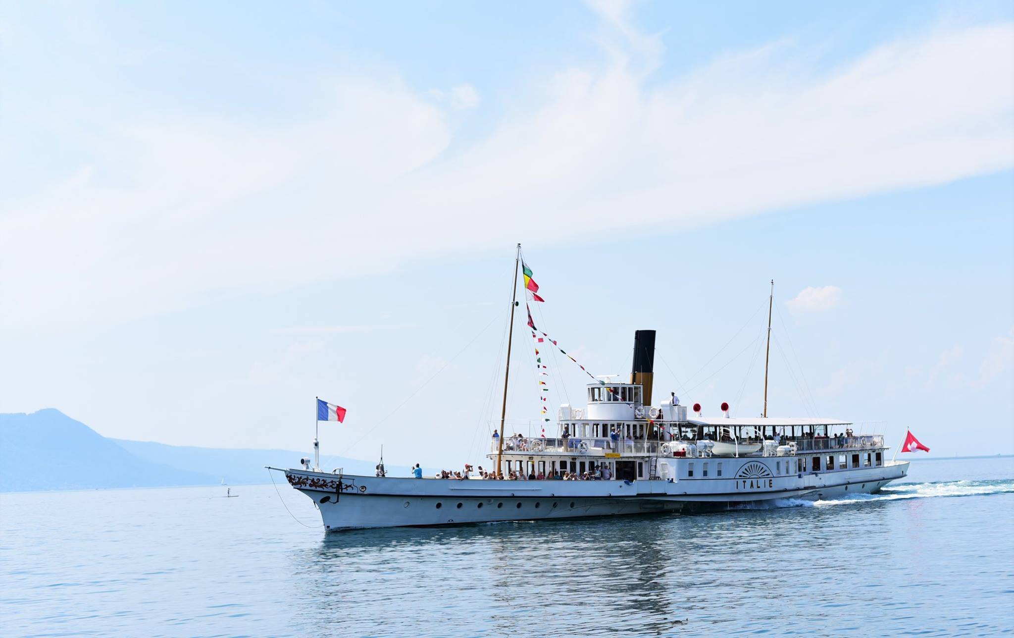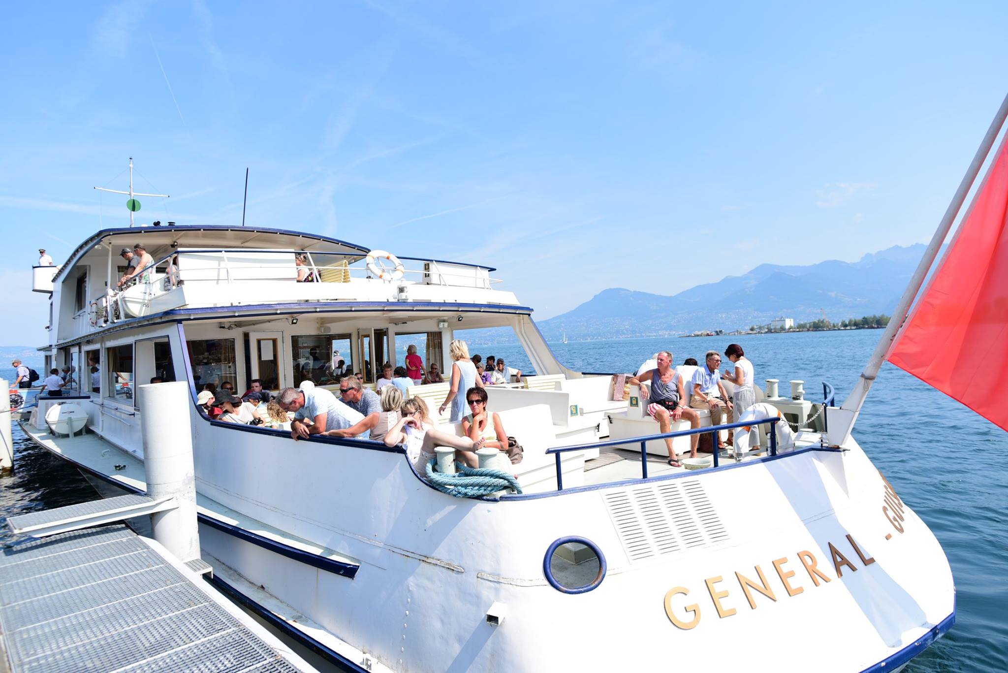 เกือบจะไม่ทันเรือ เห็นเป็นเรือท่องเที่ยวดูเหมือนแล่นเรื่อยๆเอ่ยๆ แต่ความจริง เรือแล่นเร็วมากนะครับ พอๆกับรถยนต์เลยทีเดียว ……….ที่ด้านหัวเรือเป็นธงชาติฝรั่งเศส ส่วนท้ายเรือมีธงสวิส