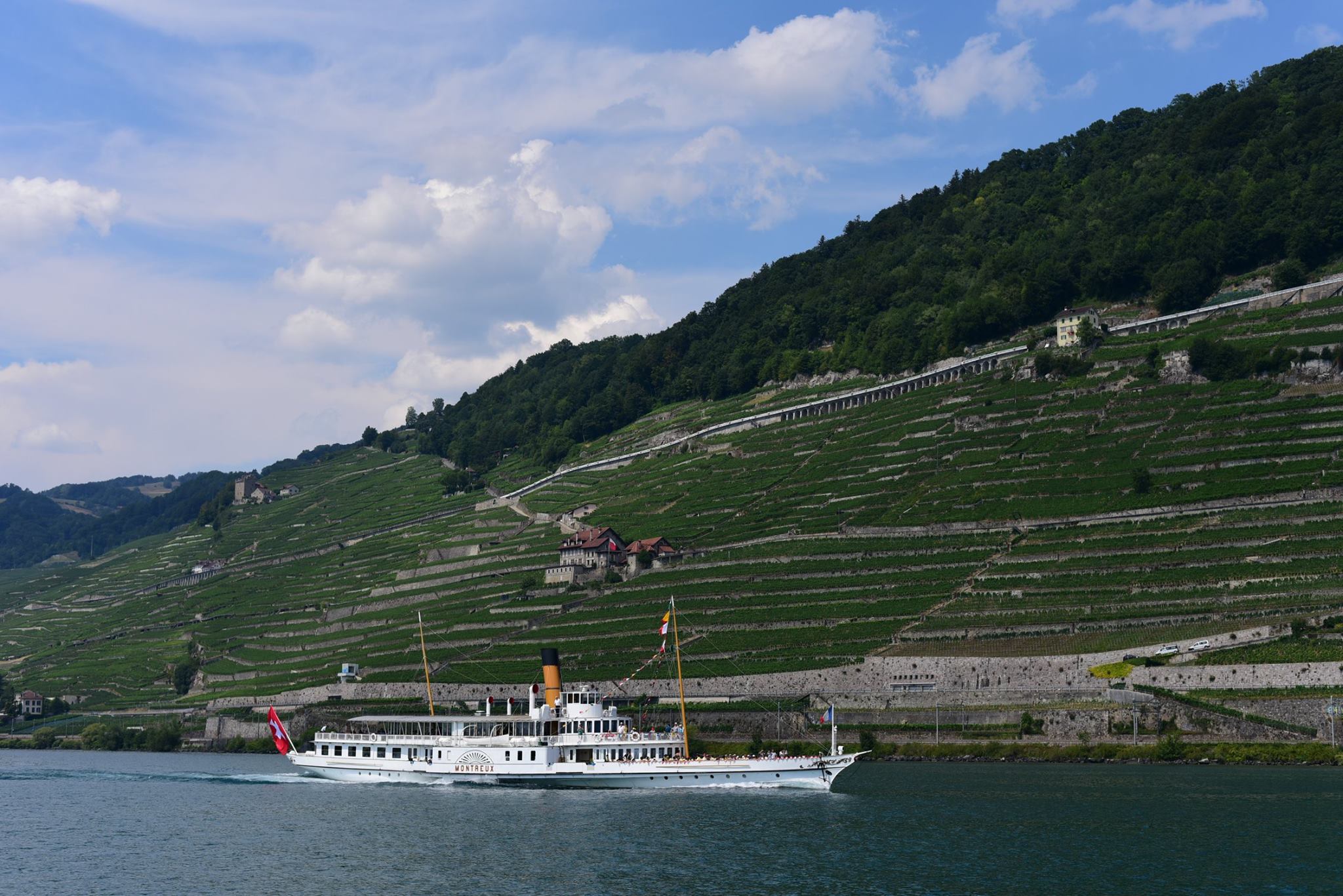 เรือที่แล่นสวนมาจากทาง Lausanne เว้นระยะห่างพอให้โบกมือทักทายกัน