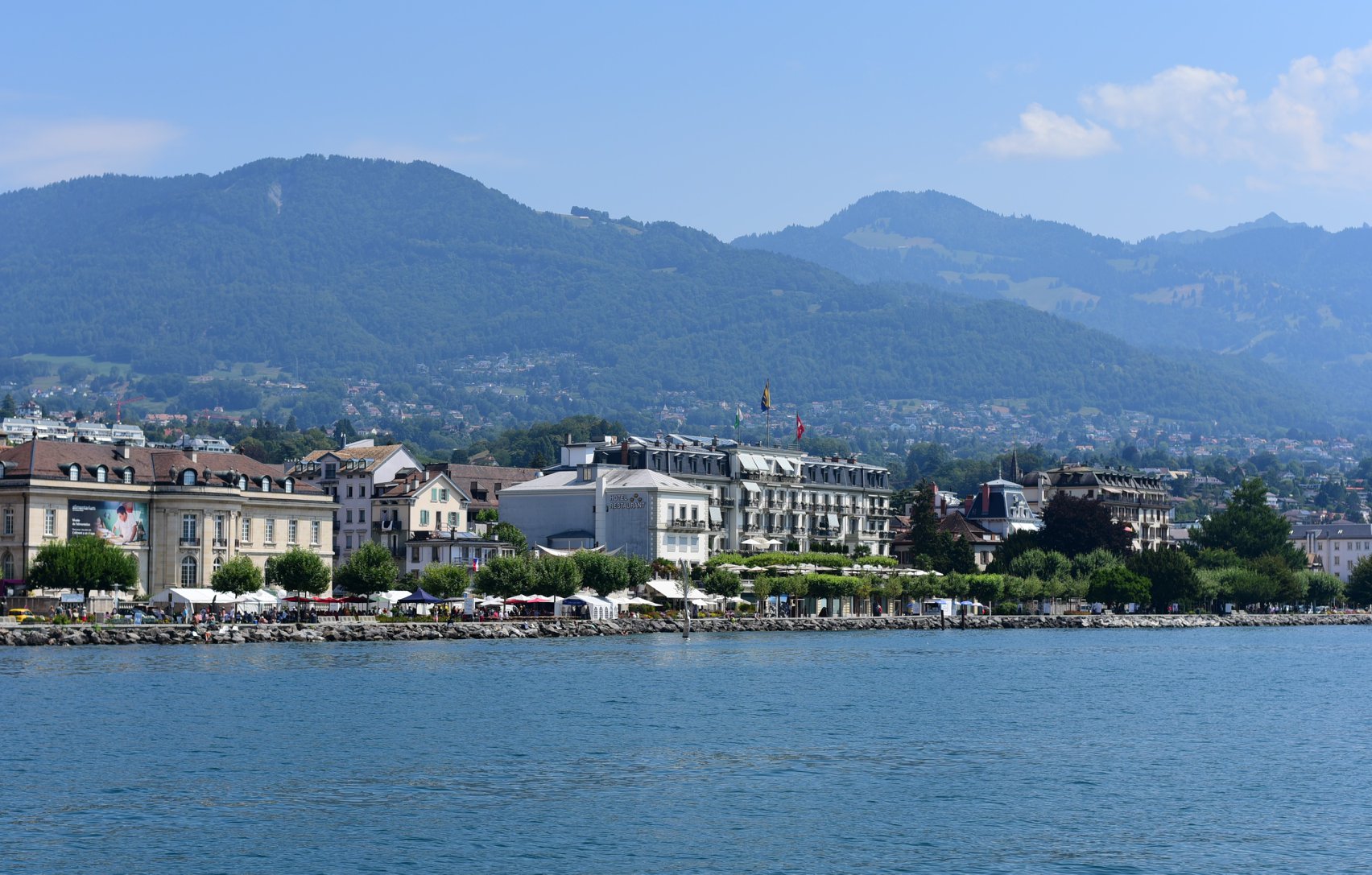 บริเวณท่าเรือ Vevey มองไปไกลๆ จะเห็นภูเขารูปจมูก ที่ชื่อว่า Rochers de naye