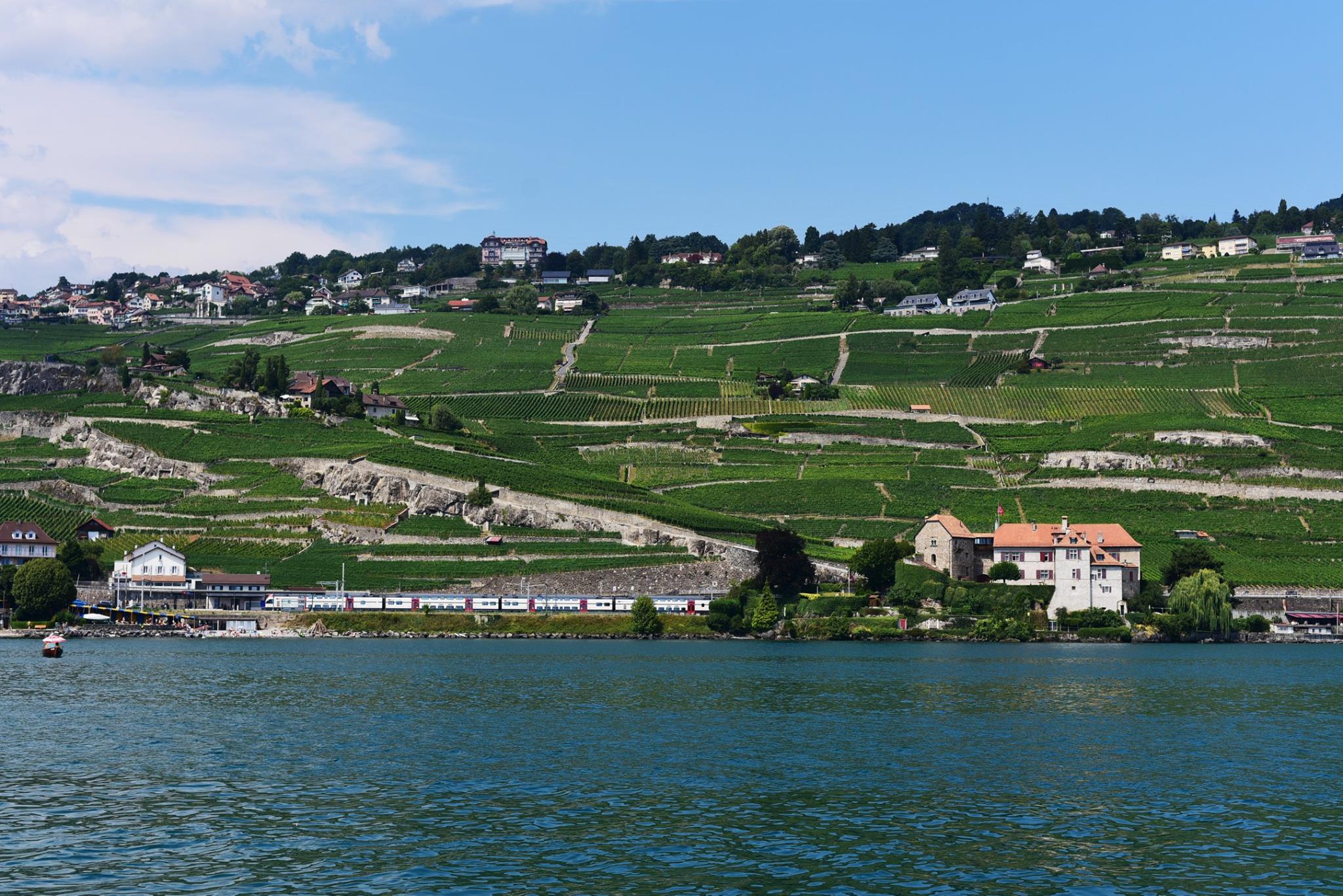 รถไฟสาย local กำลังวิ่งลัดเลาะไปตามไร่องุ่นริมทะเลสาบเจนีวา