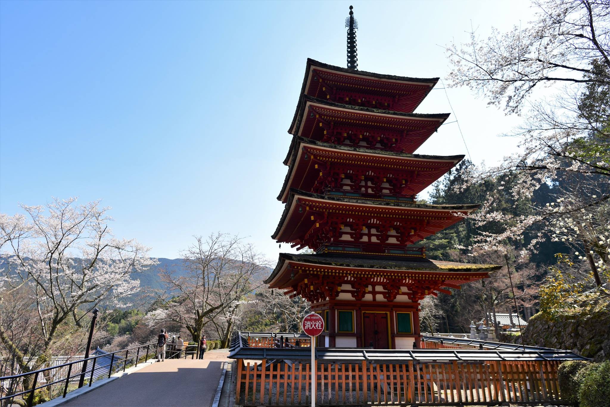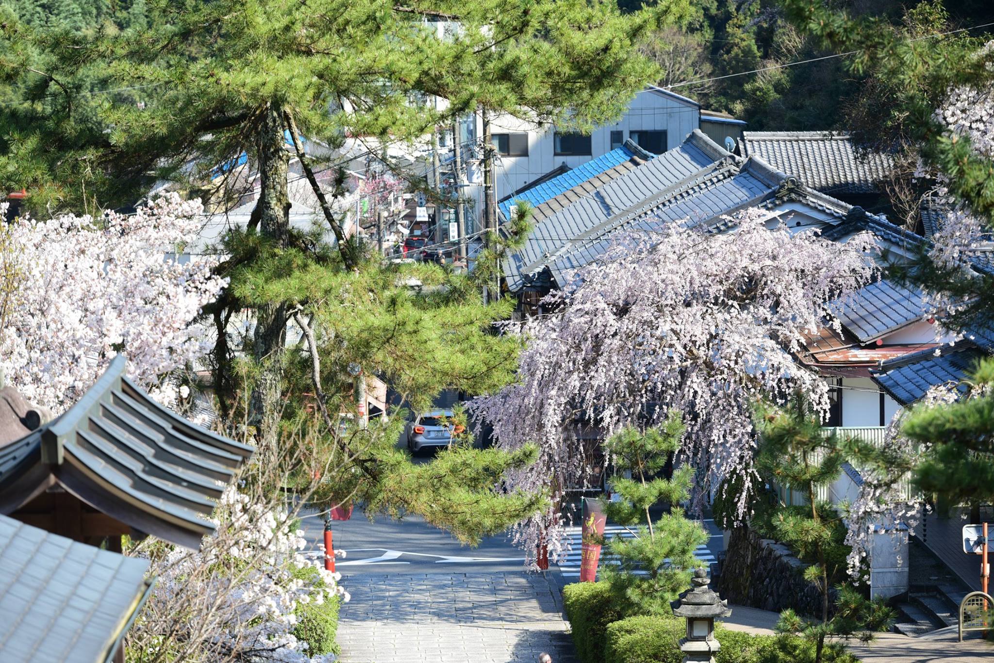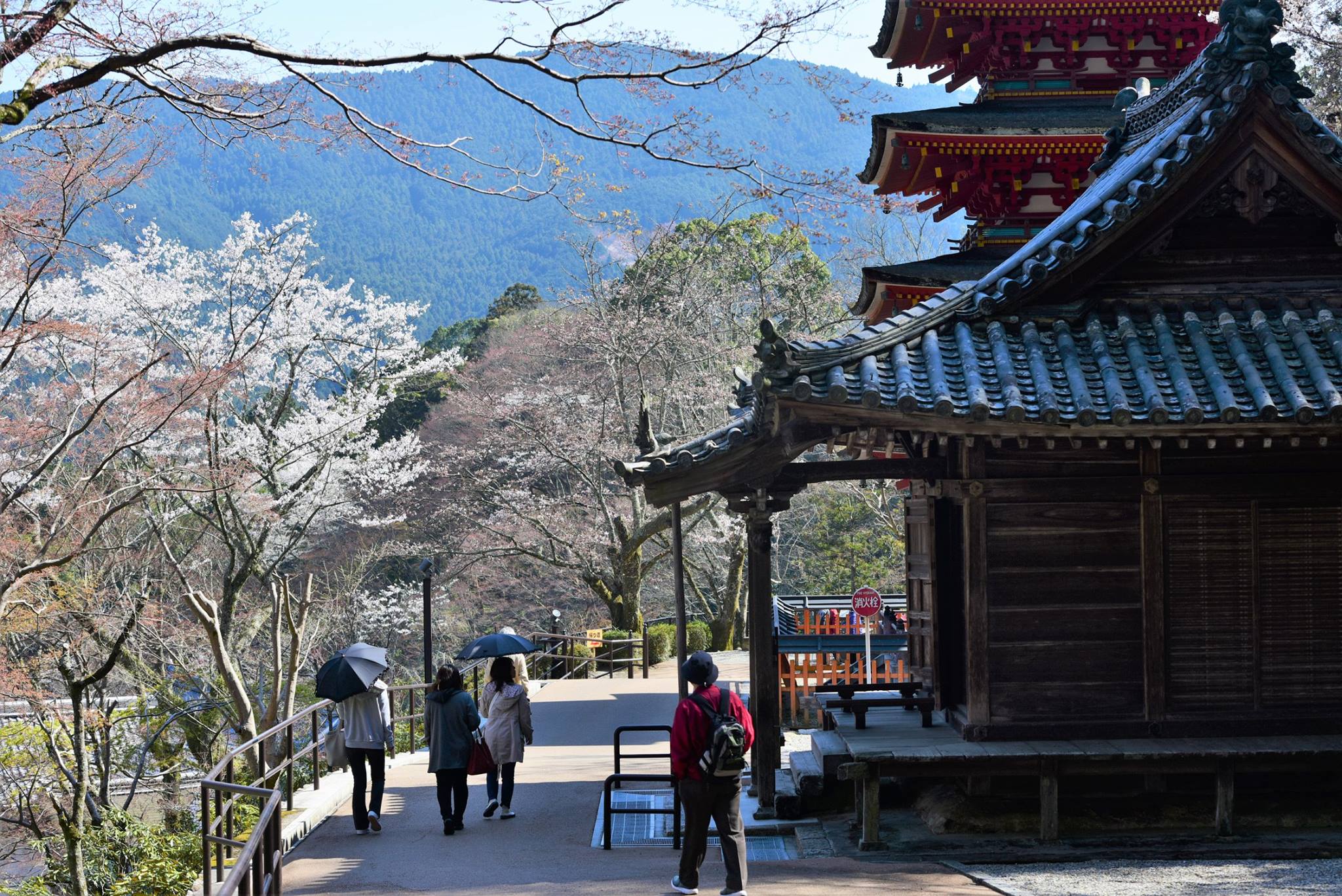 มองจากระเบียงด้านหน้า เห็น Gojuno-toi pagoda อยู่ไกลๆ รายรอบด้วยซากุระป่าที่กำลังบานไล่ตามกันมา