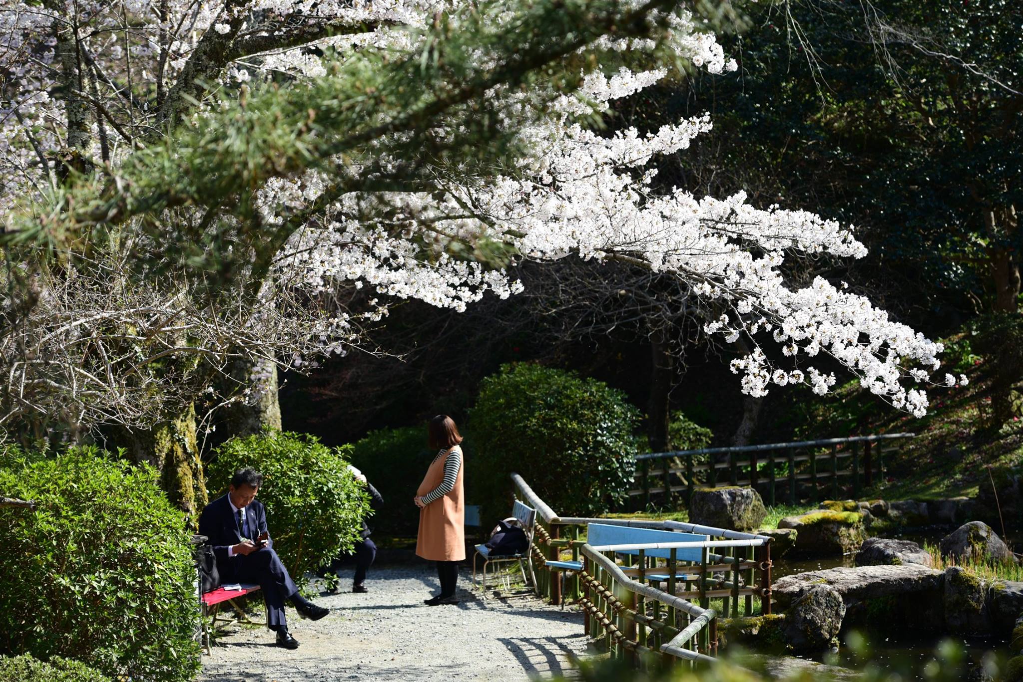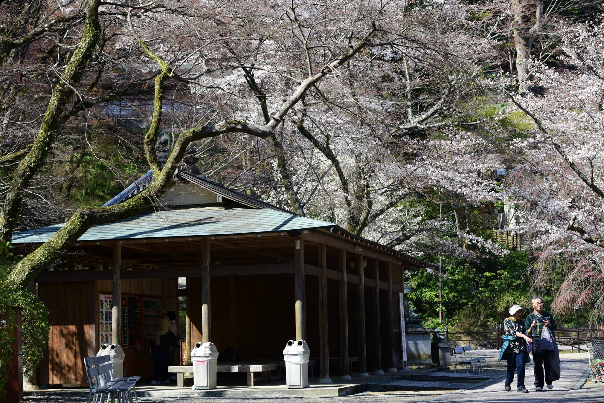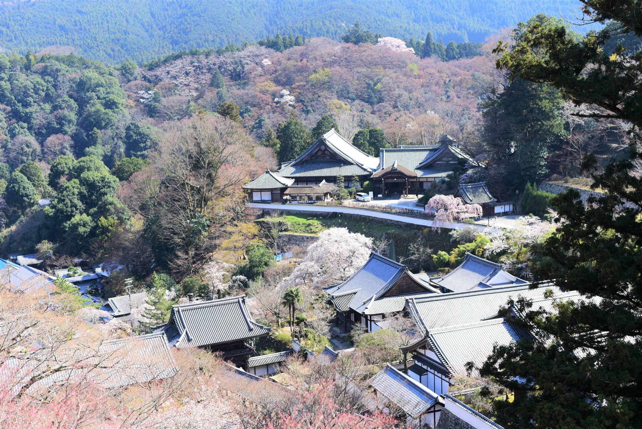 มองจากระเบียงด้านหน้า เห็น Gojuno-toi pagoda อยู่ไกลๆ รายรอบด้วยซากุระป่าที่กำลังบานไล่ตามกันมา