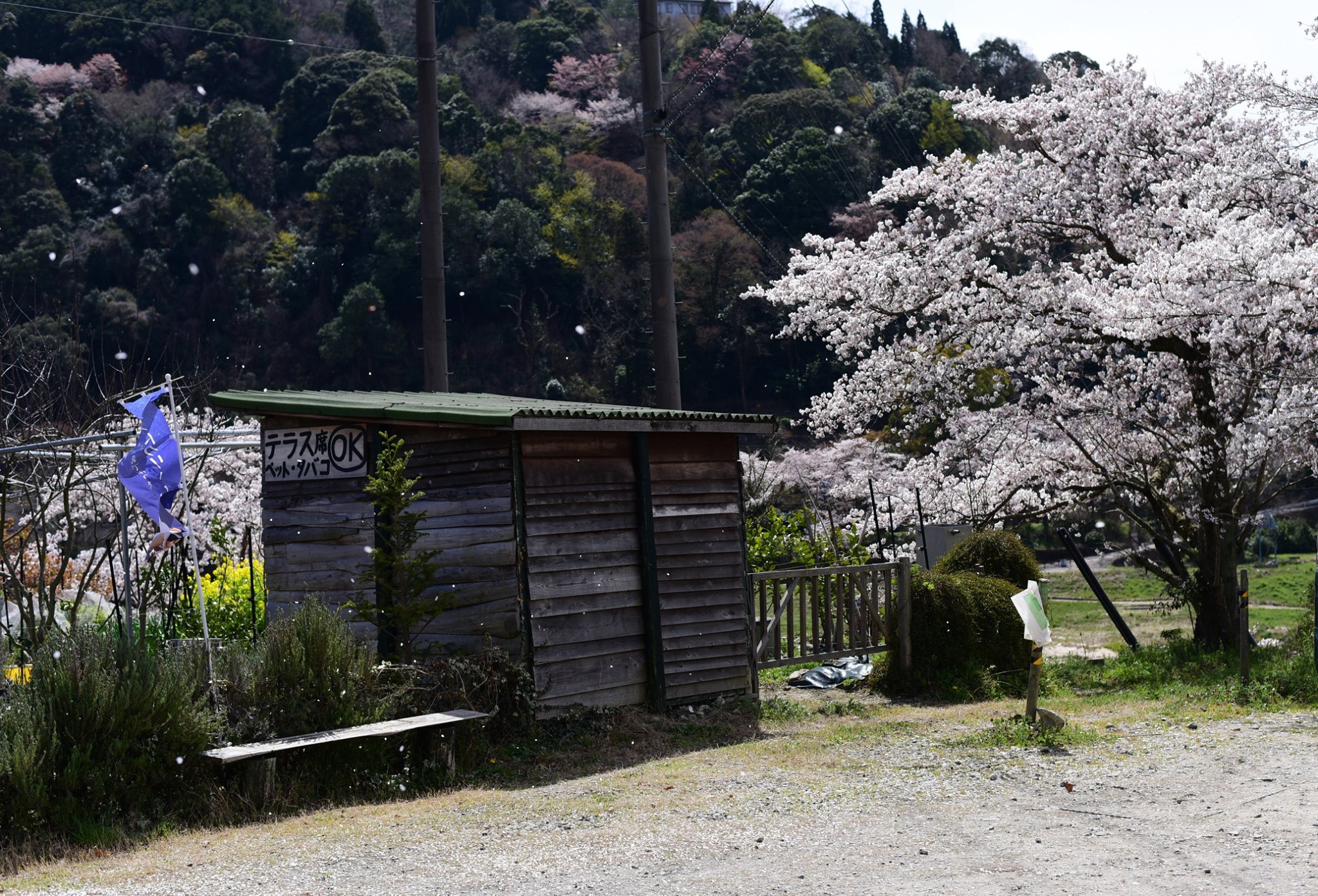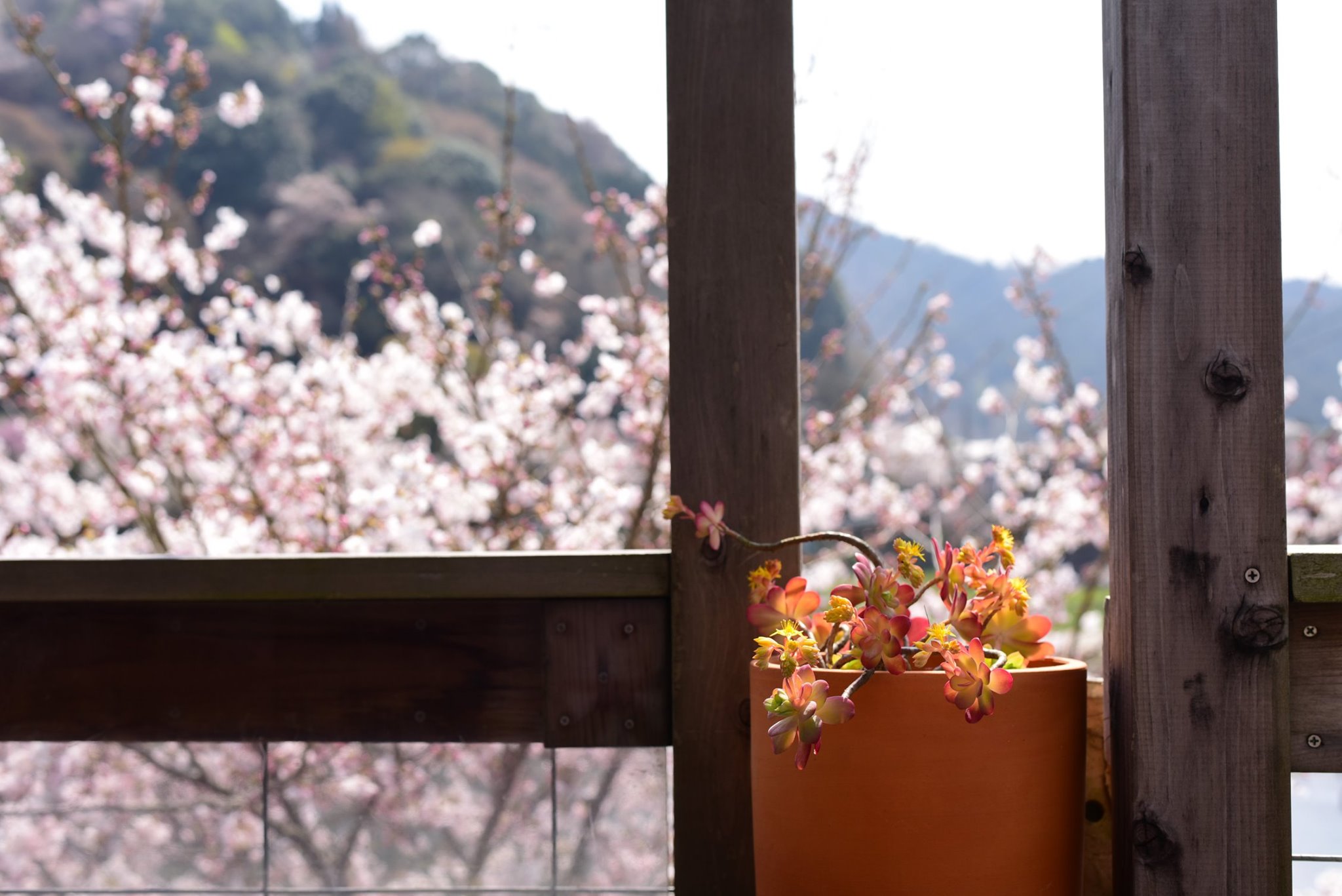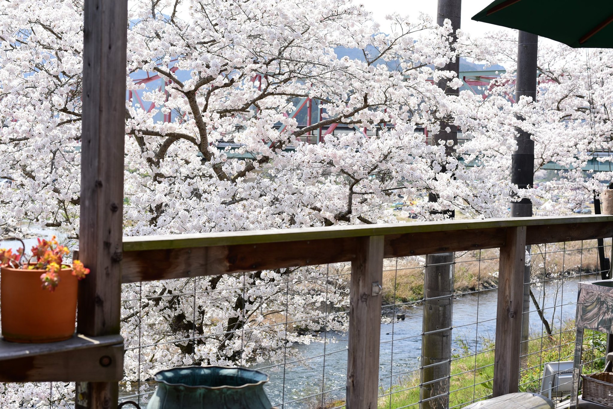 ระเบียงนั่งรับประทานอาหารของร้าน กับซากุระ ที่กำลังสวยงามเต็มที่