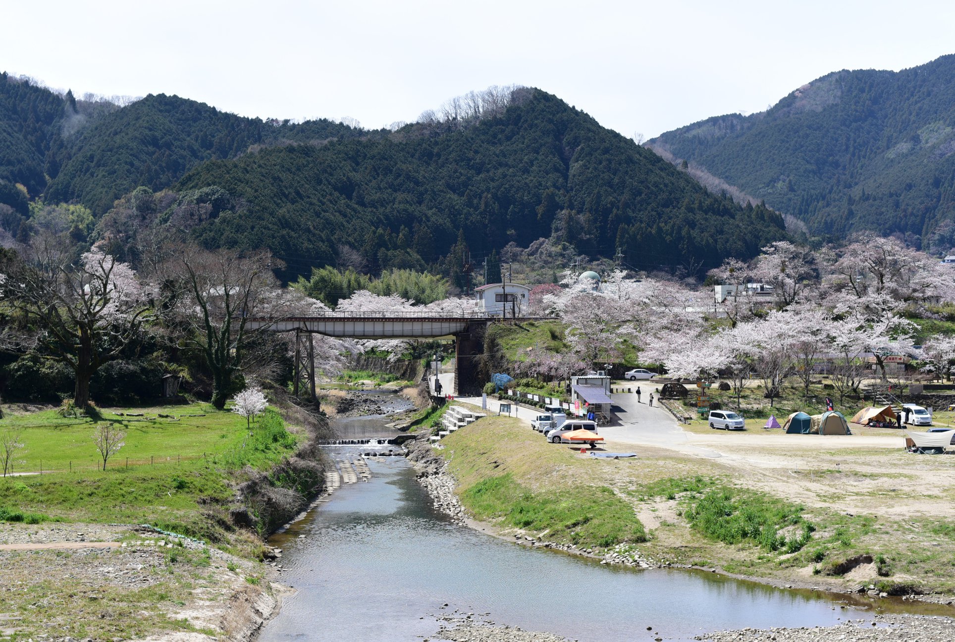 มองจากสวนกลับไปที่สะพานข้ามแม่น้ำ Kasagi สีพาสเทลเข้ากับฤดูใบไม้ผลิ