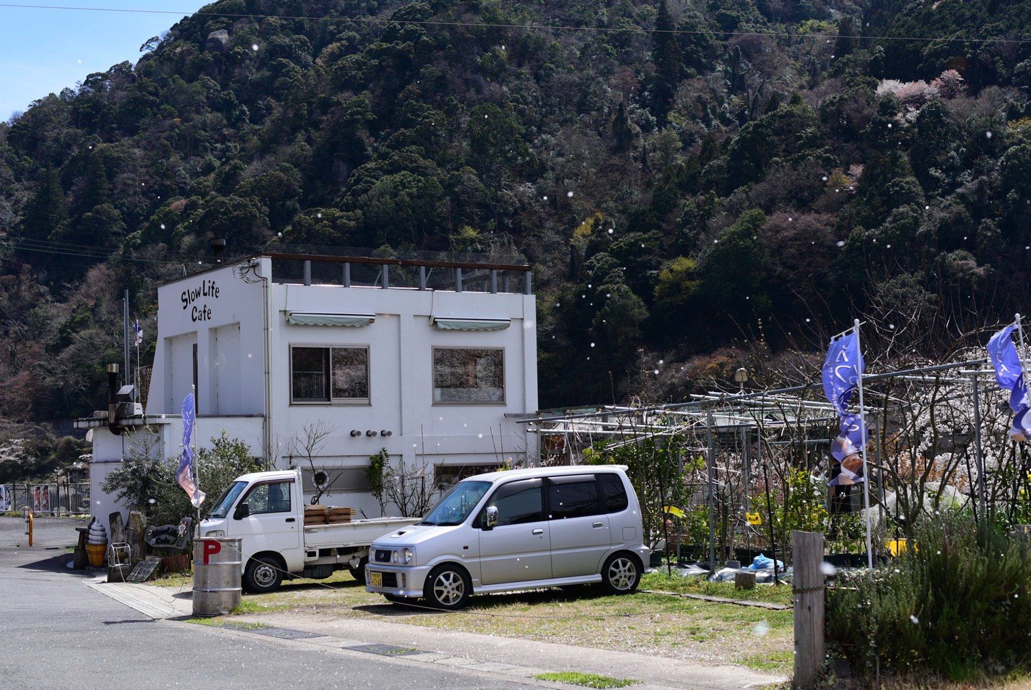 ที่ตั้งของ Slow life cafe นั้นอยู่ในจุดที่สวยงาม วิวแม่น้ำฝั่งตรงข้าม กับซากุระที่กำลังบานสะพรั่ง เข้ากับชื่อร้านและบรรยากาศของเมืองเป็นอย่างดี