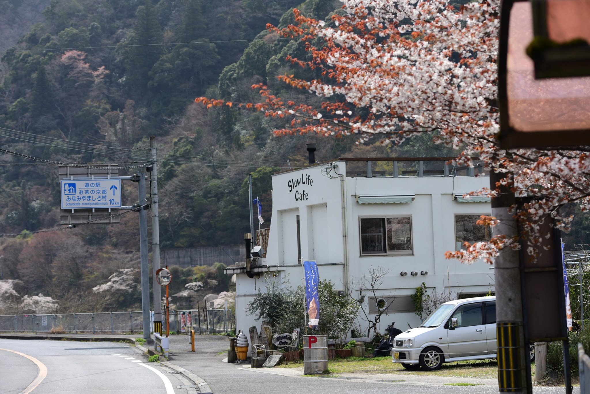 เมื่อเดินข้ามสะพาน Kasagi bridge ซึ่งจะเป็นสะพานรถยนต์คู่กับทางเดิน ไปยังฝั่งตรงข้าม ก็จะเจอกับร้าน Slow life cafe อยู่ตรงเชิงสะพาน ติดถนนใหญ่