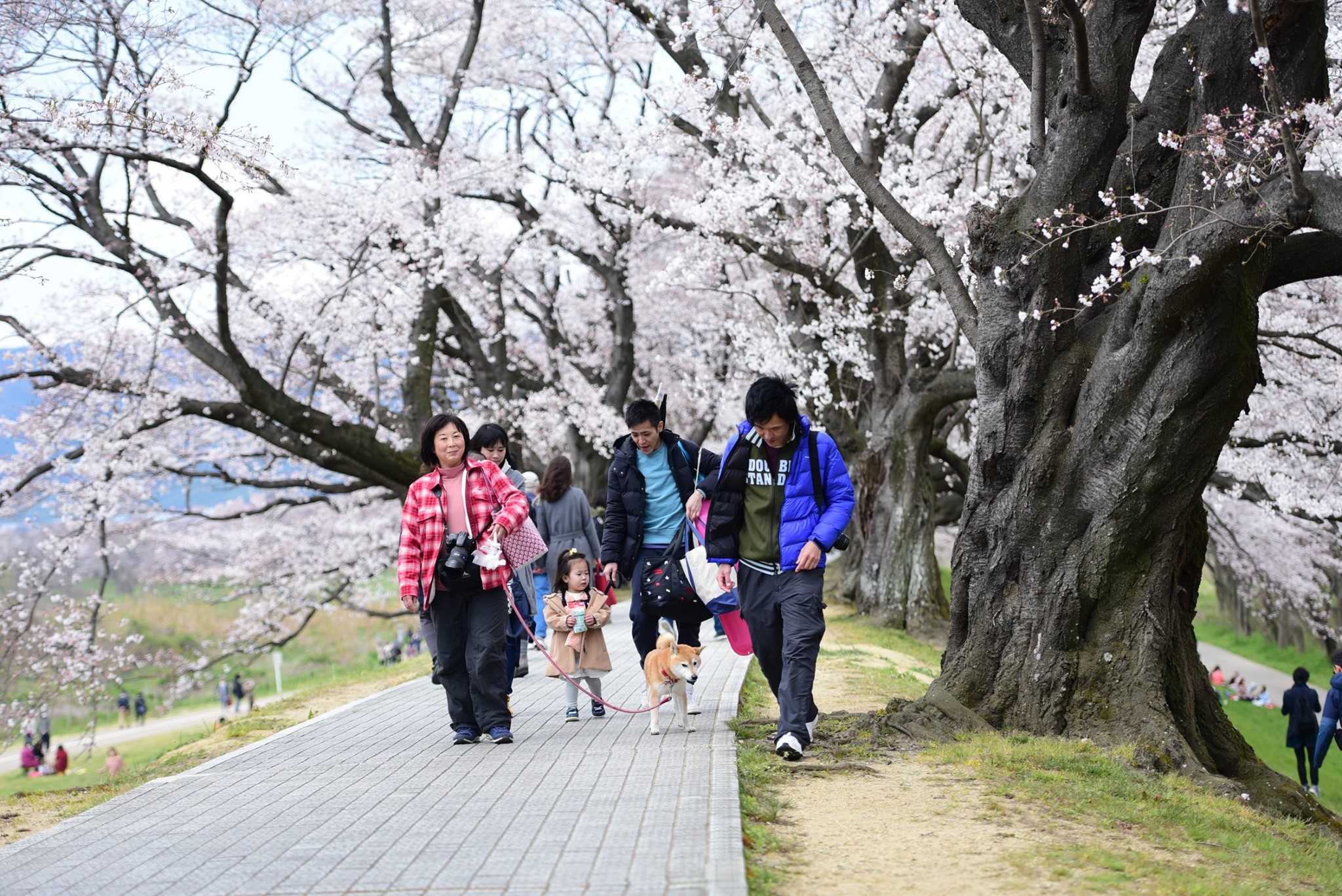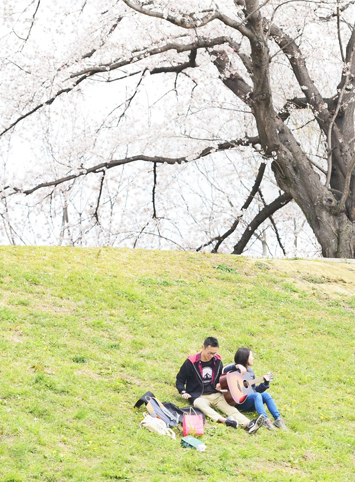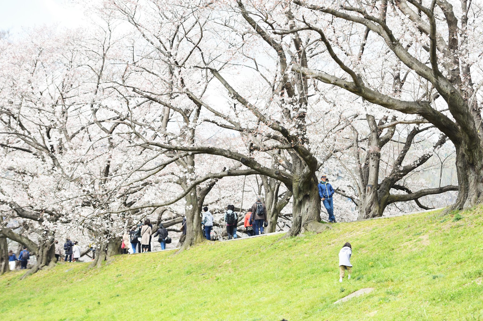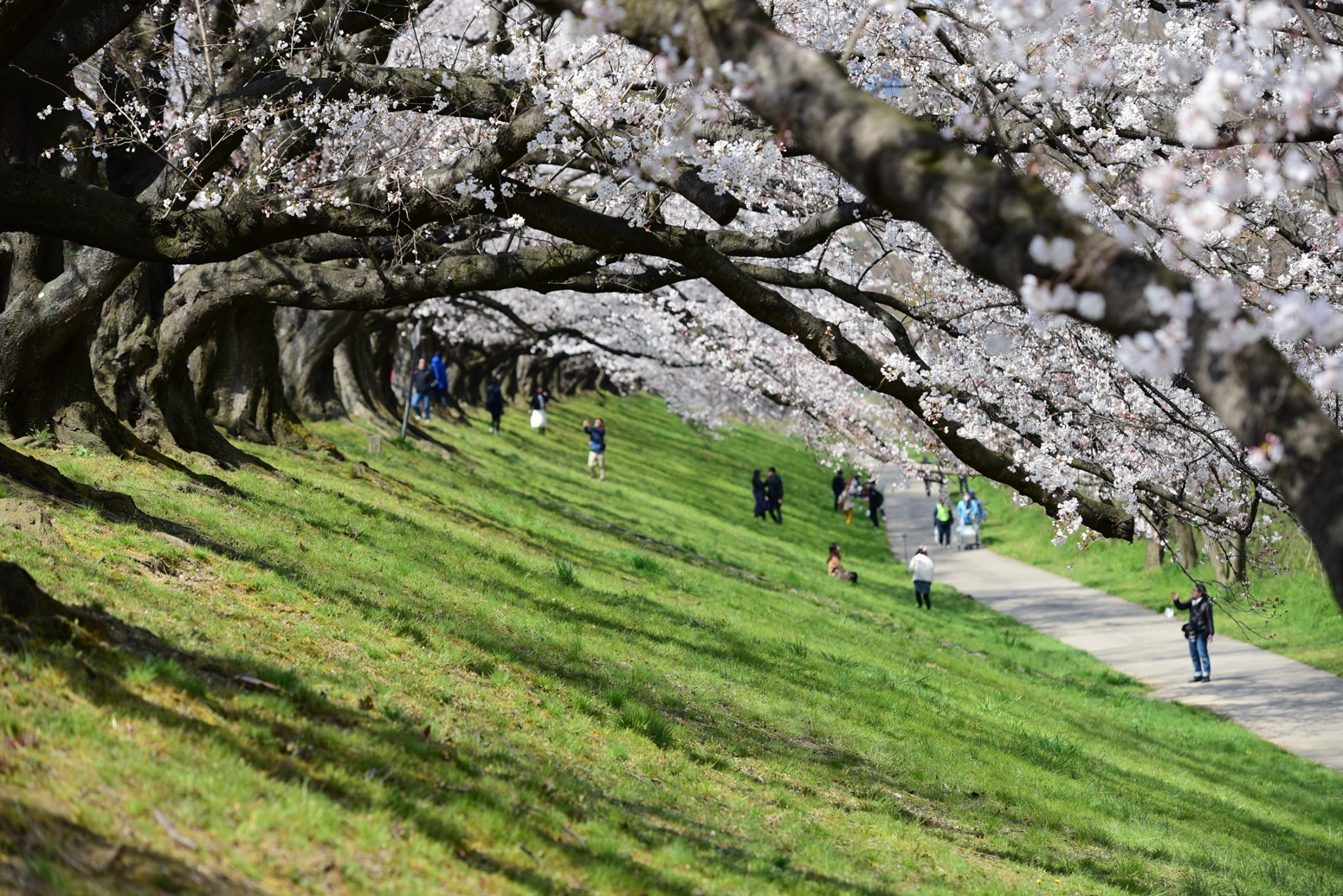 เมื่อเราเดินจากสถานีรถไฟ เดินข้ามแม่น้ำมา จะเห็นว่ามีนักท่องเที่ยวจำนวนมากที่หลั่งไหลเดินตามกันมา แต่ด้วยความที่บริเวณสวนมีพื้นที่อันกว้างใหญ่ แนวต้นซากุระที่ทอดยาว สามารถรองรับผู้คนจำนวนมากได้อย่างสบายๆ ไม่รู้สึกถึงความแออัดแต่อย่างใด