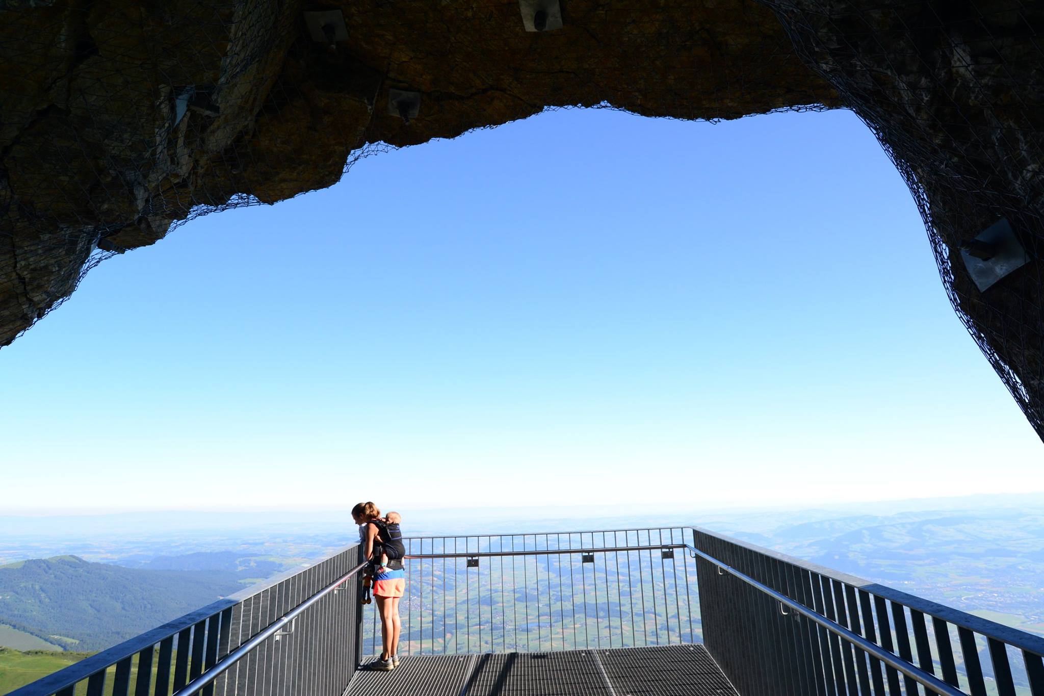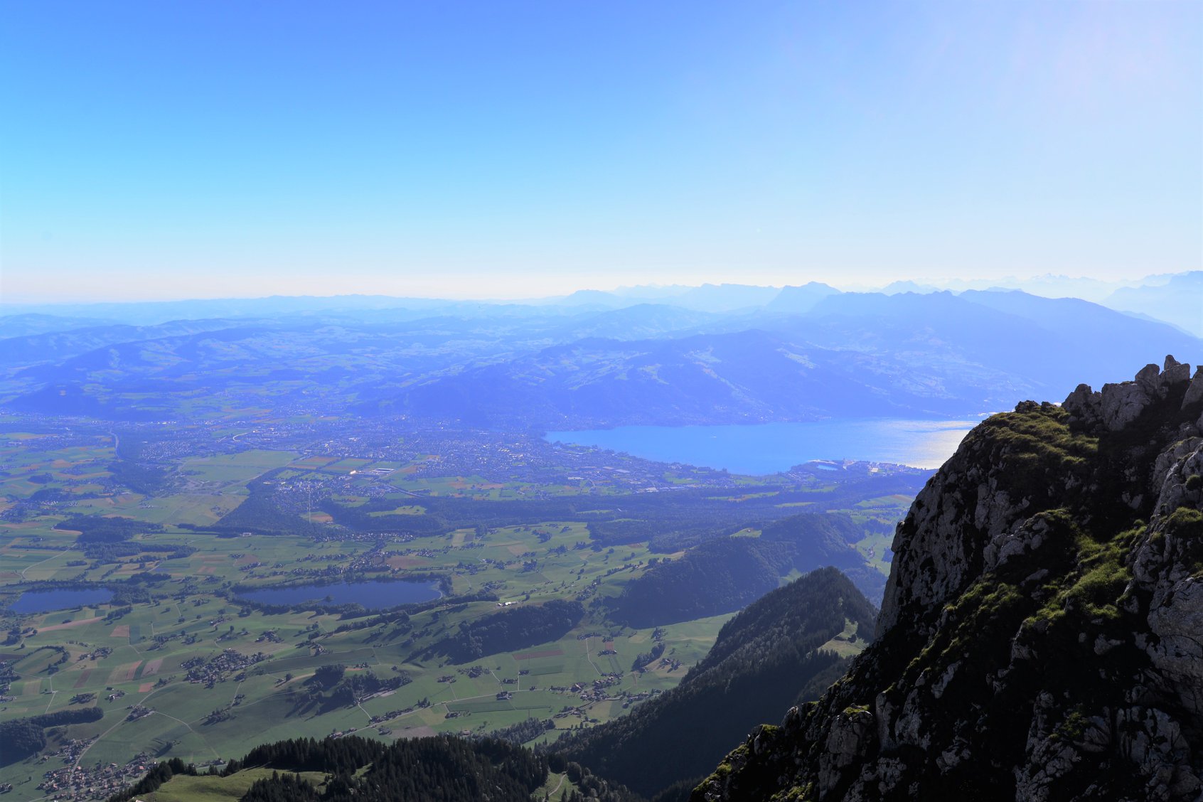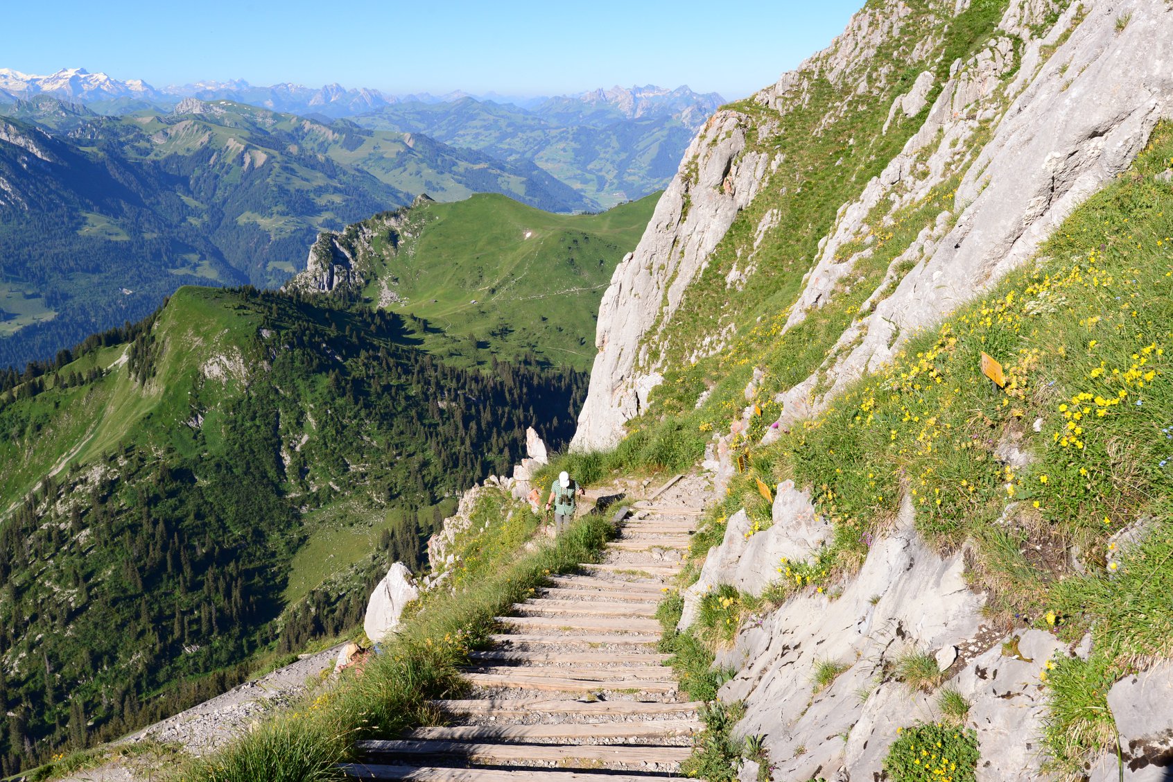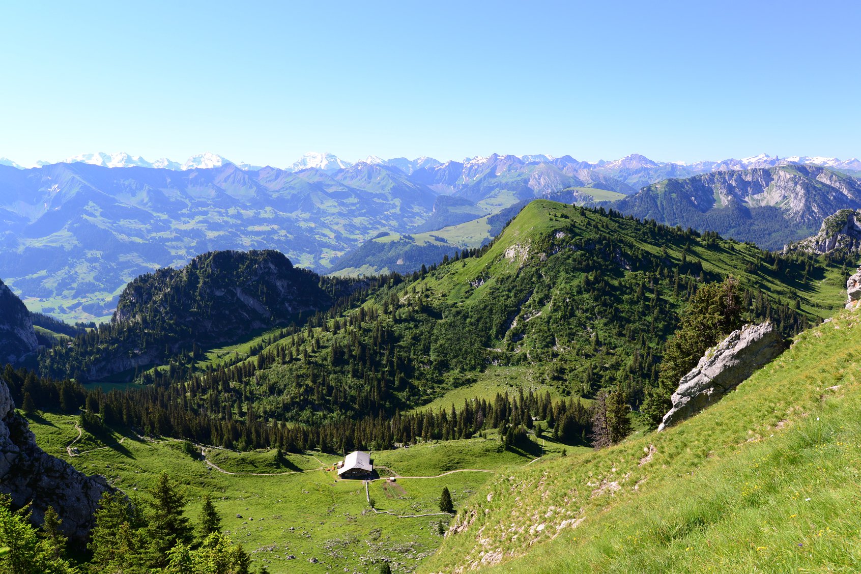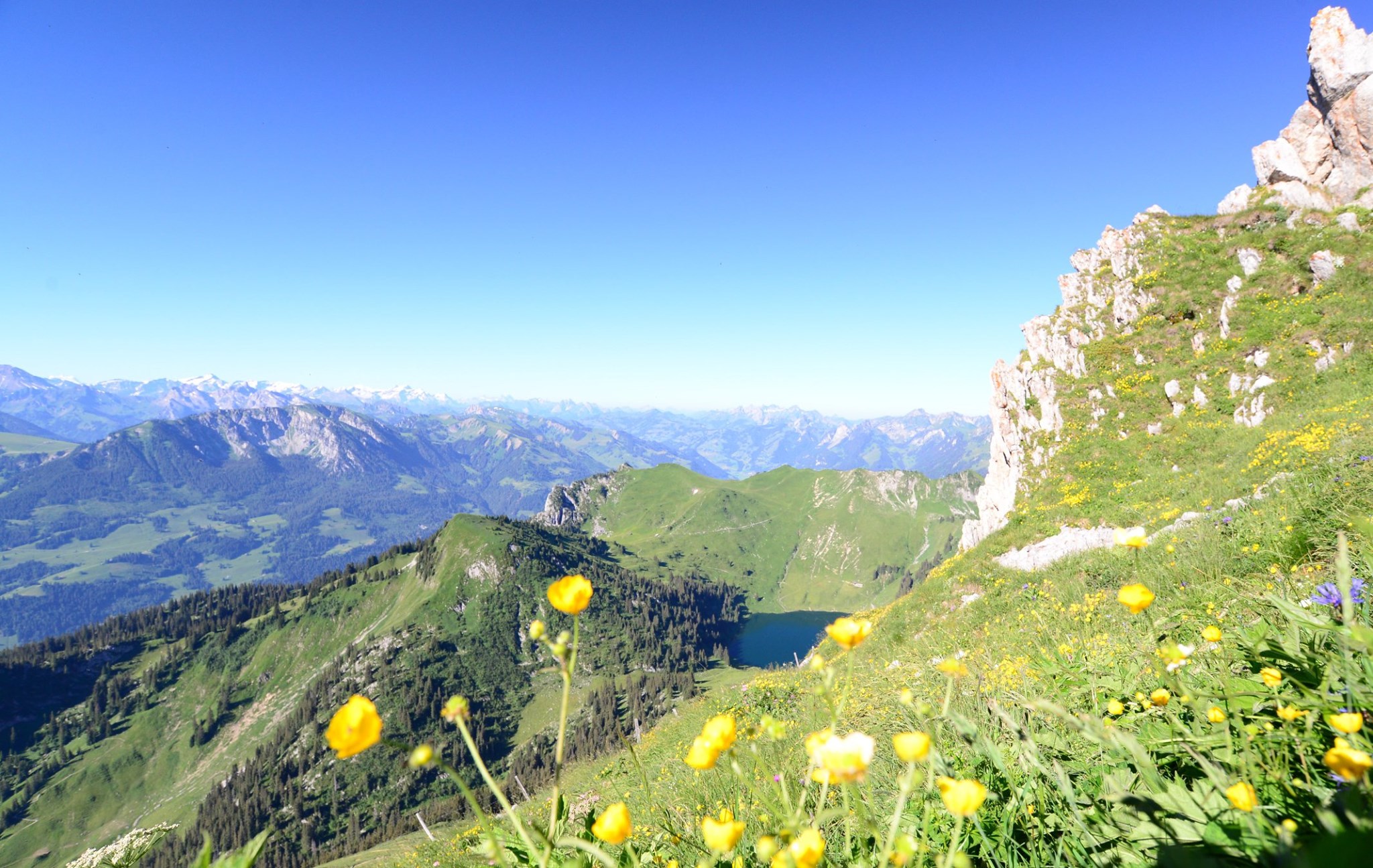 ที่ด้านหน้า Stockhorn จะมองเห็นเทือกเขา Alps ที่มีหิมะปกคลุมอยู่ไกลๆ ส่วนด้านหลังจะมองเห็นพื้นที่ราบ และ เมือง Thun