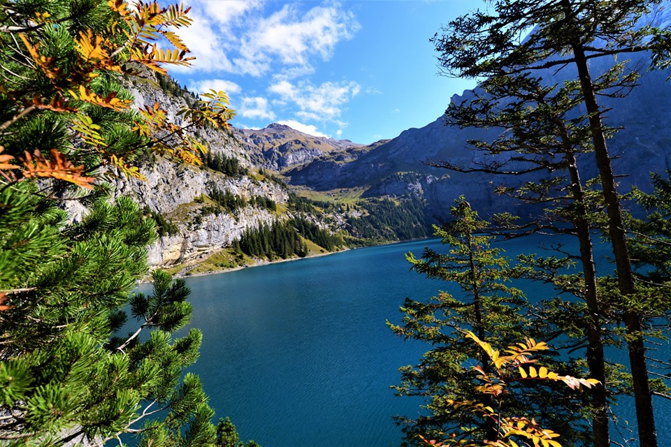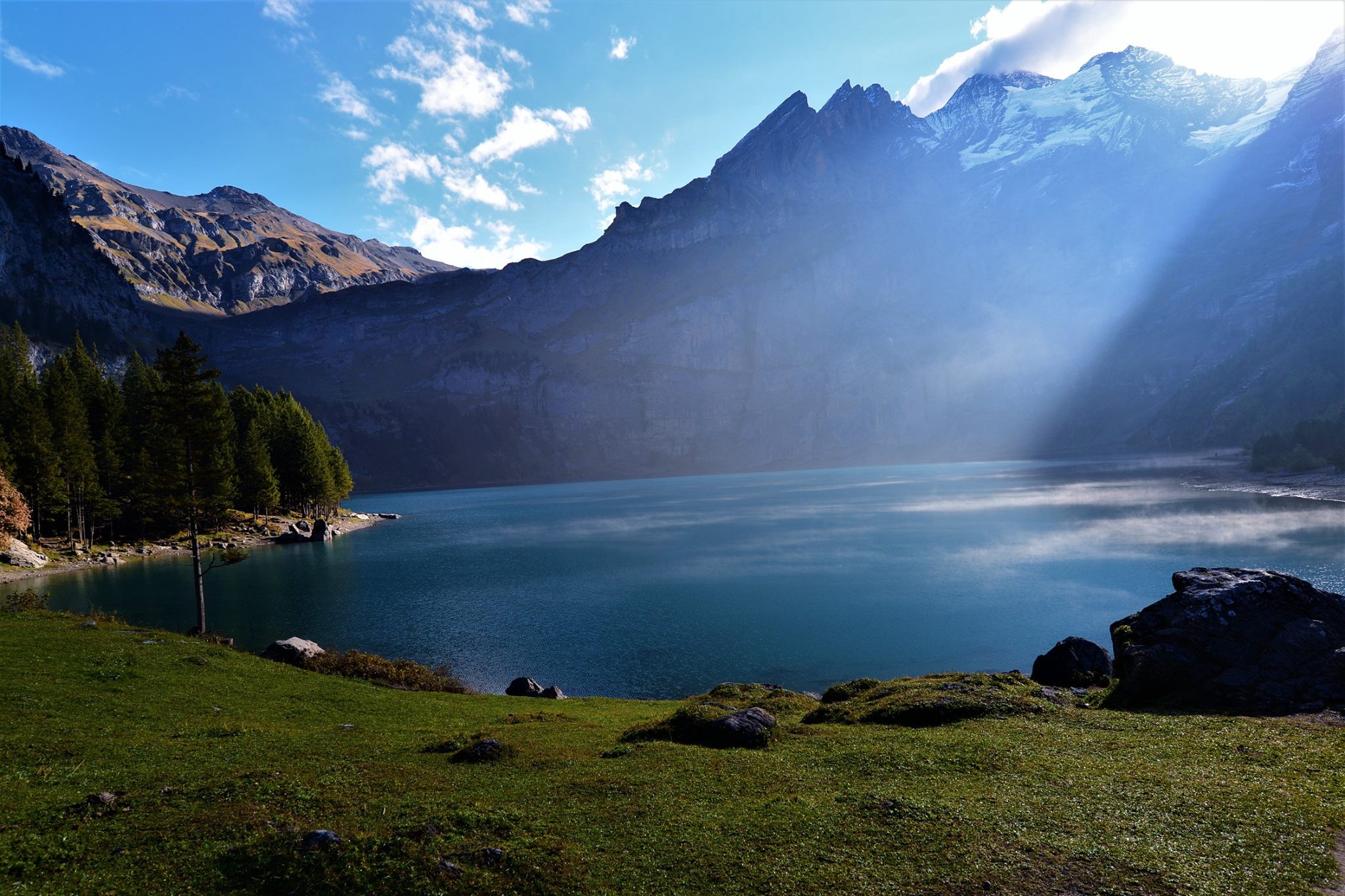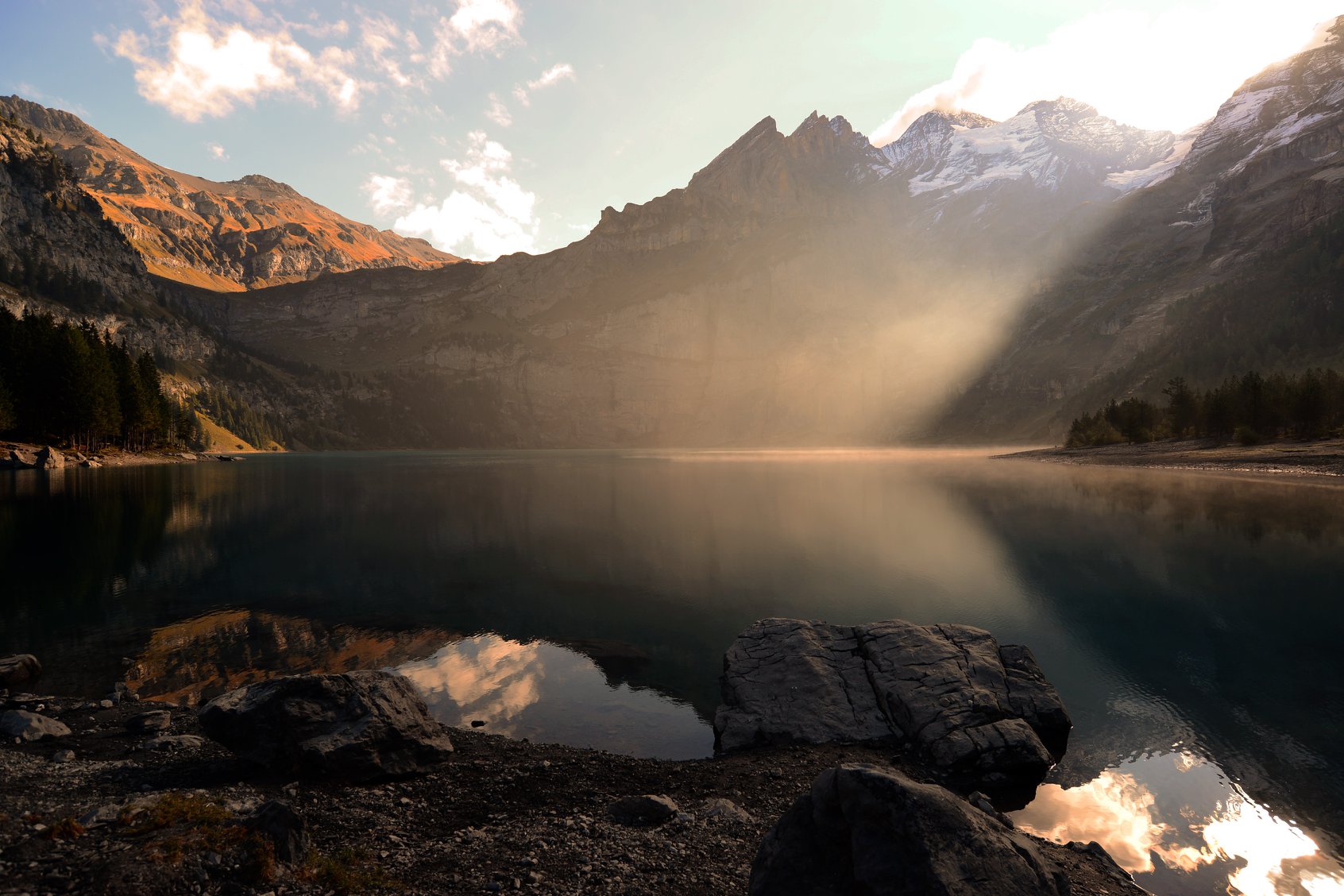oeschinensee เป็นทะเลสาบสีครามบนยอดเขาสูงในเมือง Kandersteg ยามรุ่งอรุณบนทะเลสาบแห่งนี้ มีความงดงามของปุยหมอกที่ลอยล่องเหนือผิวน้ำในยามเช้า