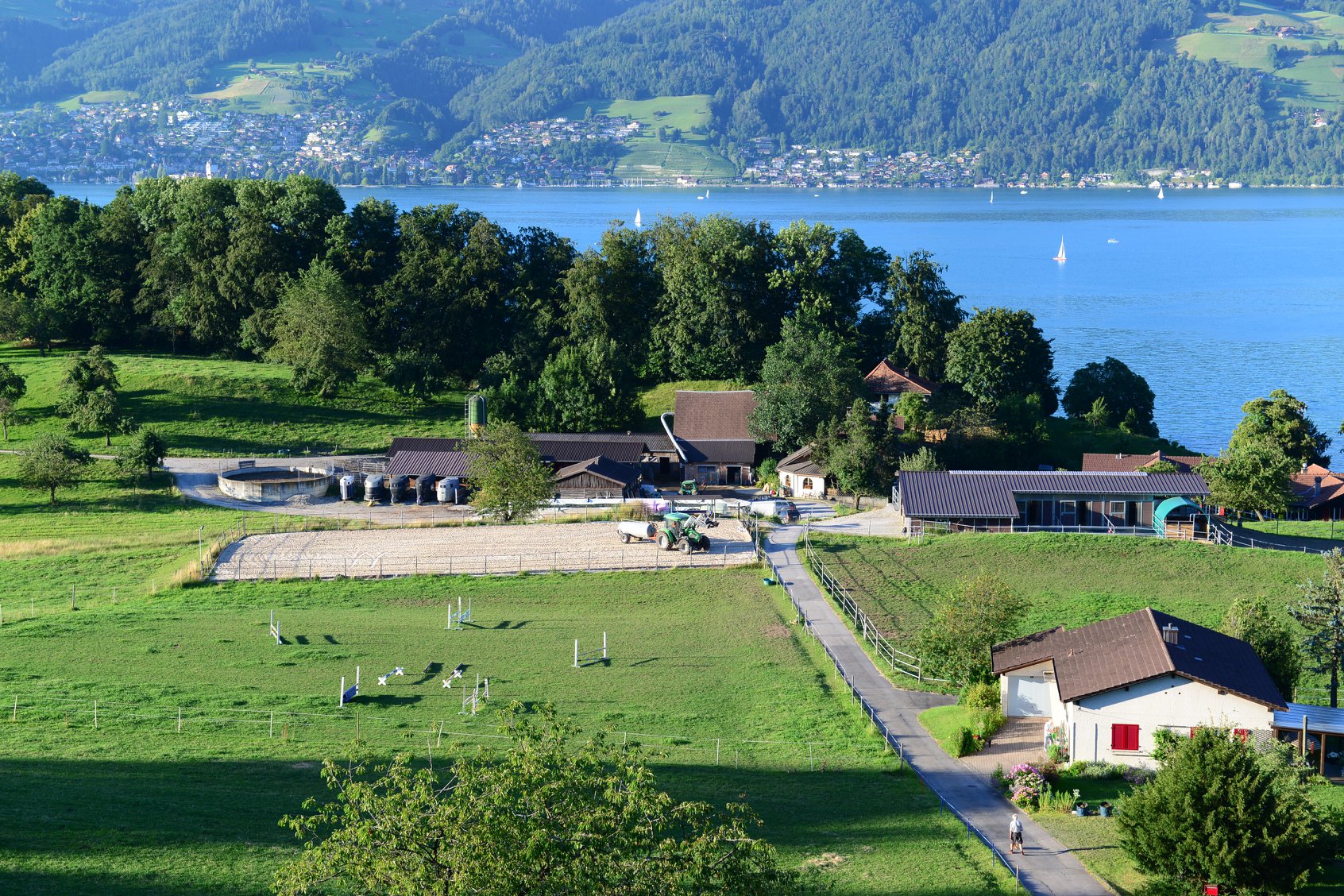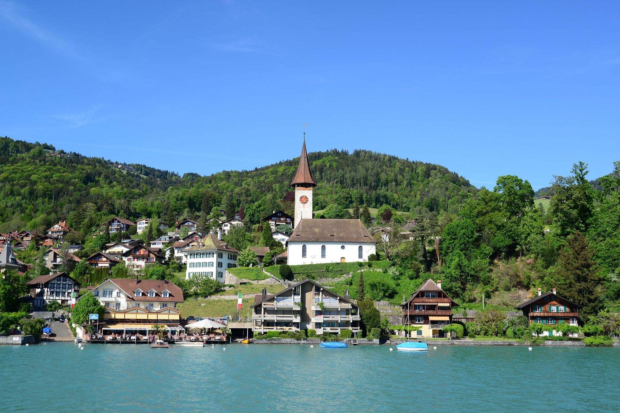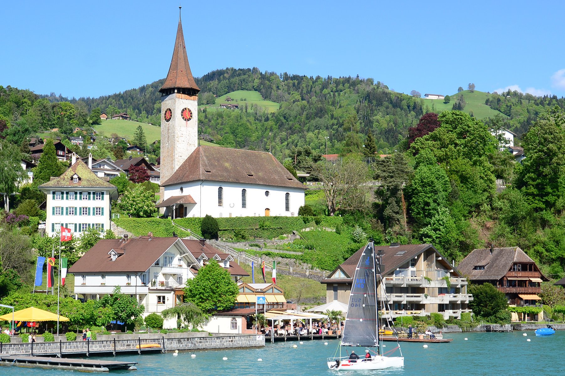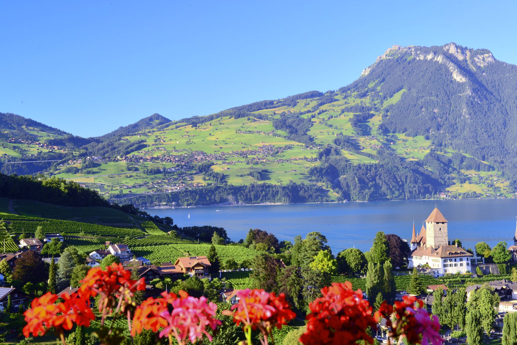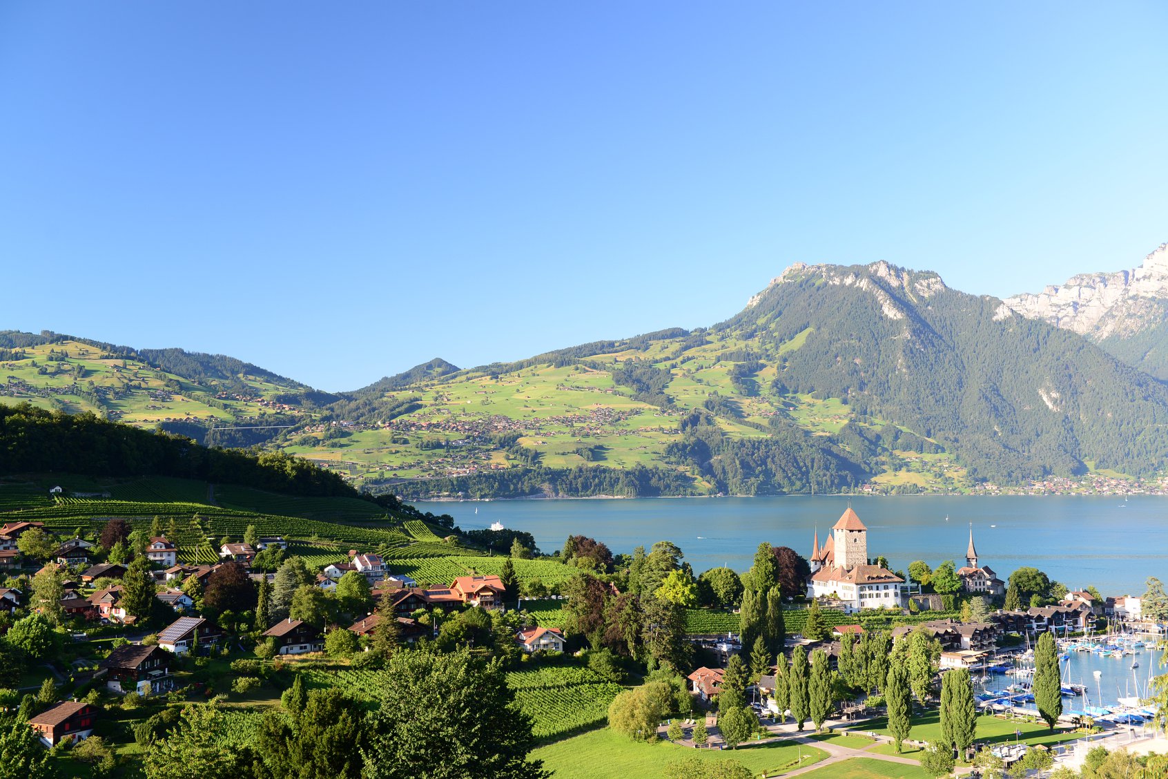 ทัศนียภาพของเมือ Spiez จะมีไร่องุ่น ที่อยู่บนเนินเขา เหนือทะเลสาบ Thun