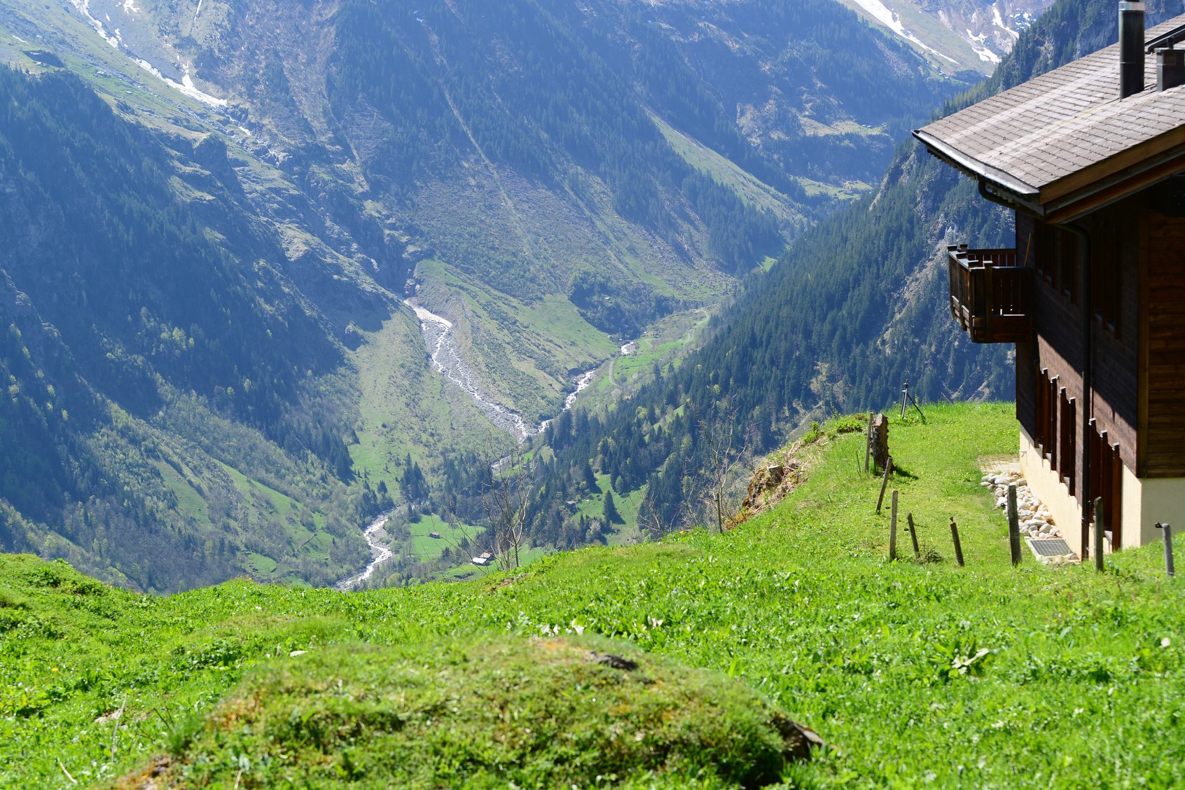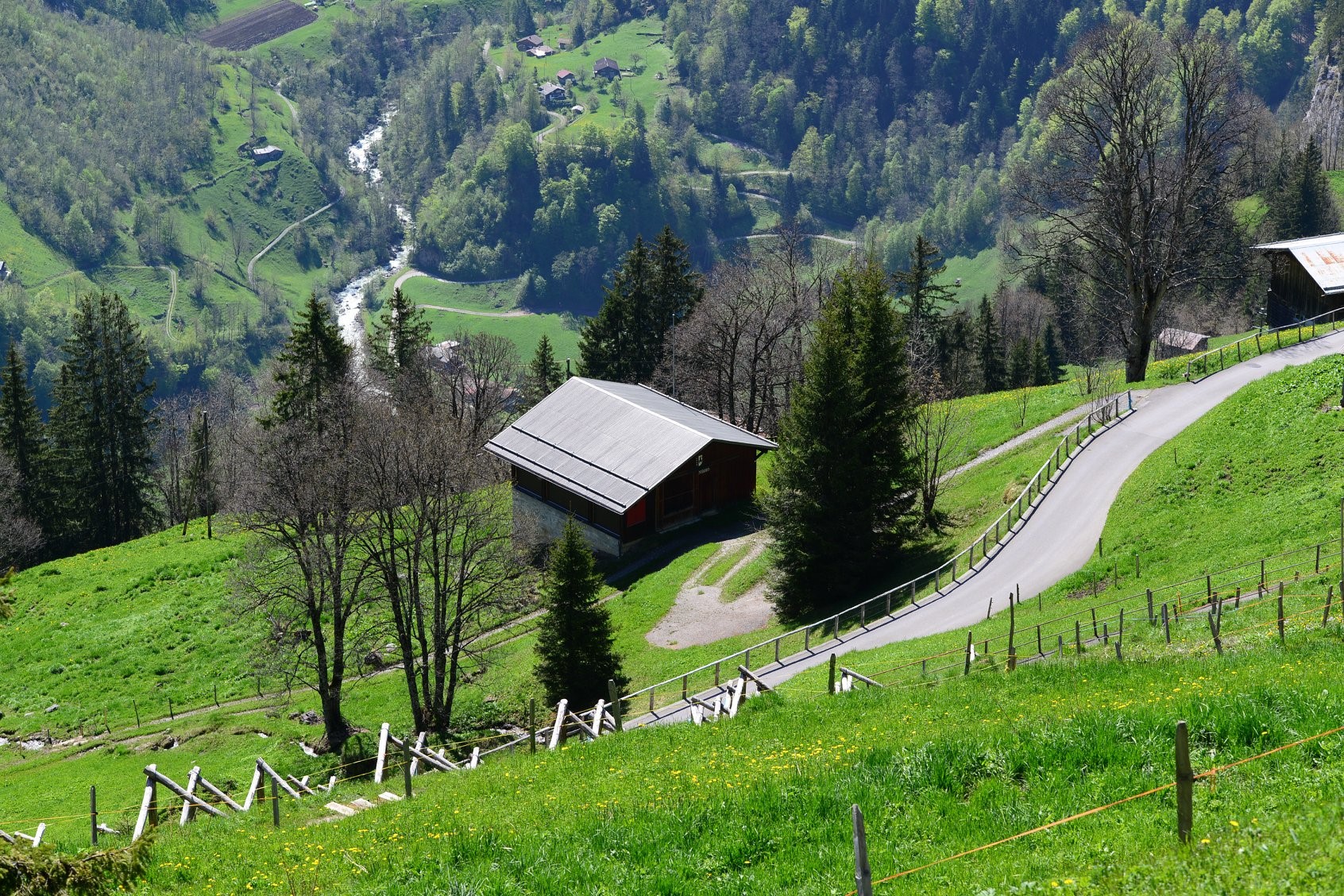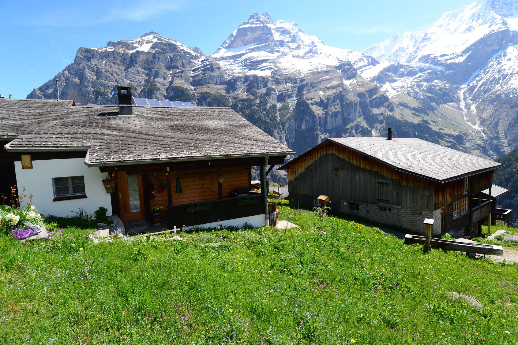 เมื่อเดินลงไปใกล้ๆหมู่บ้าน Gimmeldwald ก็จะค่อยๆเจอกับบ้านหลังเล็กๆที่กระจายตัวห่างๆตามเนินเขา ทุ่งหญ้า