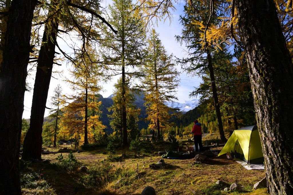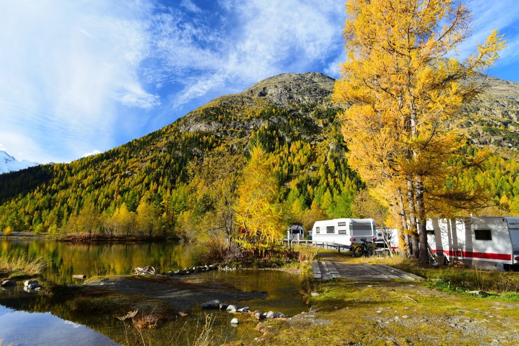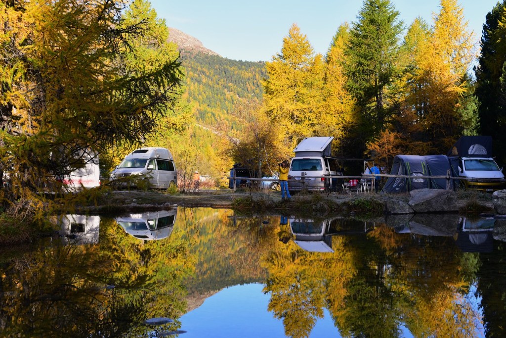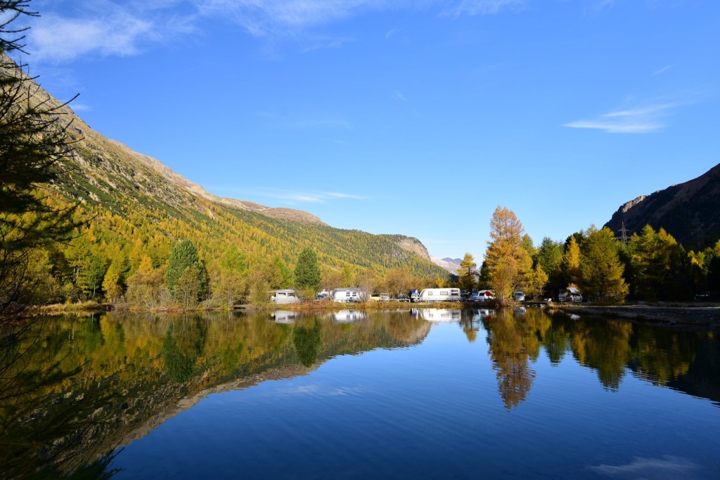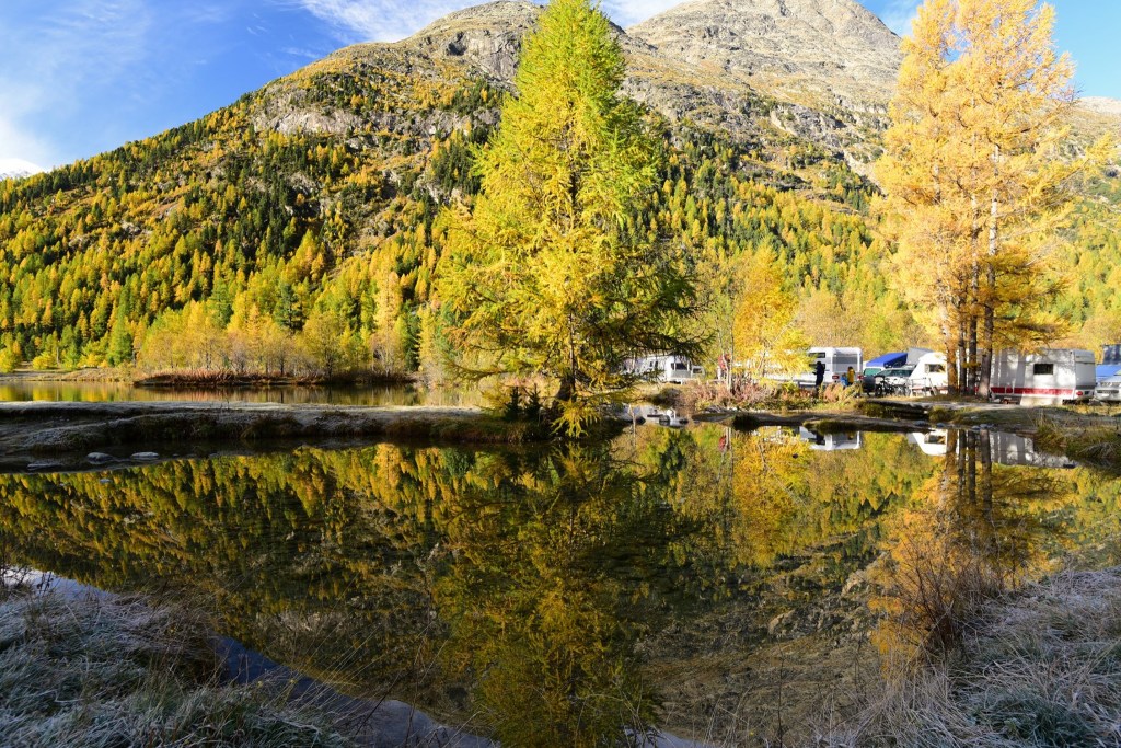 อีกด้านหนึ่งคือ พื้นที่ตั้งแคมป์ ที่อาศัยชื่อของธารน้ำแข็ง ว่า Moteratsch camping หลายคนกำลังหลับใหลใต้ผ้าห่มอุ่นในรถบ้านและเต้นท์กลางแจ้งอย่างมีความสุข…. แต่บางคนก็ตื่นขึ้นมาชื่นชมบรรยากาศของยามเช้าที่สวยงามเกินกว่าที่จะปล่อยให้แดดยามสายค่อยๆกลืนหายเอาความสดชื่นไป