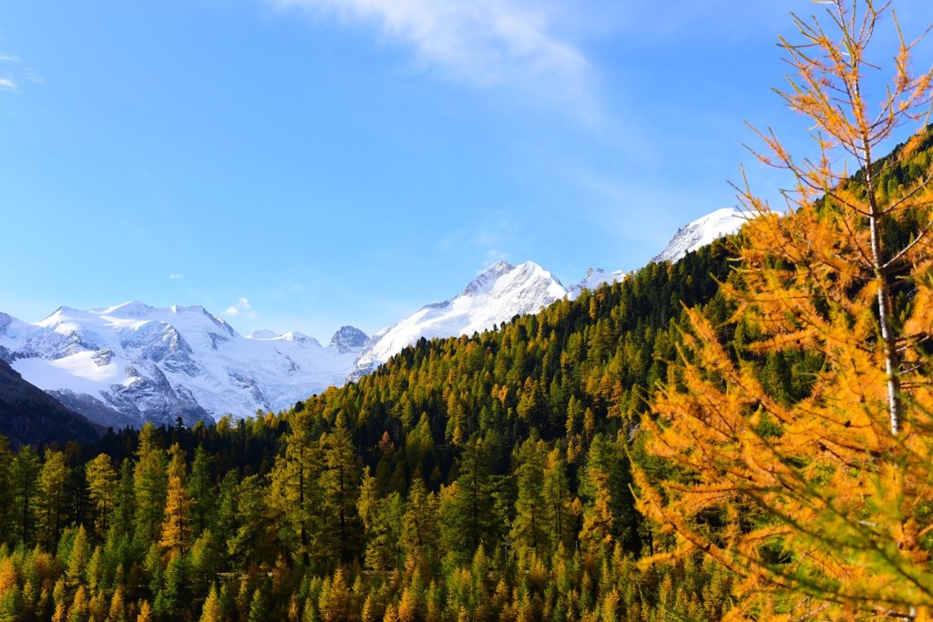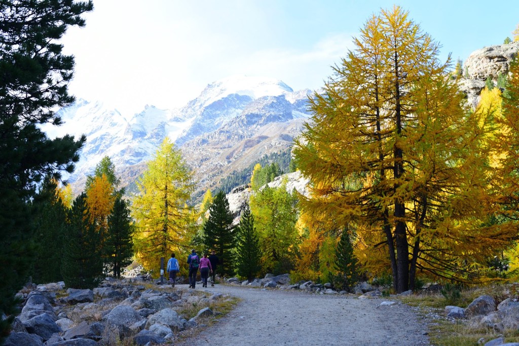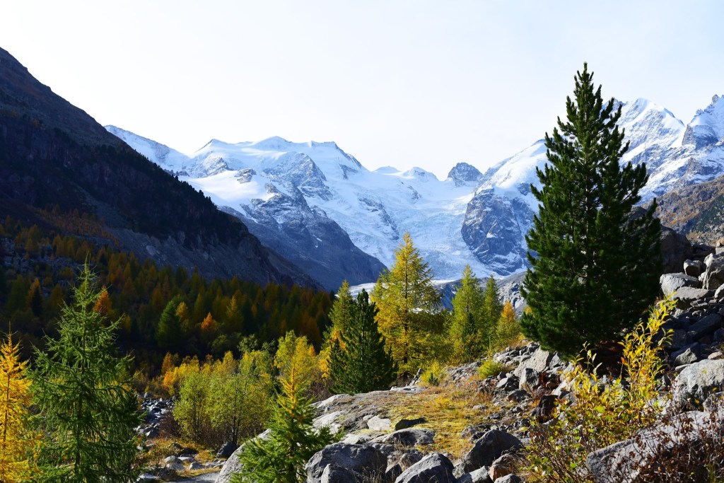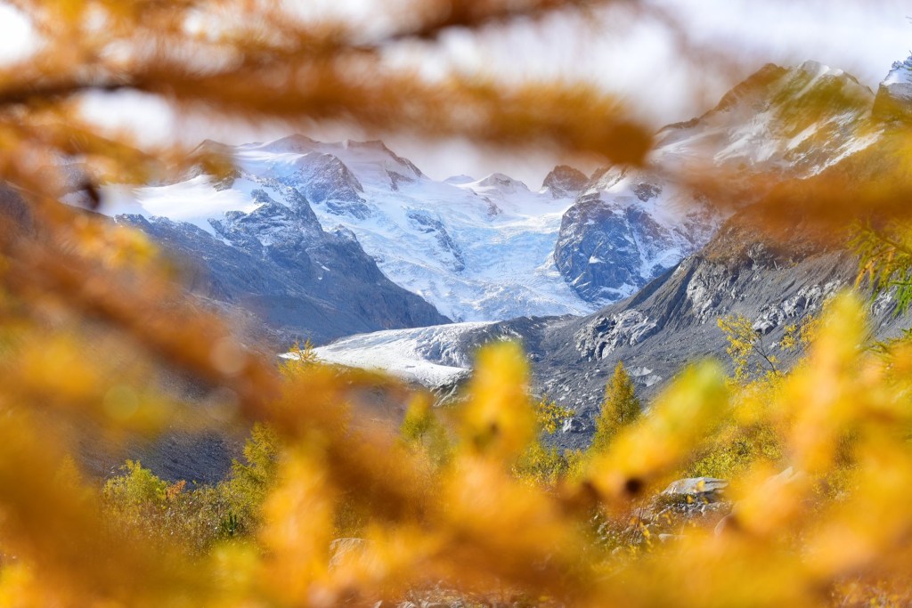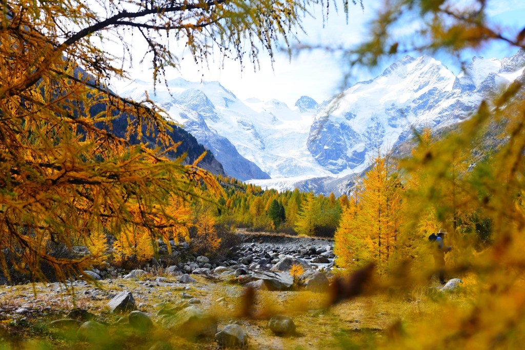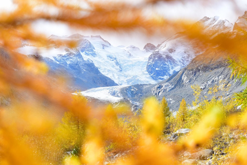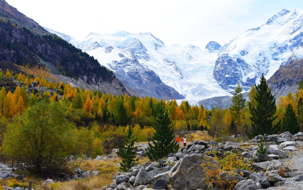จากบริเวณ Moteratsch camping เราจะมองเห็นยอดเขา และธารน้ำแข็งอันโดดเด่น อยู่ไม่ใกล้ ไม่ไกล นั้นคือ Morteratsch Glacier ซึ่งความพิเศษของธารน้ำแข็งที่รัฐ Engadin แห่งนี้คือ ในช่วงฤดูใบไม้ร่วง ยอดสนที่อยู่รายรอบภูเขาแถบนี้จะพากันเปลี่ยนเป็นสีเหลืองส้มอย่างพร้อมใจ ทำให้ธารน้ำแข็งแห่งนี้มีสีสันสดใสสวยกว่าใครในฤดู Autumn