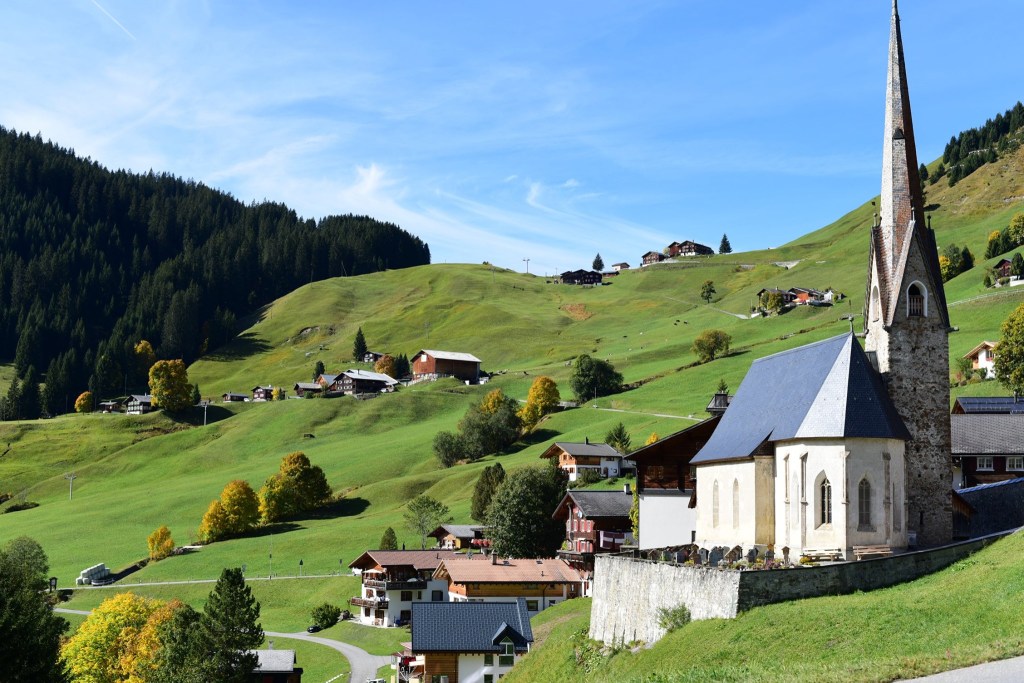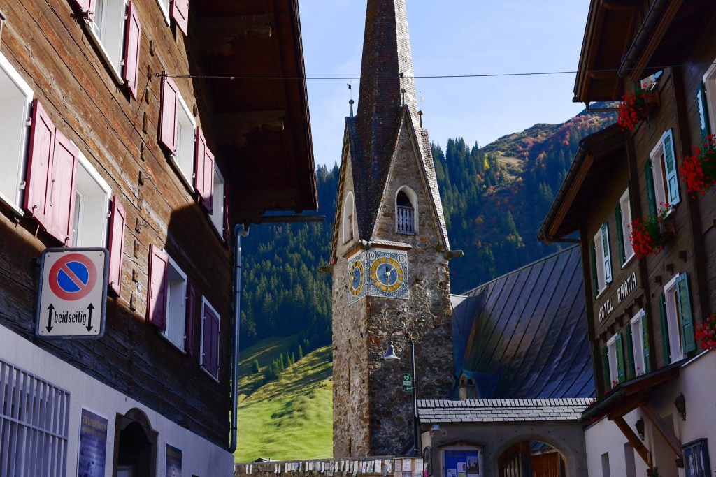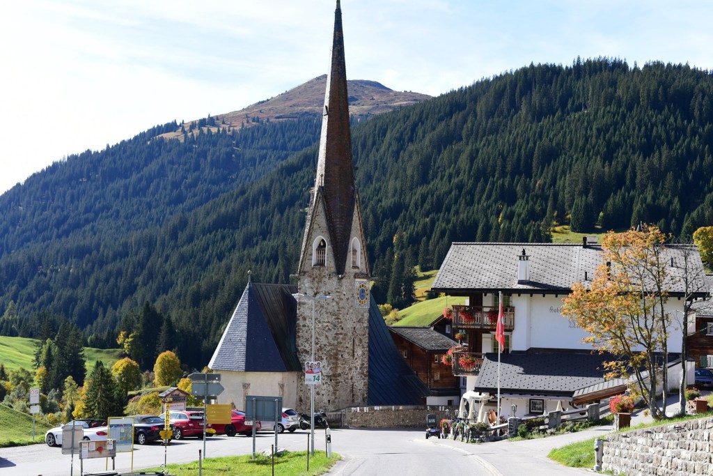 รถบัสสาย 222 จะแล่นลัดเลาะขึ้นเขา จนมาถึง เมืองเล็กๆที่น่ารัก ชื่อว่า St Antönien รถจะจอดที่นี่แล้ว วิ่งต่อจาก บริเวณนี้ไปจนถึงป้ายสุดท้ายคือ St. Antönien, Rüti (ใน App บางทีก็บอกให้เราลงต่อรถที่ St. Antönien, Rüti ) แต่ลุงหมอแนะนำให้ ลงที่ ป้าย St. Antönien, Platz ตรงใกล้ๆโบสถ์นี้ดีกว่า เพราะว่ารถ Shuttle บัสจะตั้งต้นออกจากป้าย St. Antönien, Platz นี้อยู่แล้ว ถ้าเราไปรอที่ Rüti เดี๋ยวรถ shuttle bus เกิดไม่แวะจอดรับจะลำบาก