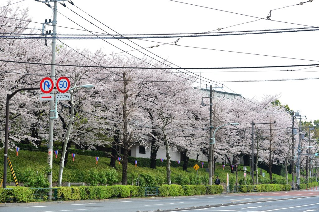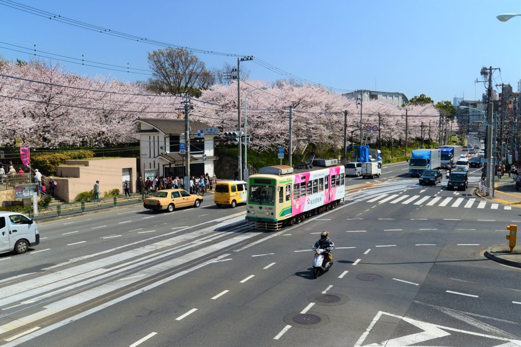 Tokyo sakura tram กำลังแล่นผ่านสวน Asukayama ที่เต็มไปด้วยต้นซากุระอยู่รอบสวน ติดกับถนนใหญ่