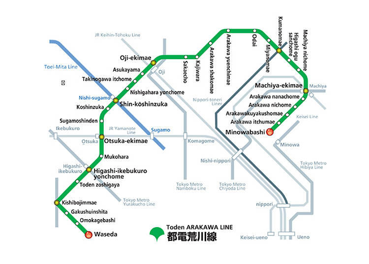 รถรางสายนี้ชื่อว่า Toden-Arakawa Line แล่นจาก Waseda station ไปถึง Minowabashi