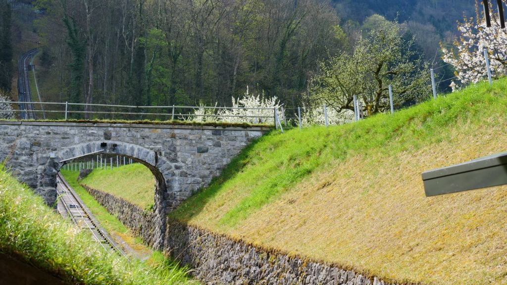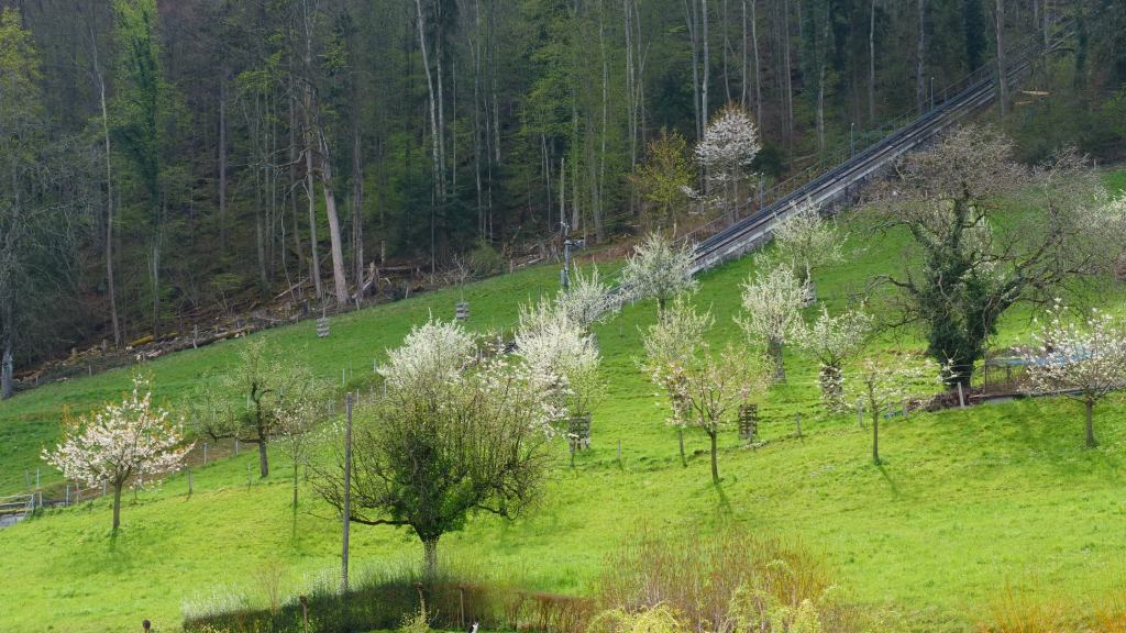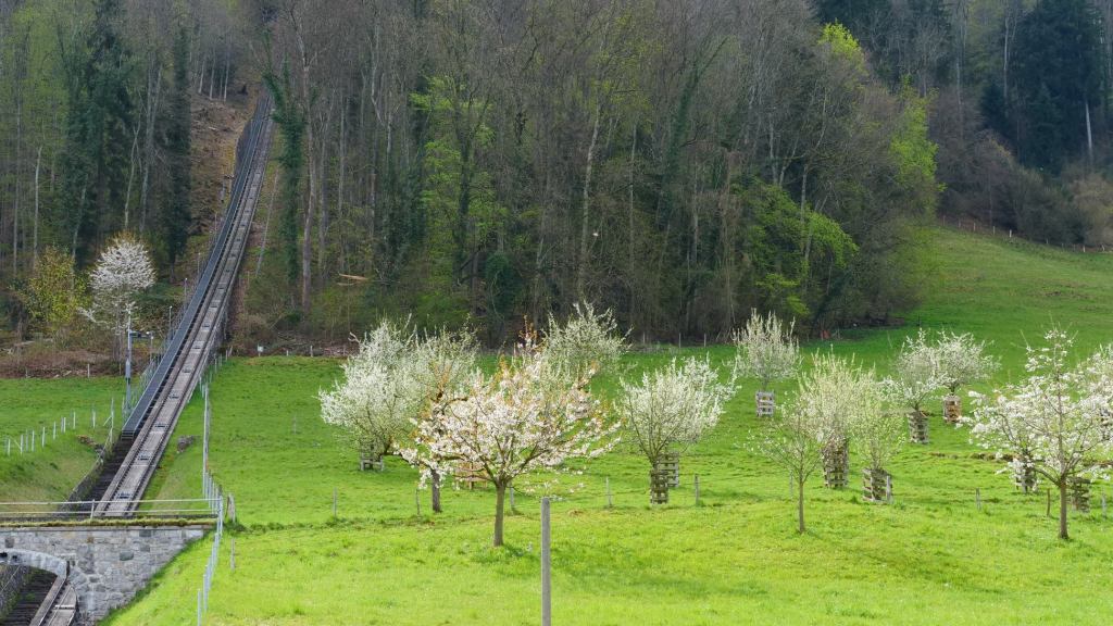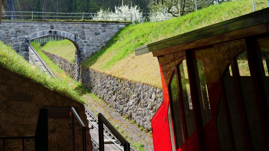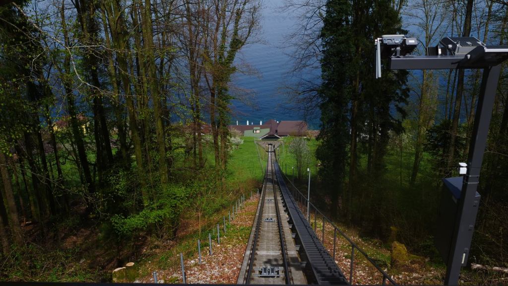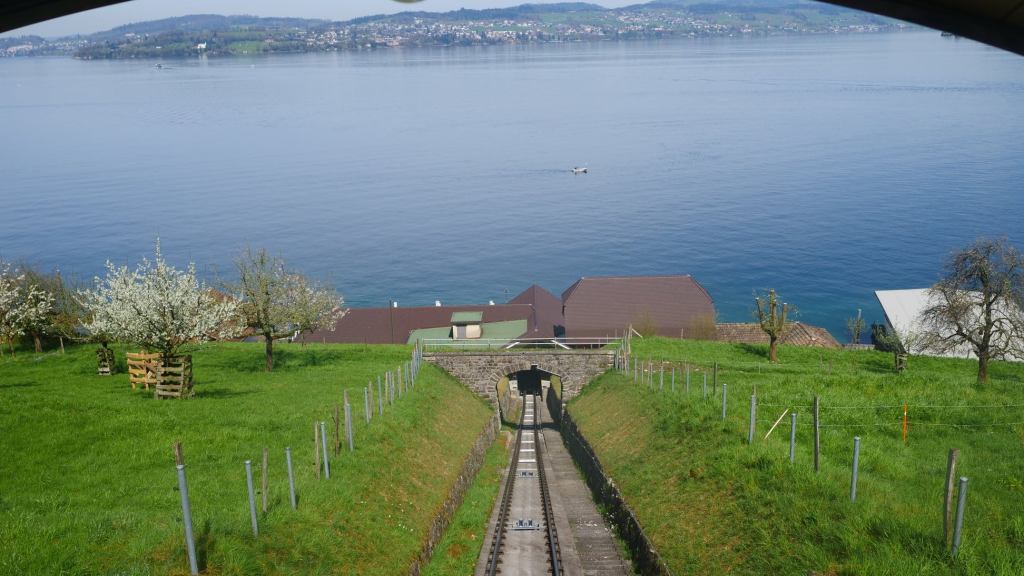 รถรางที่พาเราแล่นขึ้นไปที่รีสอร์ทใช้เวลาไม่ถึงสิบนาที ถือว่าเป็นการชมบรรยากาศทะเลสาบลูเซอร์น และต้นเชอร์รี่น้อยๆในฤดูใบไม้ผลิ