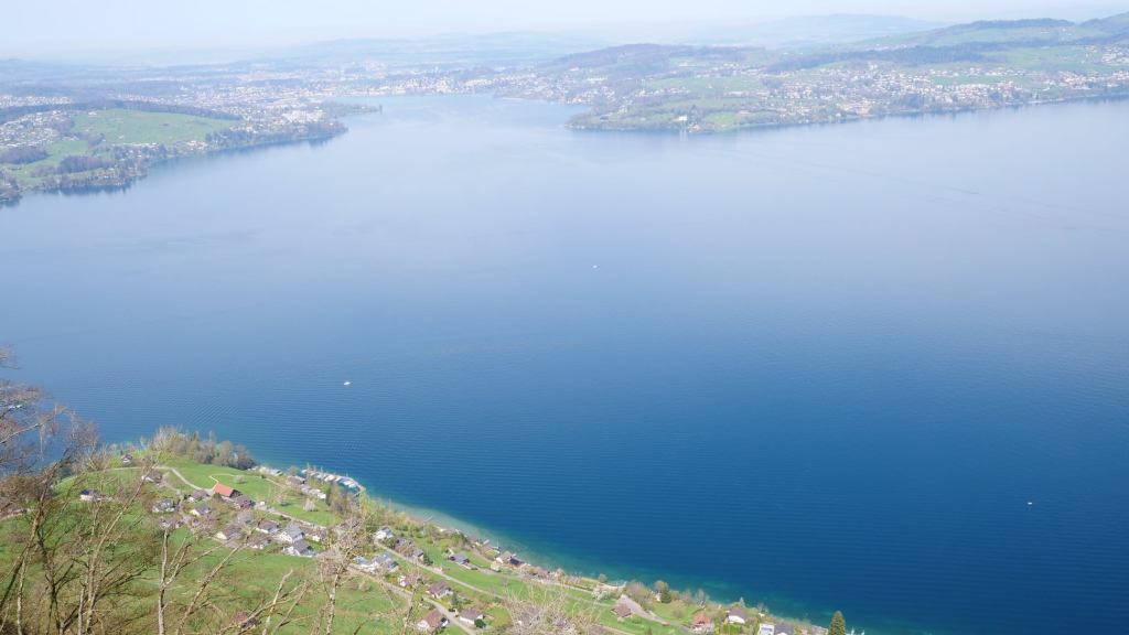 ขึ้นมาถึงโรงแรมแล้ว มองจากมุมสูงลงไปยังบ้านเรือนแถบ Kehrsiten ติดทะเลสาบ Luzern