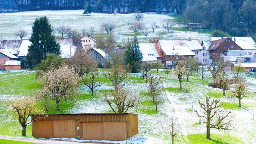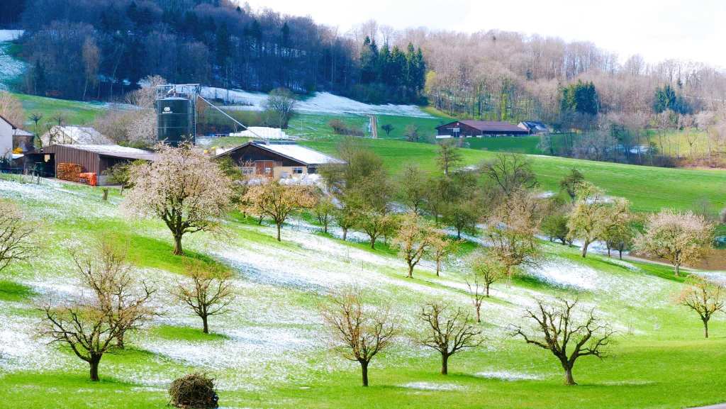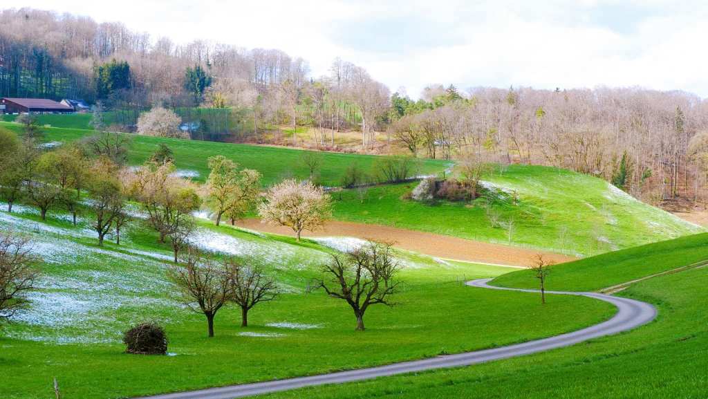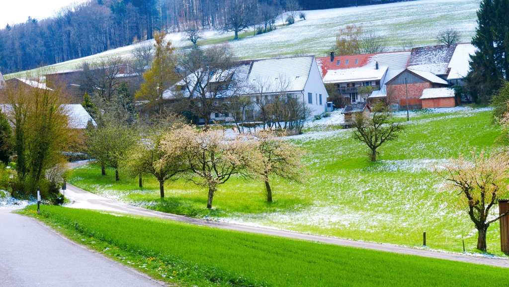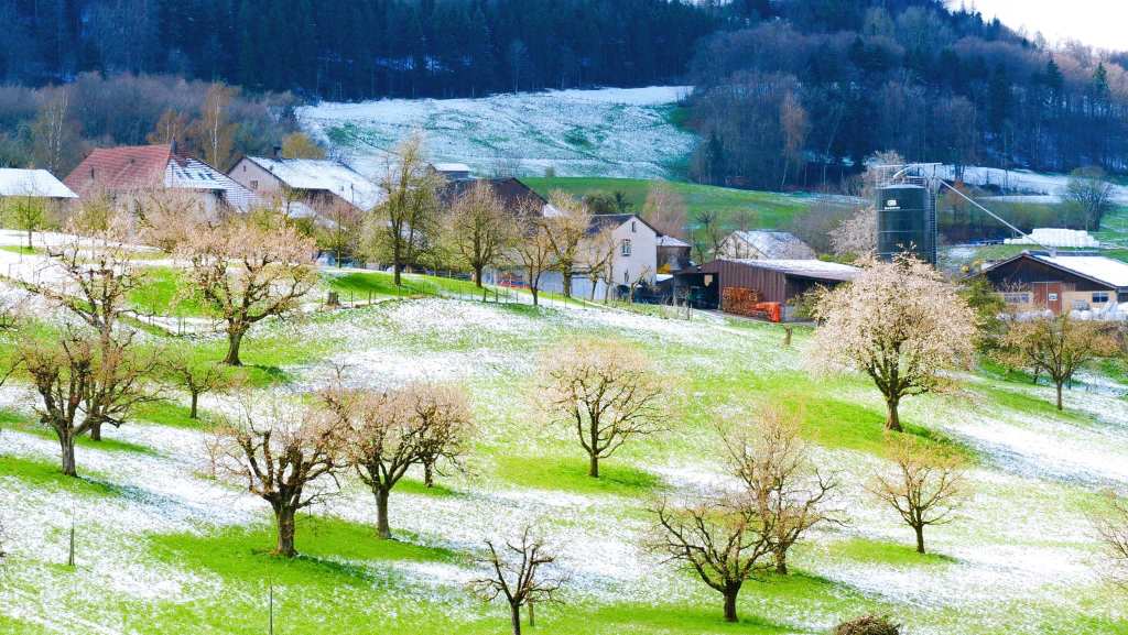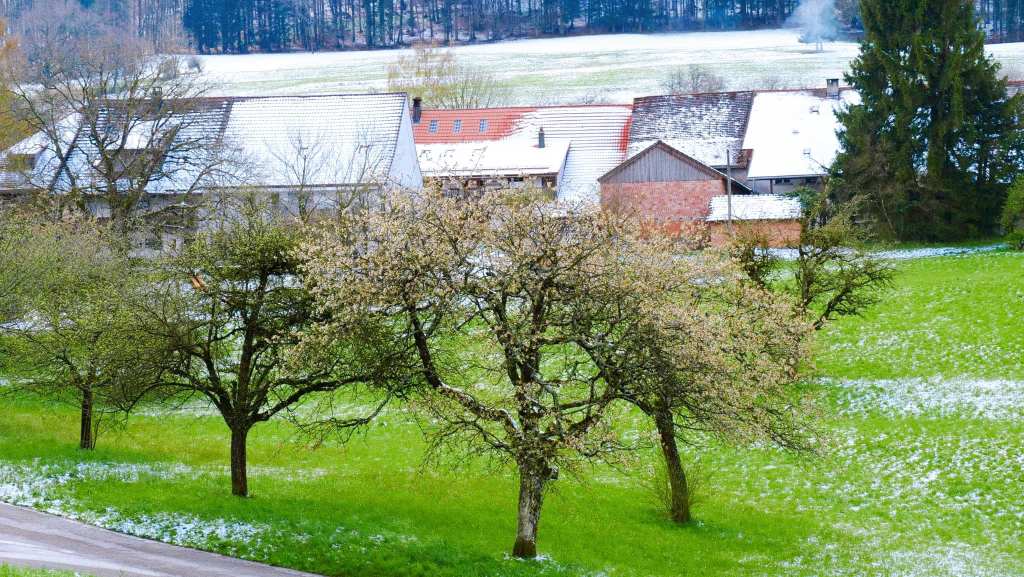 สวนเชอร์รี่หลังหมู่บ้านที่ฉันตั้งใจมาชม วันนี้ยังมีหิมะบางๆที่ตกมาลงมาเมื่อคืนโปรยอยู่บนพื้นเหมือนผงน้ำตาลไอซซิ่งโรยบนโดนัท ความจริงเชอร์รี่ได้เริ่มบานไปบางส่วนแล้วก่อนที่หิมะตกลงมา นี่คือความแปรปรวนในช่วงรอยต่อของฤดูกาลจากฤดูหนาวไปยังฤดูใบไม้ผลิ
