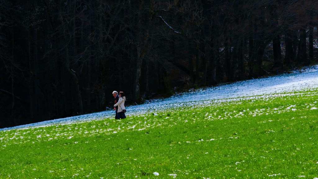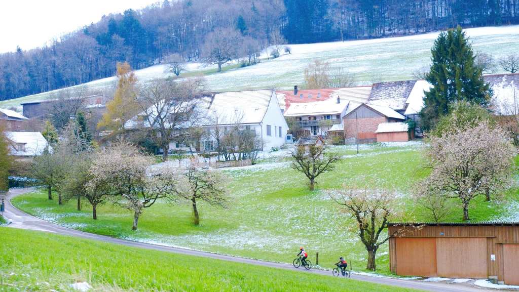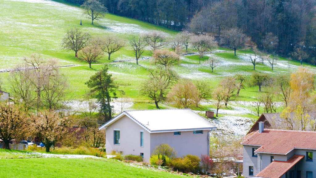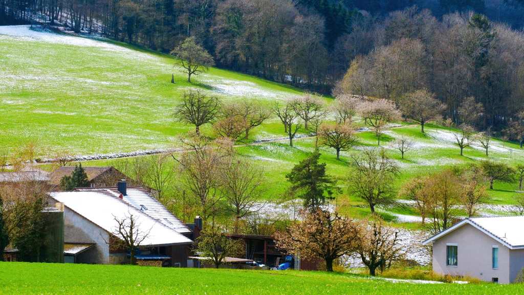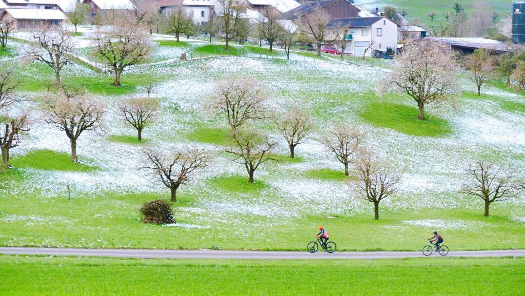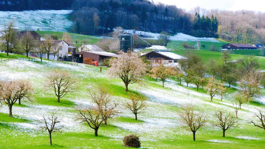 สวนเชอร์รี่หลังหมู่บ้านที่ฉันตั้งใจมาชม วันนี้ยังมีหิมะบางๆที่ตกมาลงมาเมื่อคืนโปรยอยู่บนพื้นเหมือนผงน้ำตาลไอซซิ่งโรยบนโดนัท ความจริงเชอร์รี่ได้เริ่มบานไปบางส่วนแล้วก่อนที่หิมะตกลงมา นี่คือความแปรปรวนในช่วงรอยต่อของฤดูกาลจากฤดูหนาวไปยังฤดูใบไม้ผลิ