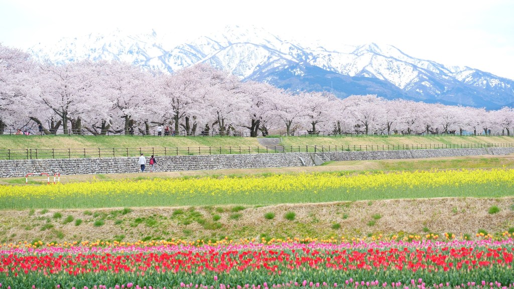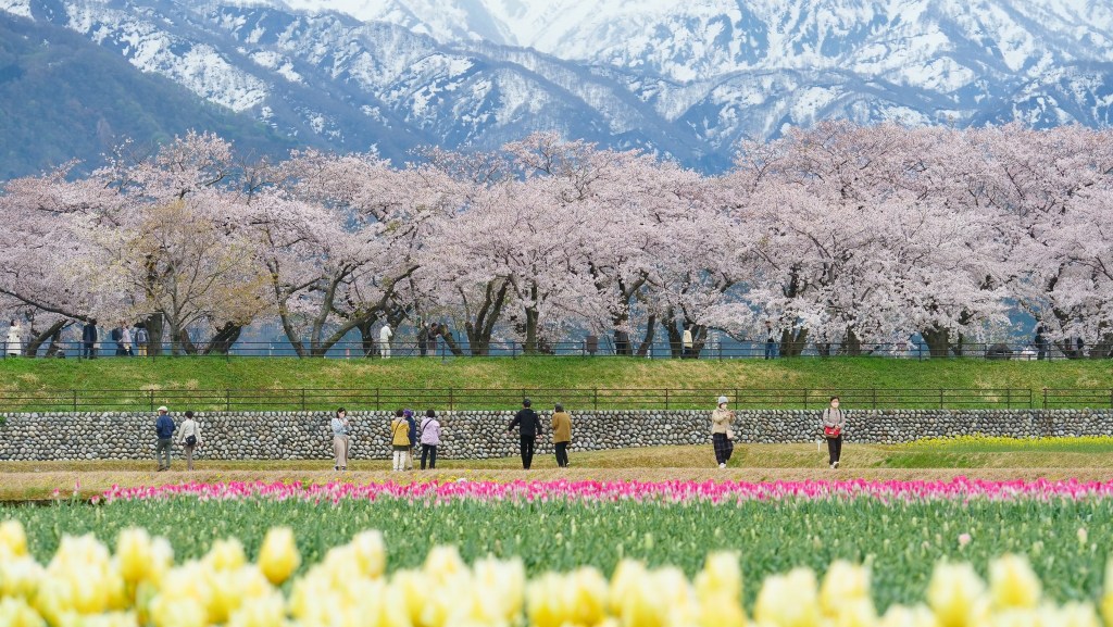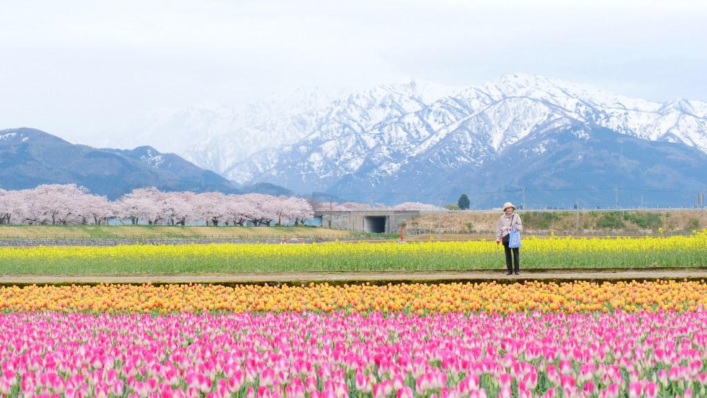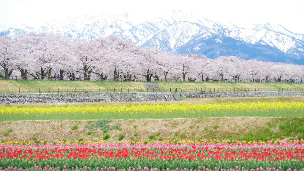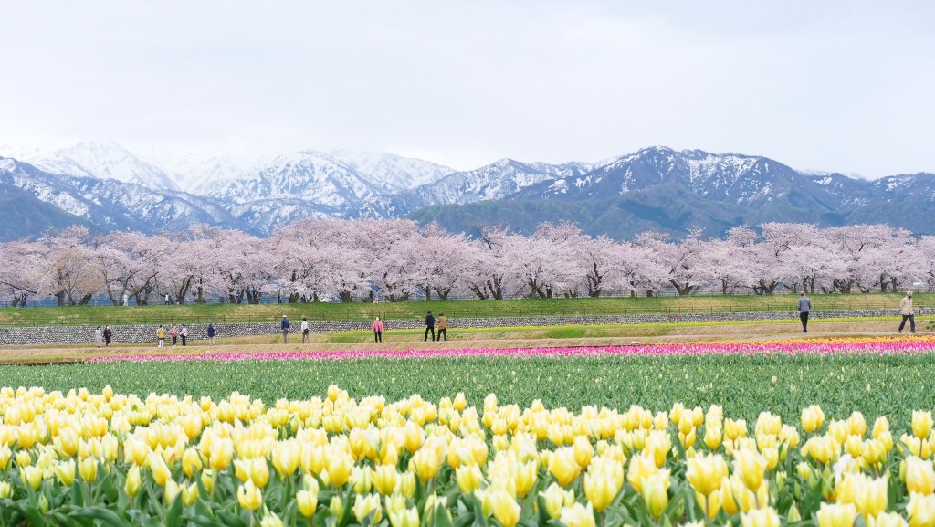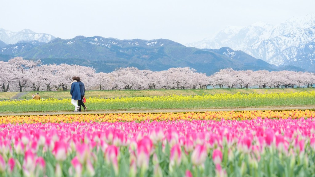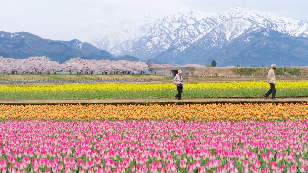 Asahi Spring Quartet คือช่วงเวลาพิเศษที่ 4 อย่าง มาบรรจบกัน นั่นคือยอดเขา Japan Alps ที่ปกคลุมด้วยสีขาวของหิมะในปลายฤดูหนาว สีชมพูของซากุระ นาโนฮานะ (rapeseed flowers) สีเหลืองซึ่งอยู่ถัดลงมา และทิวลิปหลากหลายสีสัน เป็นงานเทศกาลดอกไม้ของเมือง Asahi,Toyama ที่จัดขึ้นเป็นประจำทุกปีในฤดูใบไม้ผลิ