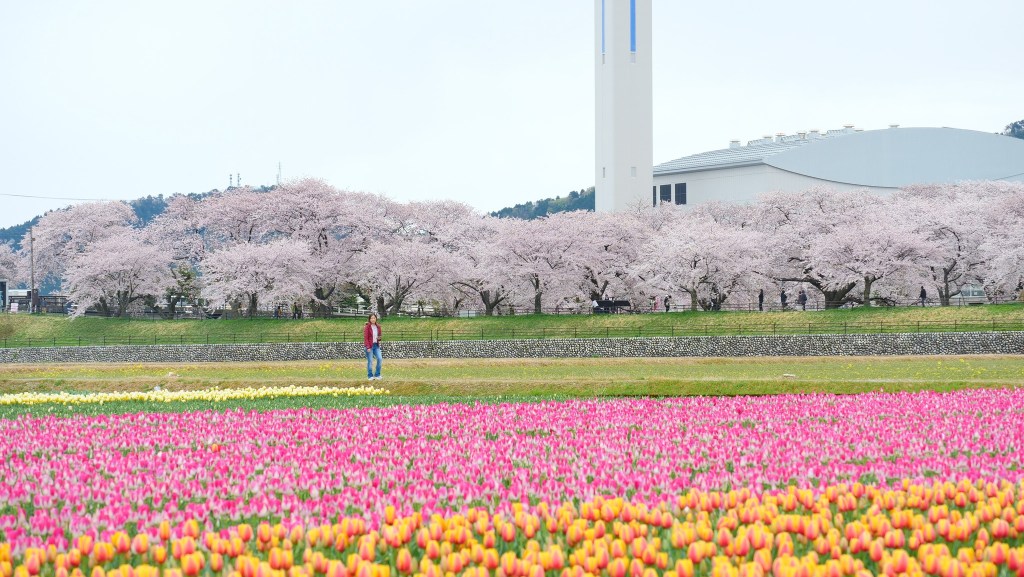 ผู้คนที่เดินทางมาถึง ก็จะใช้เวลาถ่ายรูปที่สวน Tulips ด้านล่าง หลังจากนั้นก็จะเดินขึ้นไปชมซากุระ ซึ่งปลูกไว้ริมคันคลอง Funakawa