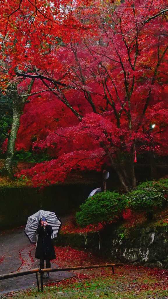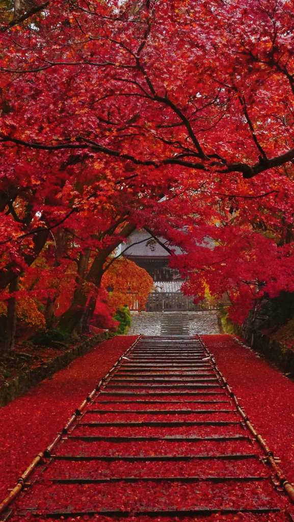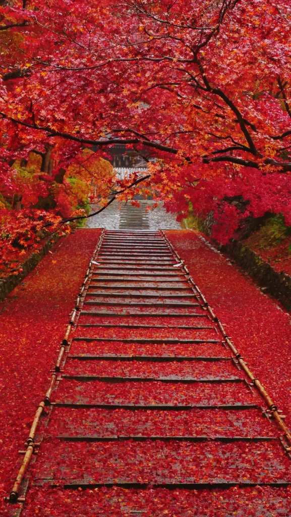 ความสวยงามของใบไม้ที่วัด Bishamondo ก็ยังคงไม่เสื่อมคลาย ซึ่งใครที่อยากเห็นพรมแดงตรงขึ้นบันไดสวยๆ ก็ต้องเลือกวันมาชมให้เหมาะเจาะ โดยต้องเป็นช่วงเวลาปลายเดือน พย. ประมาณสัปดาห์ที่สาม และถ้าให้ดีควรเป็นรุ่งเช้าตรู่หลังคืนที่มีฝนตก ใบไม้ก็จะร่วงลงมาปูเป็นพรมสีแดงอยู่ที่พื้น