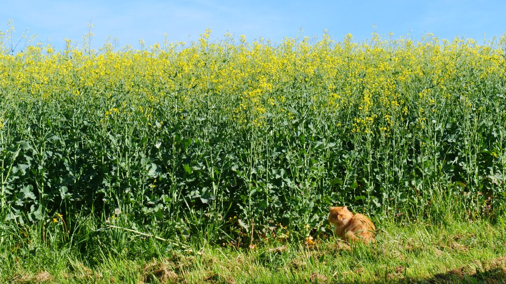 พอก้าวท้าวลงจากรถบัสอย่างคุ้นเคย แมวสีส้มขนยาวที่อยู่ตรงบ้านใกล้ทางเข้าหมู่บ้าน วิ่งหลบเข้าไปที่แปลง Canola สีหน้ากังวลใจ