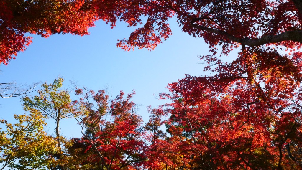 ลมที่พัดแรงบนเขา พาเอาใบเมเปิลสีแดงลงมากองเป็นพรมสีแดงบนพื้น แต่ช่วงเวลาที่ใบไม้สวยงามอยู่บนต้นนั้นมีให้ชมยาวนานกว่าซากุระ