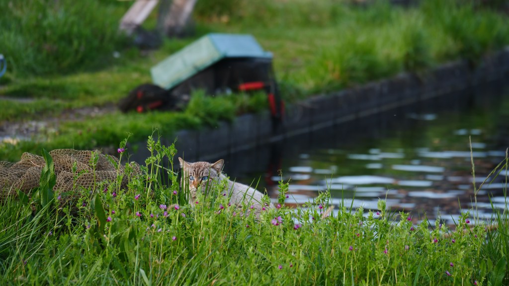 หลังหมู่บ้าน จะมีบ่ออนุบาลปลาเทราท์อยู่ ฉันเคยมาเจอแมวที่นี่หลายตัวช่วงฤดูใบไม้ร่วง แต่มารอบนี้ รอจนแดดร่ม ลมตกแล้วก็ยังไม่เห็นแมวออกมาสักตัว ว่าจะถอดใจกลับ Kyoto แล้ว เพราะเป็นวันเดินทางวันแรก แค่ฝากกระเป๋ากับโรงแรมไว้ ยังไม่ได้ เชคอิน
